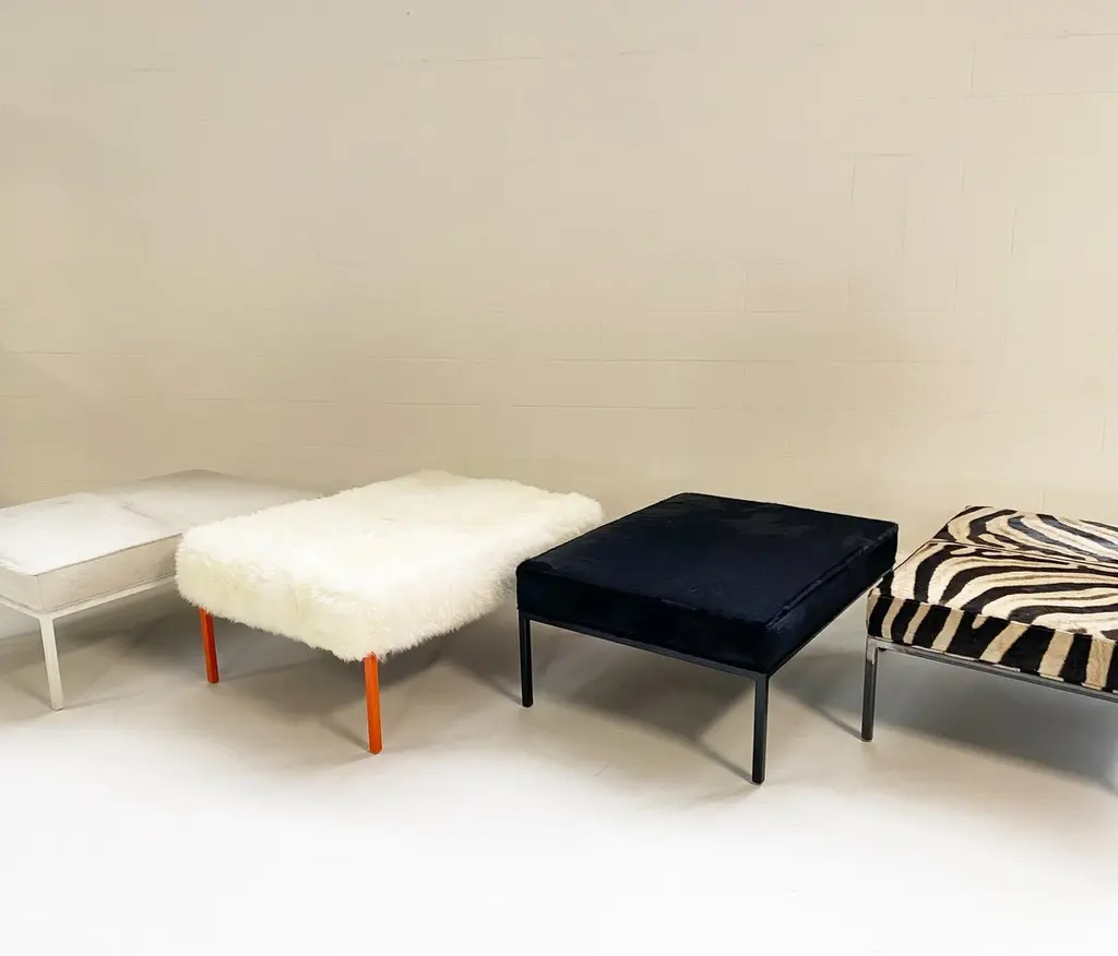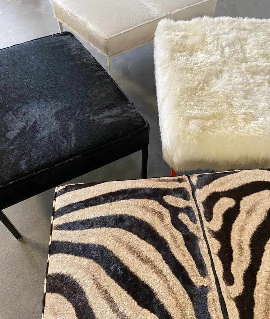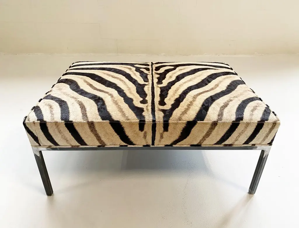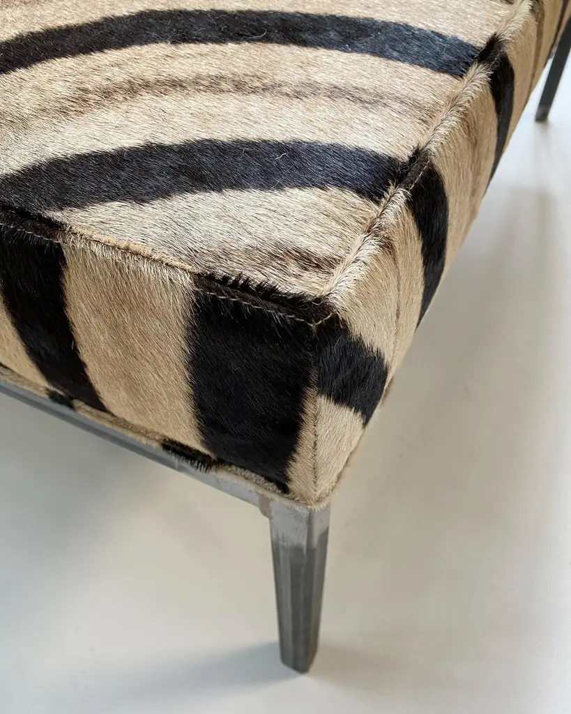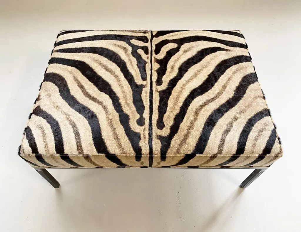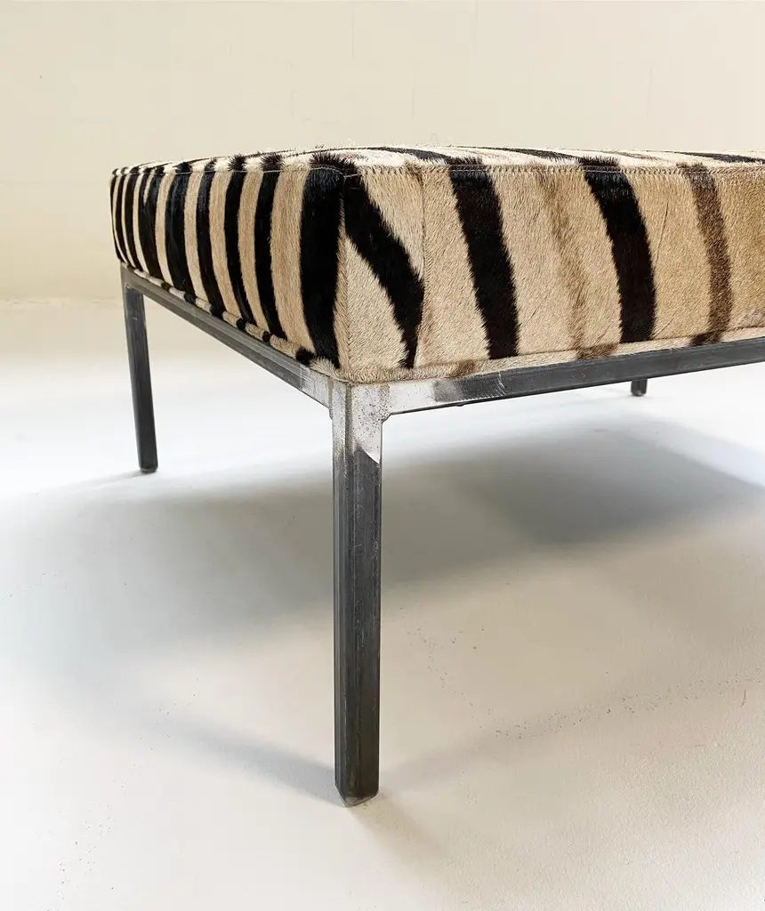A new addition to our Originals collection. This bespoke ottoman is perfect for a variety of uses, ottoman, coffee table, bench at the end of a bed, etc. Handmade by our master welder and our dedicated upholstery team, the welded steel legs are the perfect base to any of our upholstery choices, cowhide, zebra hide, sheepskin, or fabric. This ottoman is infinitely customizable. We can powder coat the legs to black, white, or keep the natural, unfinished metal (as seen in the zebra example) and the fabric or hide upholstery choices are endless.Lead time: Please allow 11 - 12 weeks.