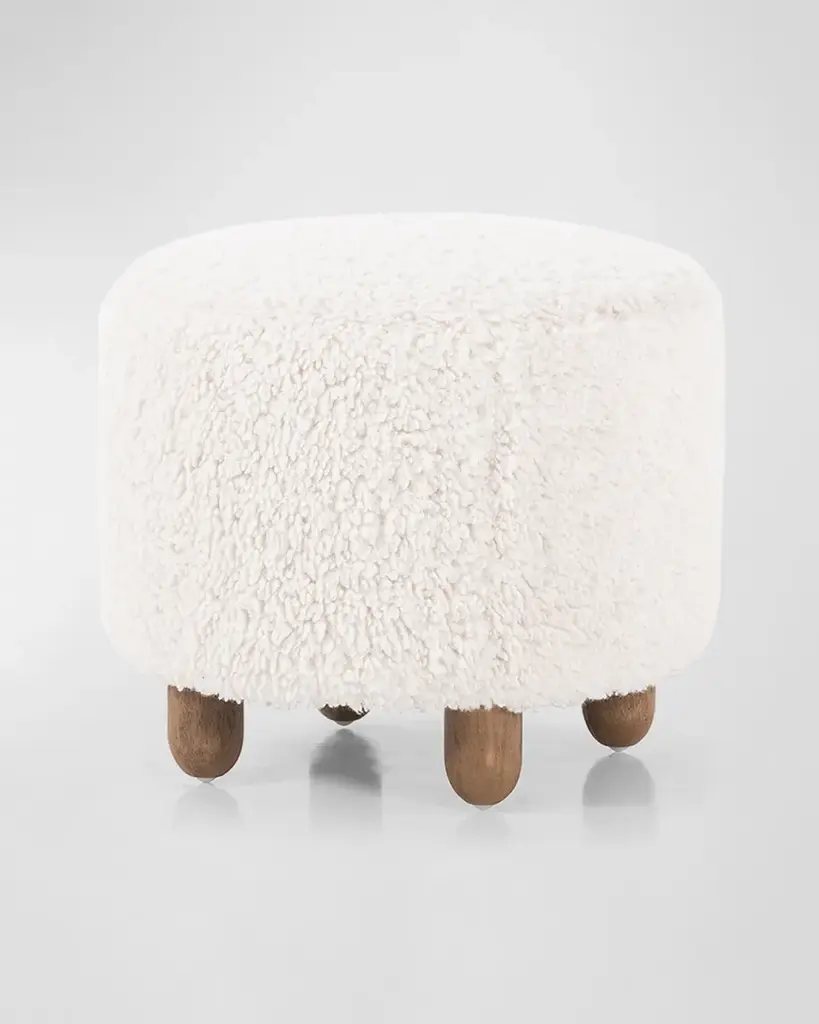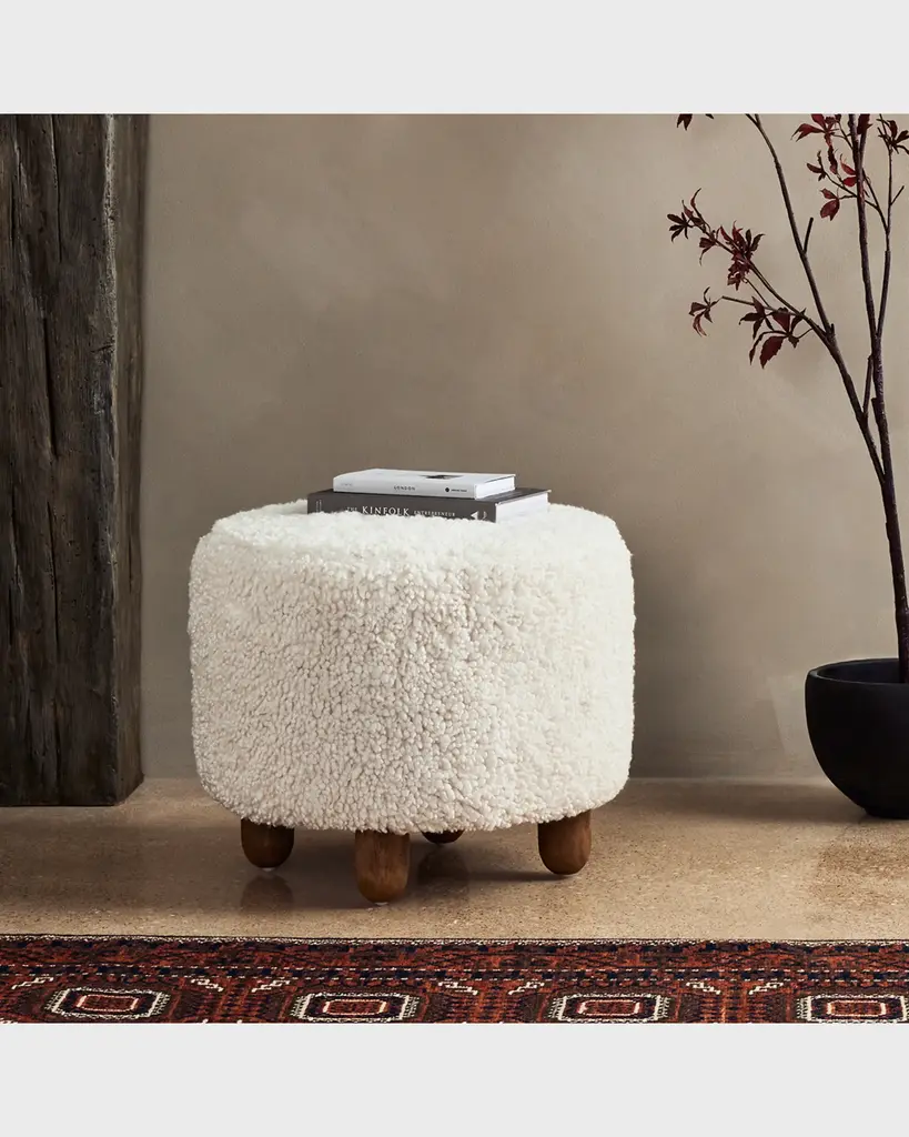 Place this round ottoman just about anywhere for a subtle retro vibe. Upholstered in a faux Mongolian shearling (polyester) with a high pile fur. Parawood legs are wirebrushed for a warm, vintage-style feel. Overall, approx. 22.5"Dia x 20.5"T Sold individually Imported Weight, 17.5lbs Boxed weight, approximately 22.7lbs Shipping Direct from Vendor, usually ships within 150 business days. About Four Hands: Four Hands is a dynamic lifestyle brand that offers a diverse range of furniture and home decor items. With a focus on innovative design and quality craftsmanship, Four Hands creates pieces that blend modern aesthetics with traditional craftsmanship. From stylish sofas and chairs to unique accent pieces and accessories, each product is thoughtfully designed to inspire and elevate any living space. With a commitment to sustainability and ethical practices, Four Hands is dedicated to creating beautiful, functional, and responsibly made products for the modern home.