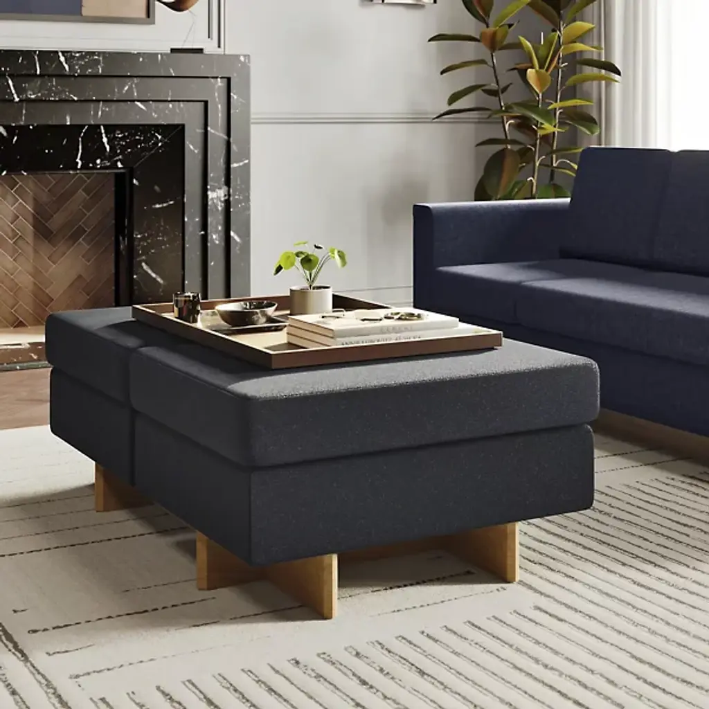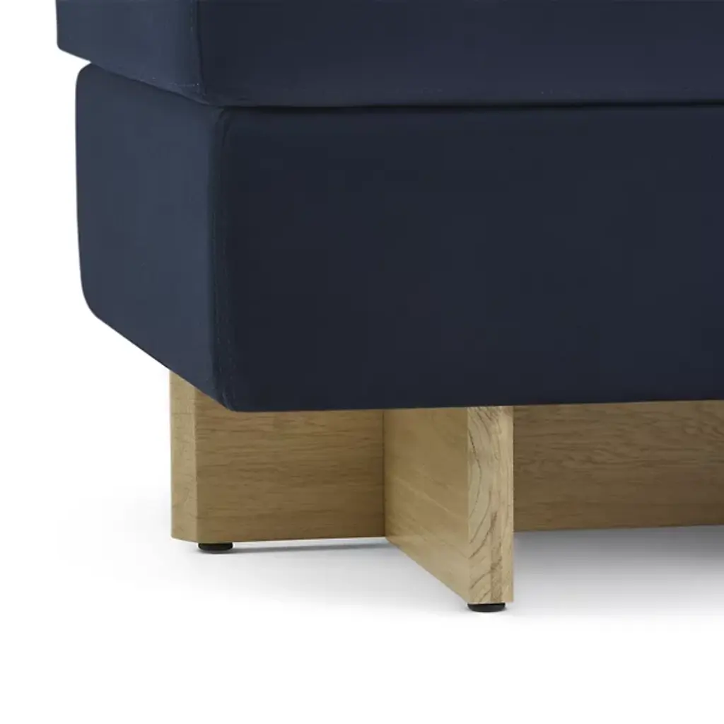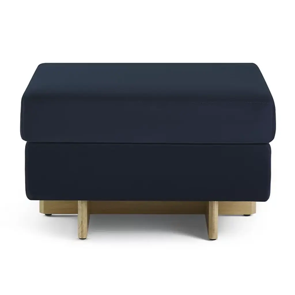 The Frank Lloyd Wright Galesburg Ottoman from Steelcase matches Mid-Century Modern design with contemporary elegance. The natural oak crosshatch base supports a sturdy wooden frame, adding natural warmth to an otherwise direct design according to Wright's "Usonian" Design principles, focusing on scaled-down forms and accessible materials, drawing on his Tuxedo Sofa for inspiration. It's topped with soft cushions and upholstered with tailored fabric around meticulously finished corners. Wright's signature geometric shapes are enriched by organic details, with folded planes and linear accents adding texture and depth to the minimalist form, creating a cohesive and sophisticated piece with a deceptively simple appearance.