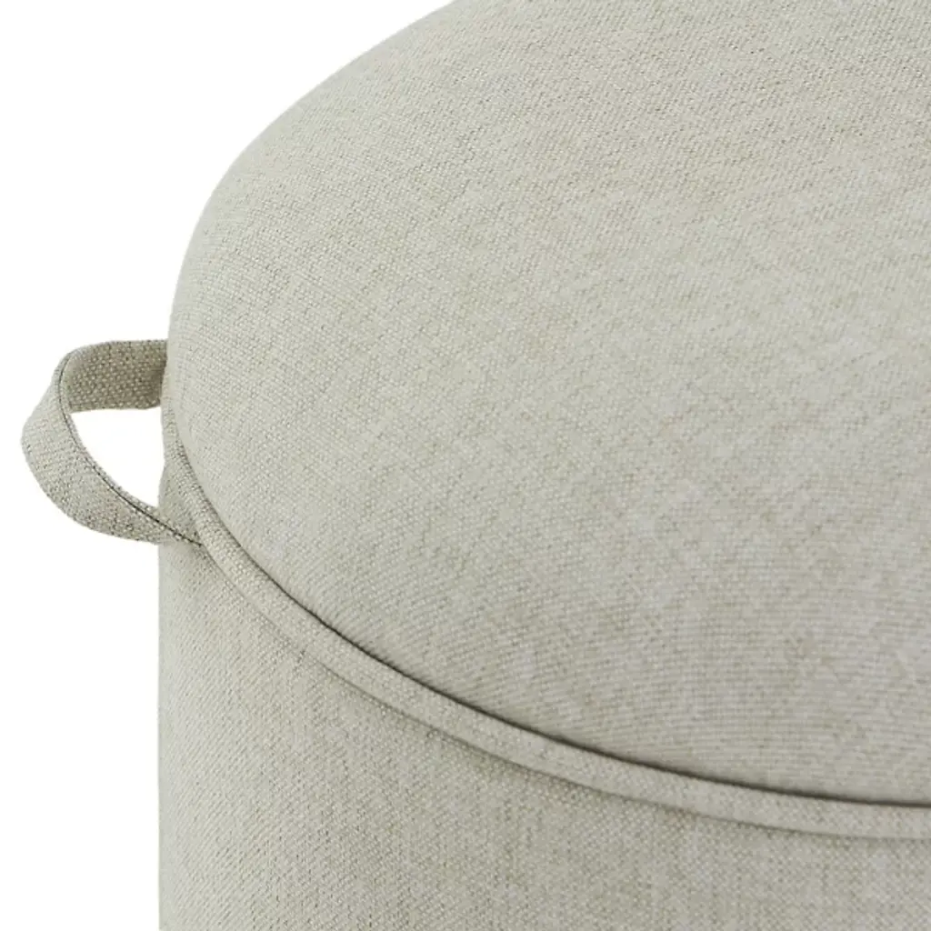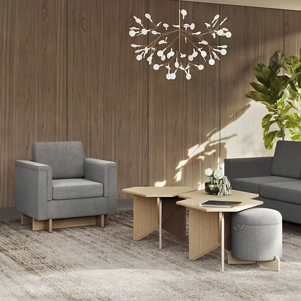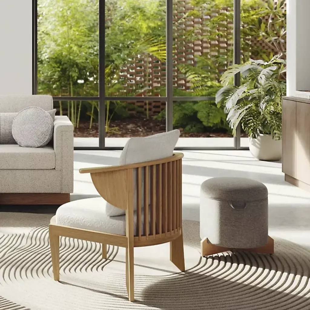 The Frank Lloyd Wright Rockford Ottoman from Steelcase embodies a sleek, expressive design with a modern edge. Echoing Wright's "Usonian" architectural philosophy, it emphasizes simple geometric shapes and easy accessibility. The angular wooden base juxtaposes the cylindrical cushion, upholstered in an ivory acrylic and polyester blend for a subtle softness. The Rockford collection draws inspiration from Wright's Rockford House, originally designed to be wheelchair accessible for a disabled veteran. Each piece features clean lines and thoughtful design, ensuring ease of passage and usability, and its sophisticated upholstery complements the smooth wooden frame, highlighting the wood's natural beauty and the unique grain of each piece.