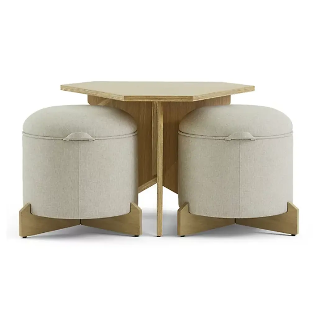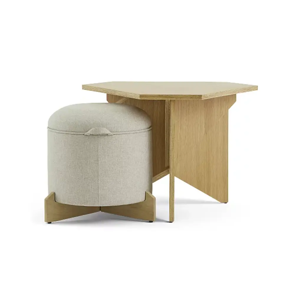 The Frank Lloyd Wright Rockford Ottoman from Steelcase embodies a sleek, expressive design with a modern edge. Echoing Wright's "Usonian" architectural philosophy, it emphasizes simple geometric shapes and easy accessibility. The angular wooden base juxtaposes the cylindrical cushion, upholstered in an ivory acrylic and polyester blend for a subtle softness. The Rockford collection draws inspiration from Wright's Rockford House, originally designed to be wheelchair accessible for a disabled veteran. Each piece features clean lines and thoughtful design, ensuring ease of passage and usability, and its sophisticated upholstery complements the smooth wooden frame, highlighting the wood's natural beauty and the unique grain of each piece.