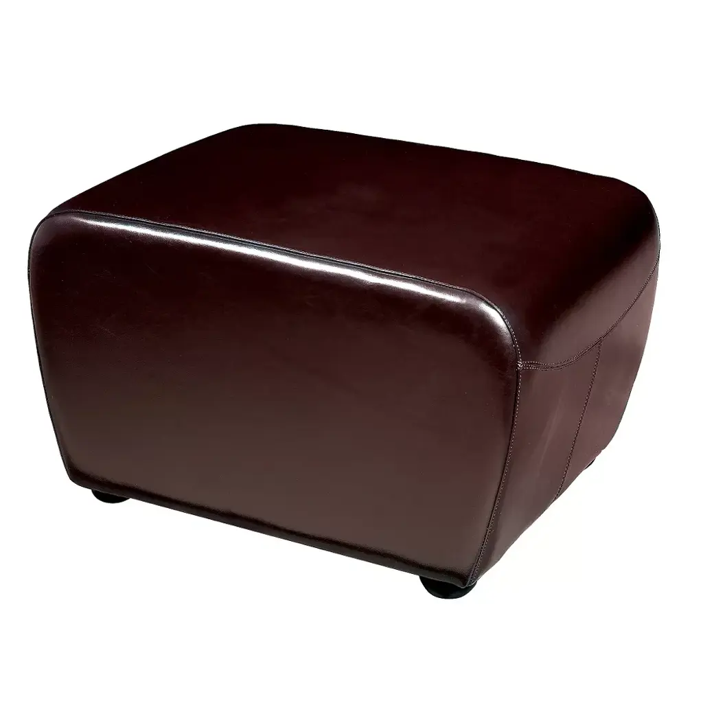 Take deep espresso brown bycast leather and pair it with a smooth-edged design with tapered sides and the result is this practical mid-sized ottoman. It includes round black wooden legs, which feature non-marking feet for protection of harder flooring. Padding underneath the leather makes this a comfortable leather option for a footstool as well as for additional seating. 29" (W) x 21" (D) x 18" (H)