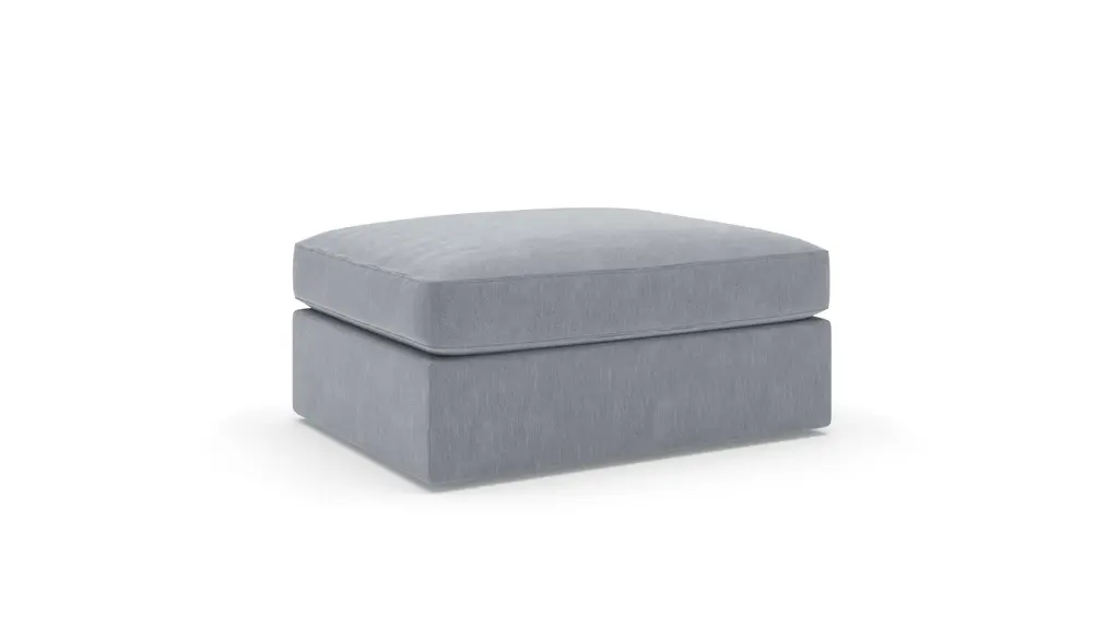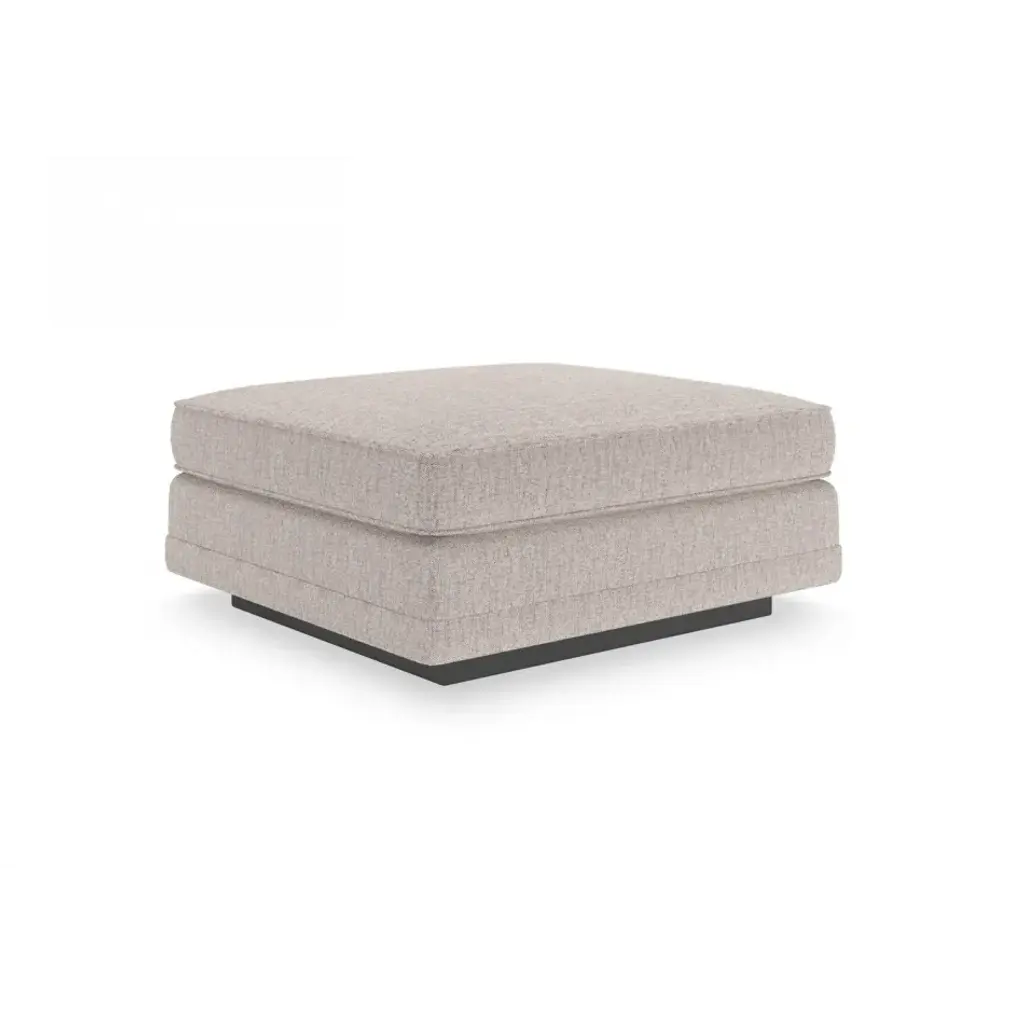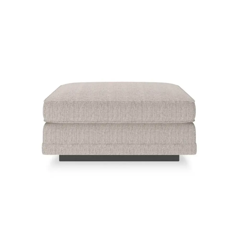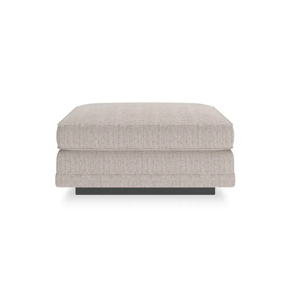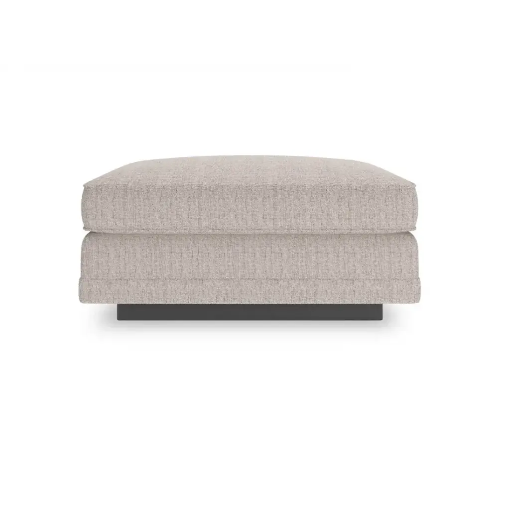 Casually elegant, this fully upholstered ottoman is designed to complement the Modern Fusion sectional. Perfectly sized, it’s tailored to perfection in an Oatmeal woven slub. A recessed wood plinth base in Simply Black completes this piece’s distinctive aesthetic style.