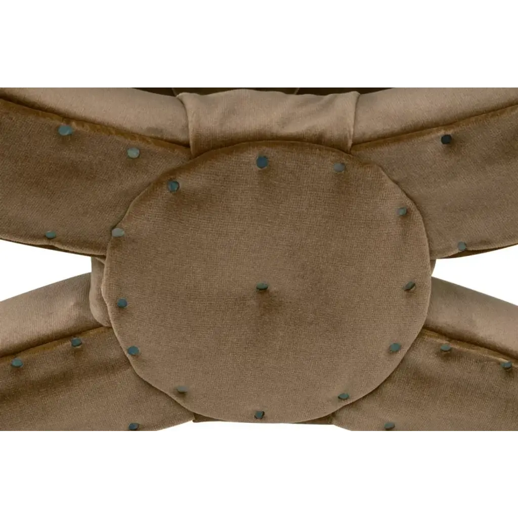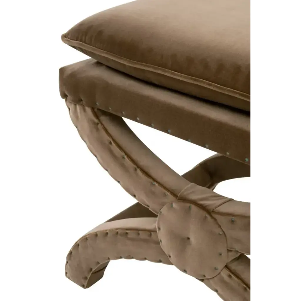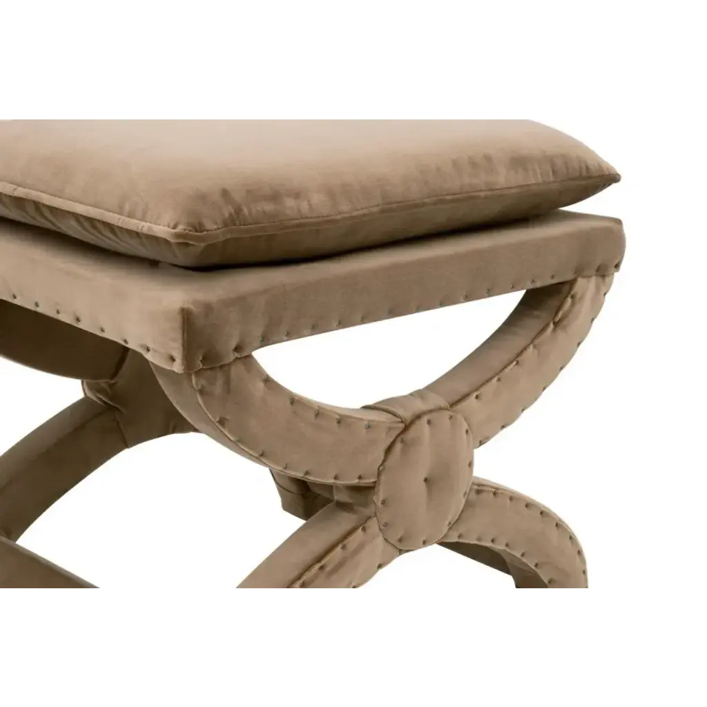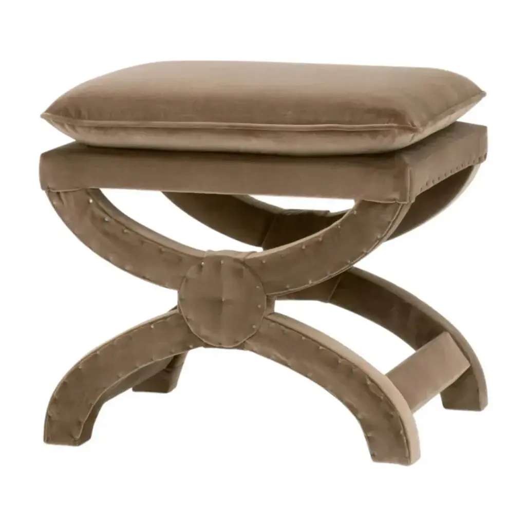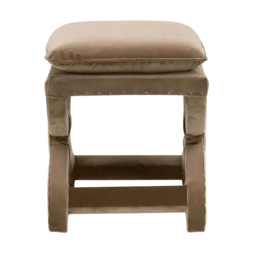 This useful Gaston Ottoman by Essentials For Living is the epitome of casual, yet sophisticated. It measures 22.5†wide, 17.5†deep, and 21†high. Its lightweight and small stature make it easy to maneuver from space to space. Use as additional seating, serving space, or accent seating. It's easy to store away, slide under furniture, or complement other furniture pieces. It is upholstered in a rich and luxurious caramel velvet. The velvet material adds sophistication to the relaxed and simple design. The “X†base design has black nail tack detailing that outlines the base. The fixed seat cushion is designed like a pillow top. This versatile little ottoman will be a great addition to any living space where additional seating is desired.
