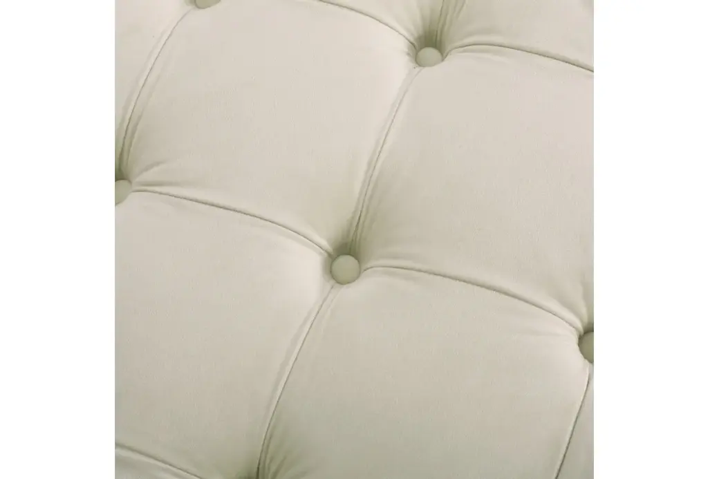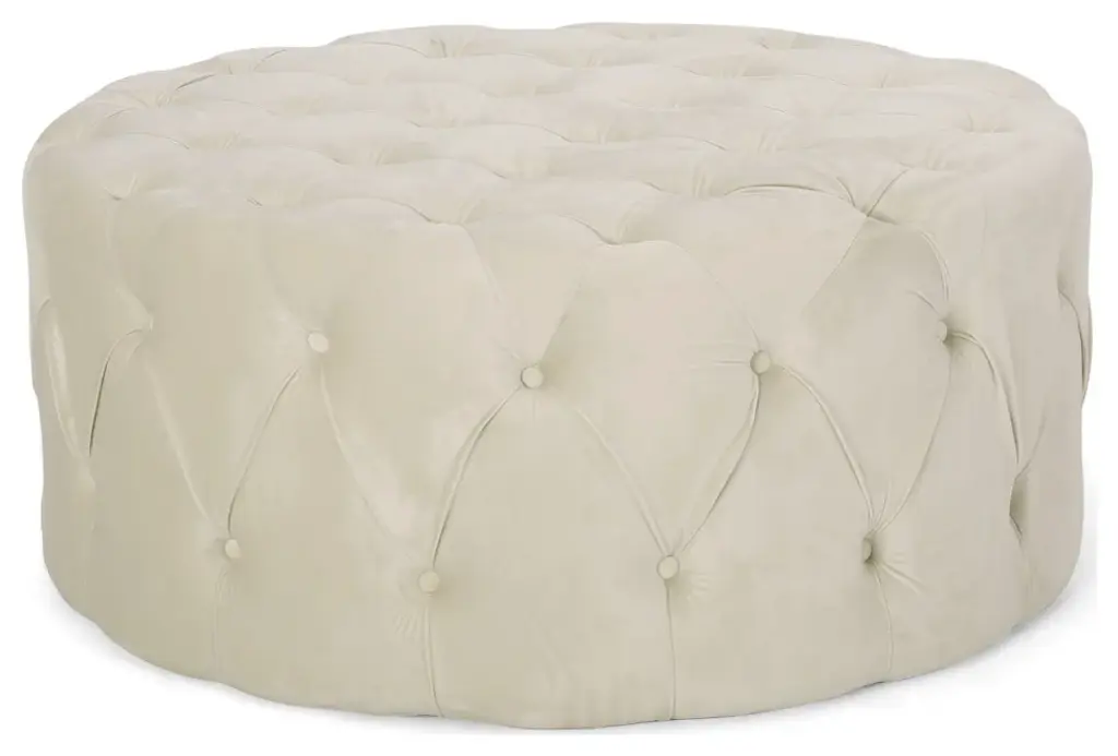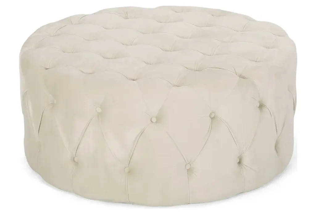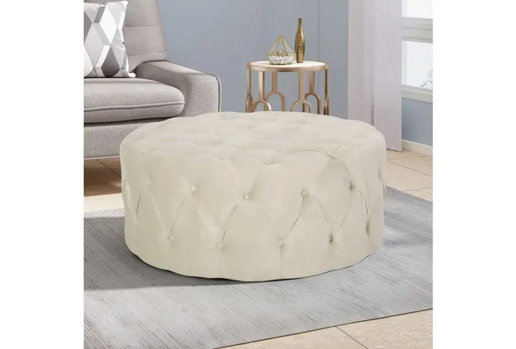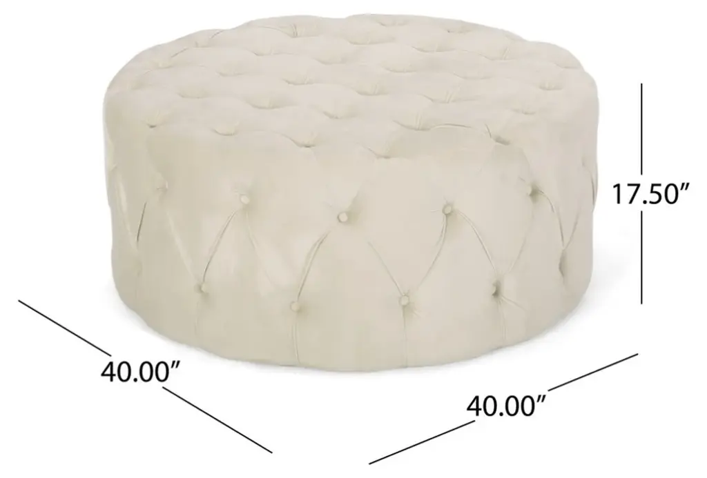 Round out your interior space with a multi-functional ottoman that offers stunning aesthetics for your home. Featuring smooth velvet upholstery and button-tufted diamond stitching, this ottoman is a guaranteed win in any room. This ottoman offers a variety of versatile functions including extra seating for that unexpected guest or acting as a coffee table to hold a tray of snacks. Finished with a brilliant, jewel-like color, our ottoman offers a modern glam touch that easily enhances your decor in both convenience and style.MODERN GLAM: Our ottoman showcases soft textures and jewel-like colors that pair seamlessly with gracefully curved lines for a luxurious modern glam look. Complemented with deep tufting and minimalistic structure, this ottoman brings a sleek touch to any decor.BUTTON TUFTED DIAMOND STITCH: The button-tufted stitching offers an extra touch of sophistication that enhances its contemporary design. The diamond stitch pattern adds a bit of texture without sacrificing any comfort.VELVET: Our velvet is 100% polyester, featuring a featherlike softness and unique sheen. With a built-in resistance to wrinkles and outstanding durability, this velvet is hands down the best option amongst velvets.VERSATILE: Whether this is used as a cocktail ottoman, casual seating, a coffee table, or purely for decorative purposes this piece can be used in a multitude of ways. Designed to match any room of your home, this ottoman will blend seamlessly with your existing decor.OVERSIZED: Choose an accessory that is the perfect size for you and your furniture. This ottoman is 40.00" W x 40.00" D x 17.50" H. You will love how much your space can transform with the simple addition of this charming ottoman.Includes: One (1) OttomanMaterial: VelvetVelvet Composition: 100% PolyesterColor: BeigeHand-Crafted DetailsNo Assembly RequiredDimensions: 40.00 inches deep x 40.00 inches wide x 17.50 inches high