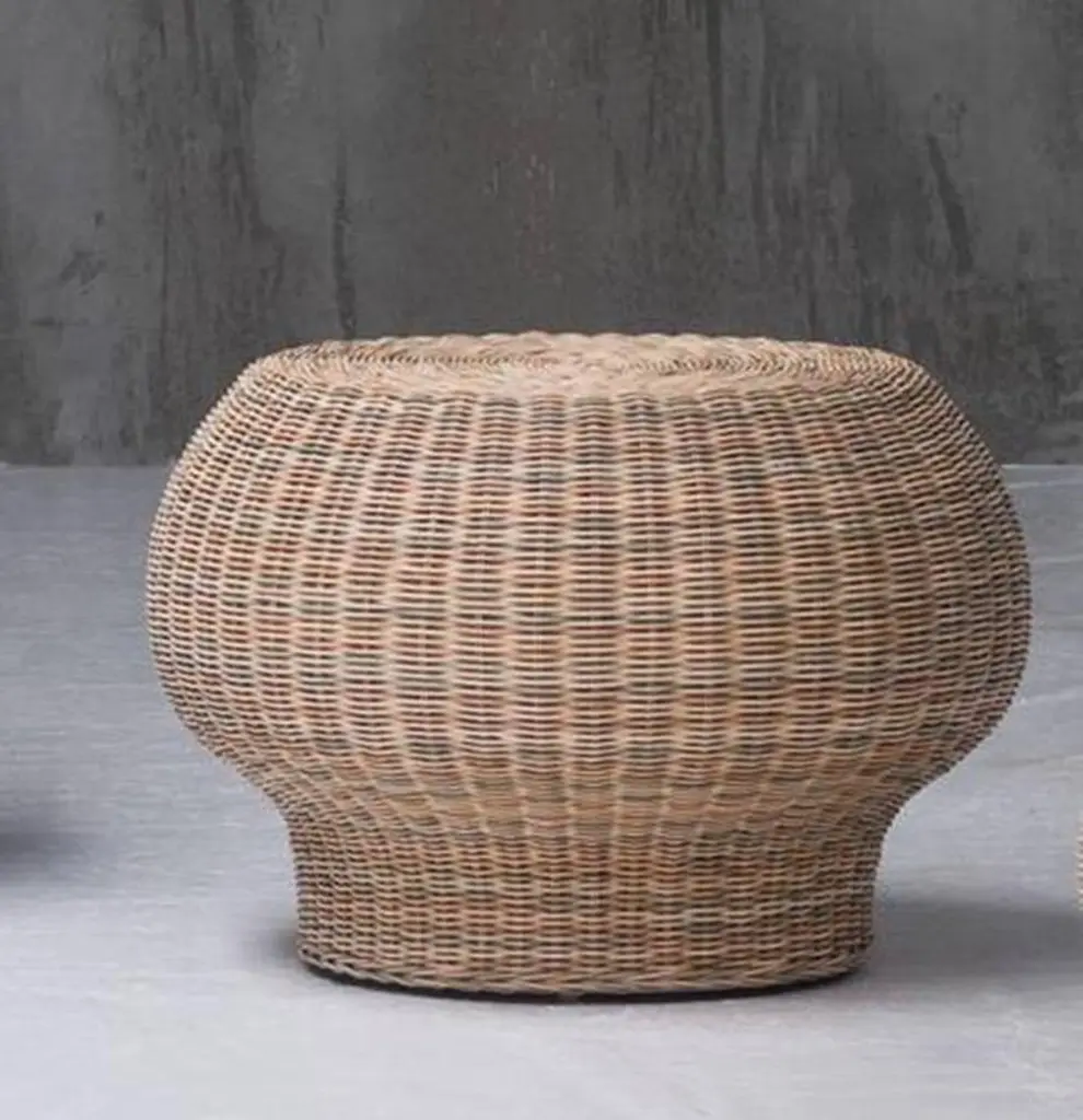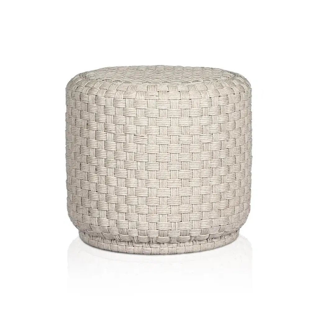 Family of small pouf-tables made entirely of natural mélange woven wicker or lacquered in matt white, grey, black, ocean or dove-grey, characterised by a low and rounded shape with full volumes and a skilful play of workmanship, shapes and colours. This product stands out thanks to the beauty of the natural fibre weave combined with an original design, giving it character and uniqueness. Side table / ottoman in natural melange rattan core. Additional Information:Material: RattanFinish: Natural melange rattan coreDimension: Ø 60 x 40 H cmAvailable in other finish options: Matt white, grey, air force blue, black lacqueredAvailable in other size option: Large