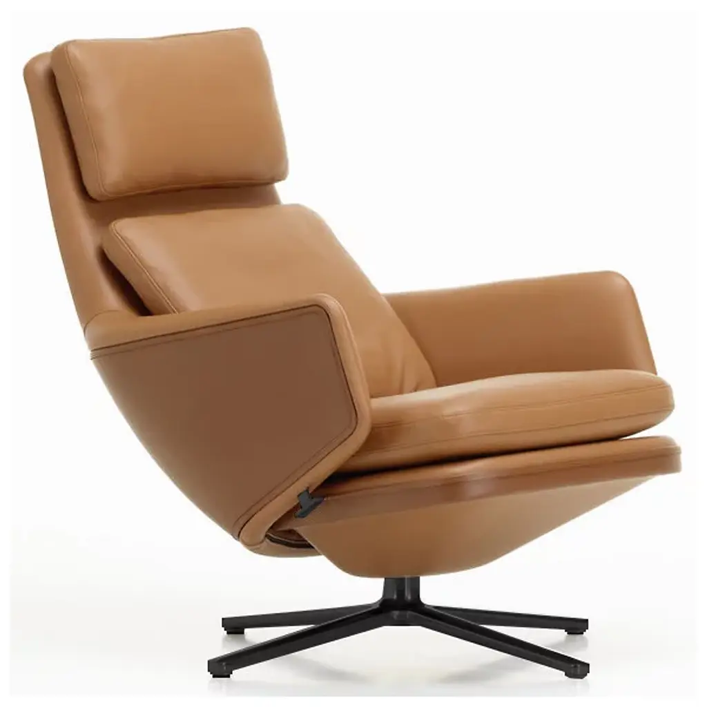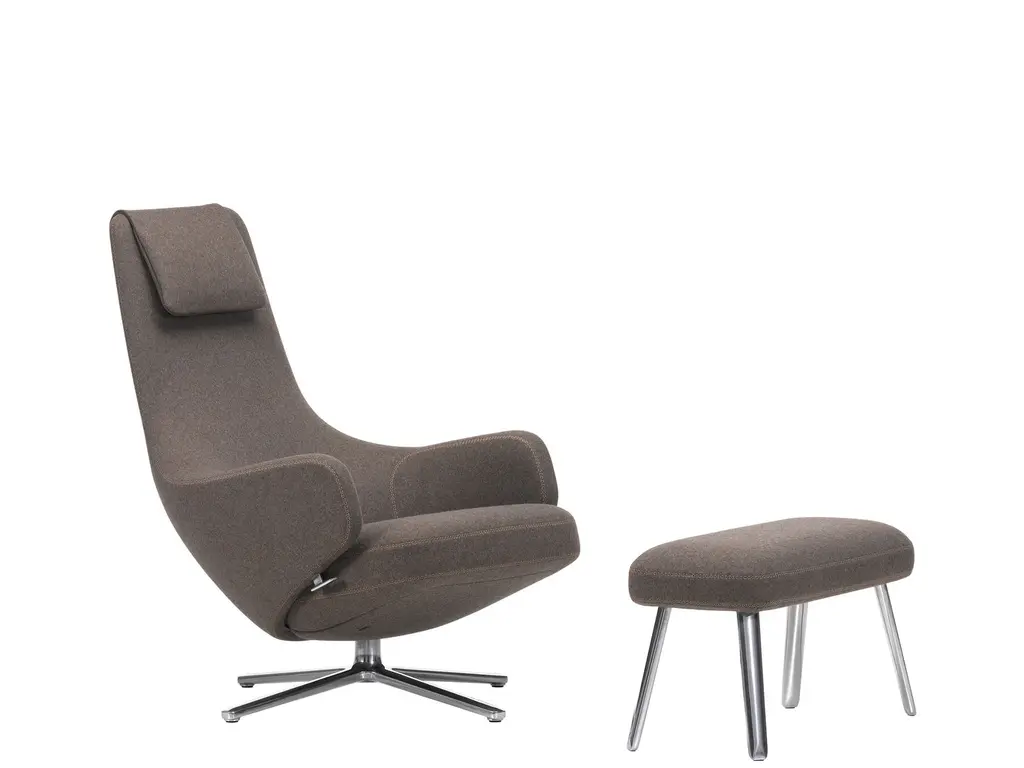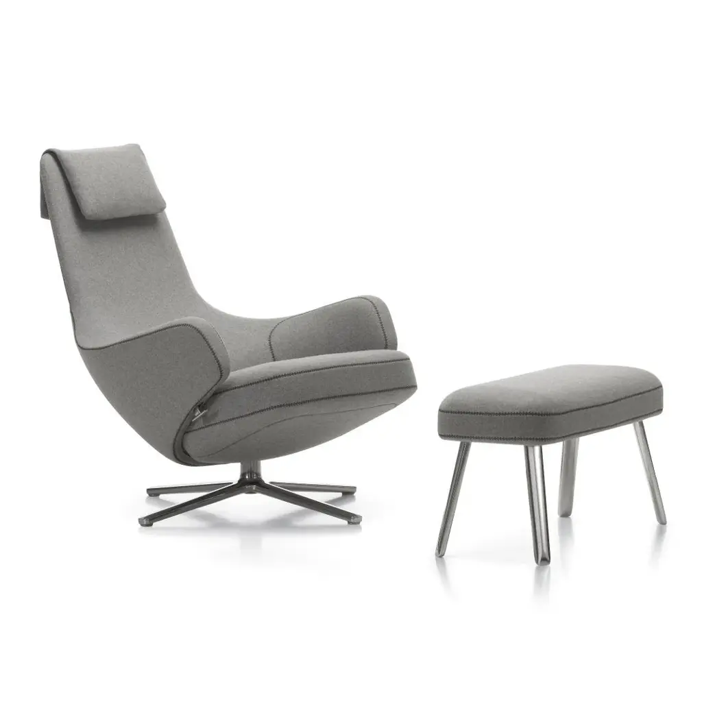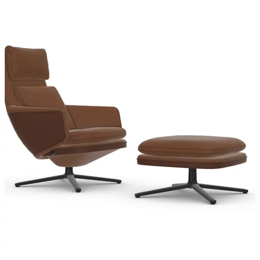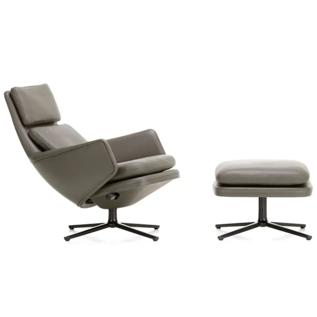There’s no better name for the meticulously engineered, hugging design of the Grand Relax Lounge & Ottoman from Vitra. Designer Antonio Citterio’s pieces reveal his process of combining timeless shapes with high-quality materials. Here, Citterio rethinks the reclining chair with modern Italian sophistication. Both the ottoman and 360-rotatable chair share a sleek, multi-point base that accentuates the plump shapes on top. The chair hugs the body with a tall backrest and pair of armrests dressed in embossed leather. This sculpted shell can be locked in place and fine-tuned resistance-wise. Foam fills in the cushions of the ottoman and chair to create a rich, cozy surface from head to toe.