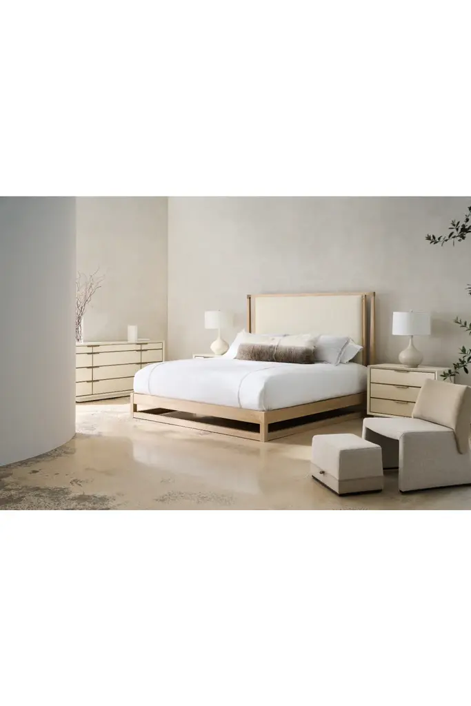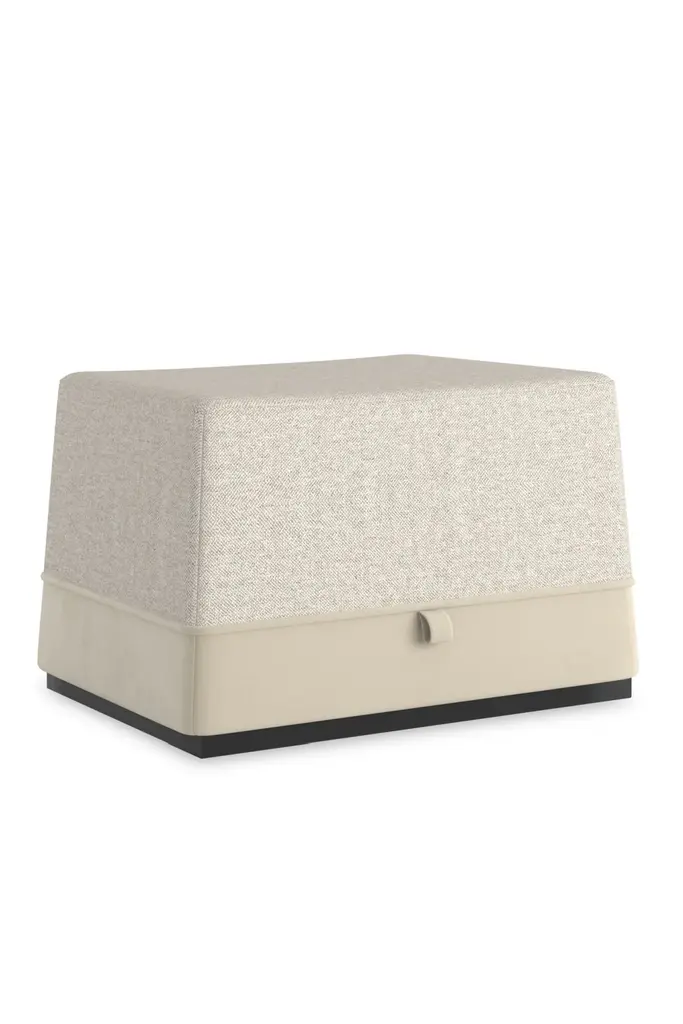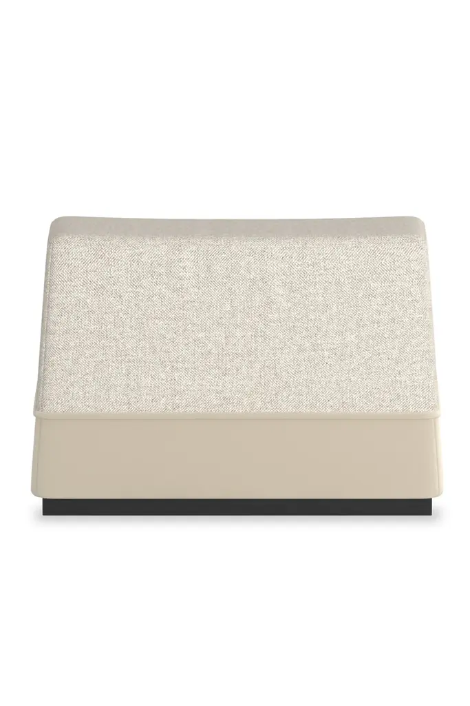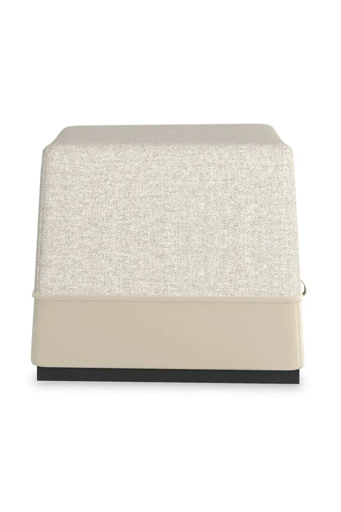 Et Voila is the nesting footrest that accompanies the Et Voila Chair. This perfectly proportioned piece is smartly upholstered in a light, Mottled Grey tweed with a base of Pumice Performance Suede. The piece rests on a wooden base in Dark Chocolate.