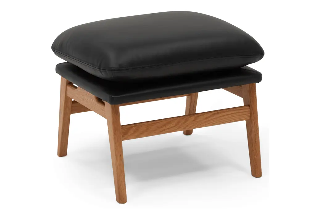 Crafted with a durable solid oak frame, and topped with alluring black leather, this Mid Century ottoman provides the perfect place to prop up your feet, or use as an extra seat. Pair with the Grier Lounge Chair for the ultimate way to relax.