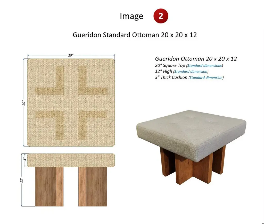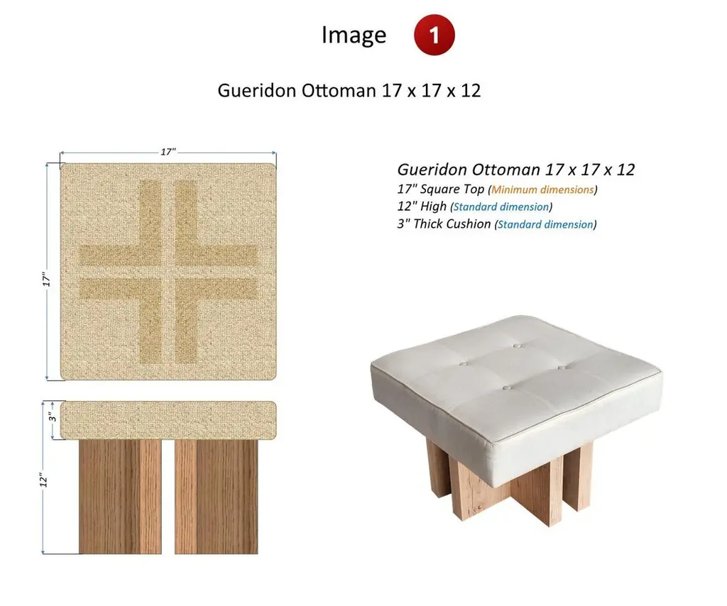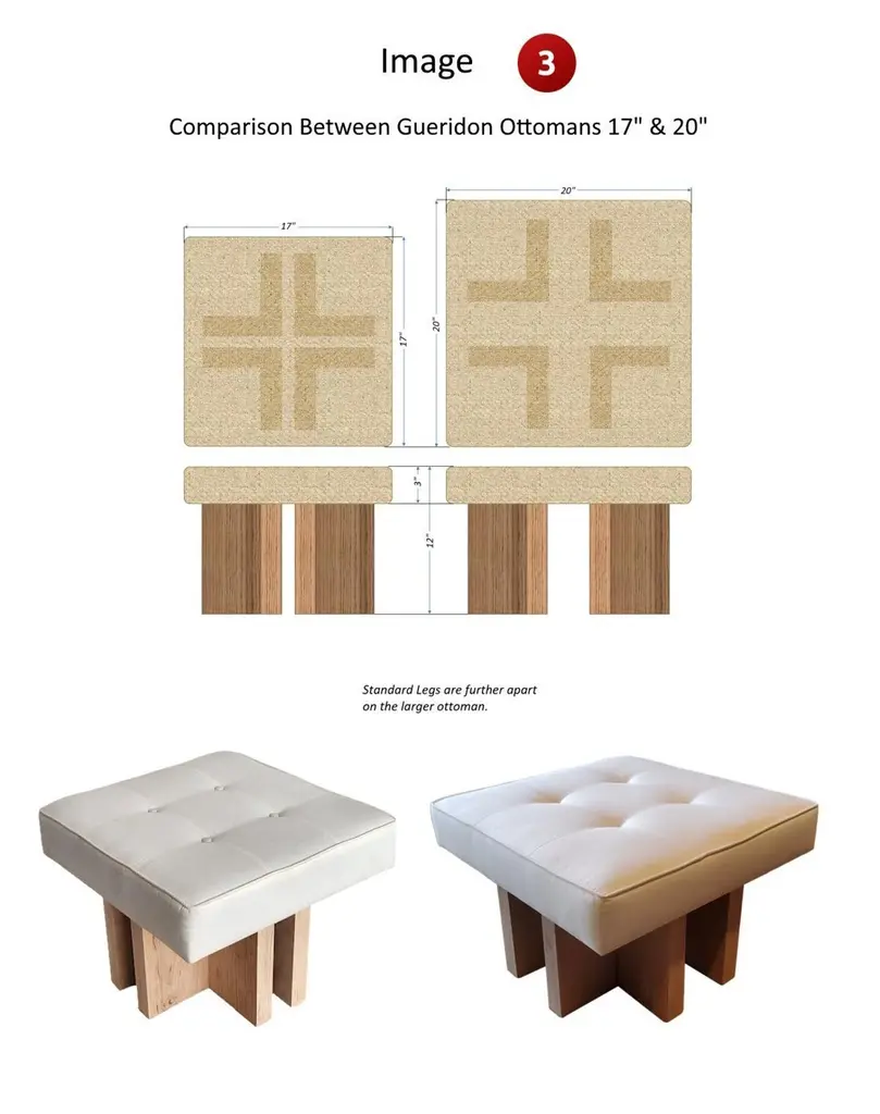 INTRODUCTIONGueridon handmade ottomans are made to order to your liking and specifications. 100% made in USA.Following the success of its ottomans, GUERIDON launched a full line of fully customizable ottomans, stools, benches, and day beds. All designs share the same 4 L shaped legs, signature of the Gueridon line.We offer a wide range of customizations. Here is the idea.Only you know what’s best to match your interior. Therefore, you provide us with your fabric (COM). Size, upholstery, wood staining? Your choice: we offer a wide range of options. From the same original base with 4 thick L shaped legs, we can also build a stool, a bench, or a day bed.HOW IT WORKS- YOU give us your requirements (see OPTIONS 1, 2 and 3 below)- WE tell you the necessary yardage - WE provide you with a detailed quote - YOU send us the fabric - YOU give us your upholstery choices (see OPTION 4 below)PRODUCTION LEAD TIME: 3 WEEKSLIST OF OPTIONS1. DIMENSIONS (see images 1-2-3-4) - Length - Width - Height - Cushion Thickness 2. LEG DIMENSIONS AND POSITION (see images 3-4) - L shaped Legs Length (long part of the "L") - L shaped Legs Width (short part of the "L") 3. LEG STAINS (see image 9) - Satin clear varnish on solid oak wood (No charge) - Other stains ($330) 4. UPHOLSTERY (see image 8) - Piping - Stitching - Tufting - Buttons (All upholstery options included in the price)CONTACT US FOR PRICING AND CUSTOMIZATION OPTIONS!
