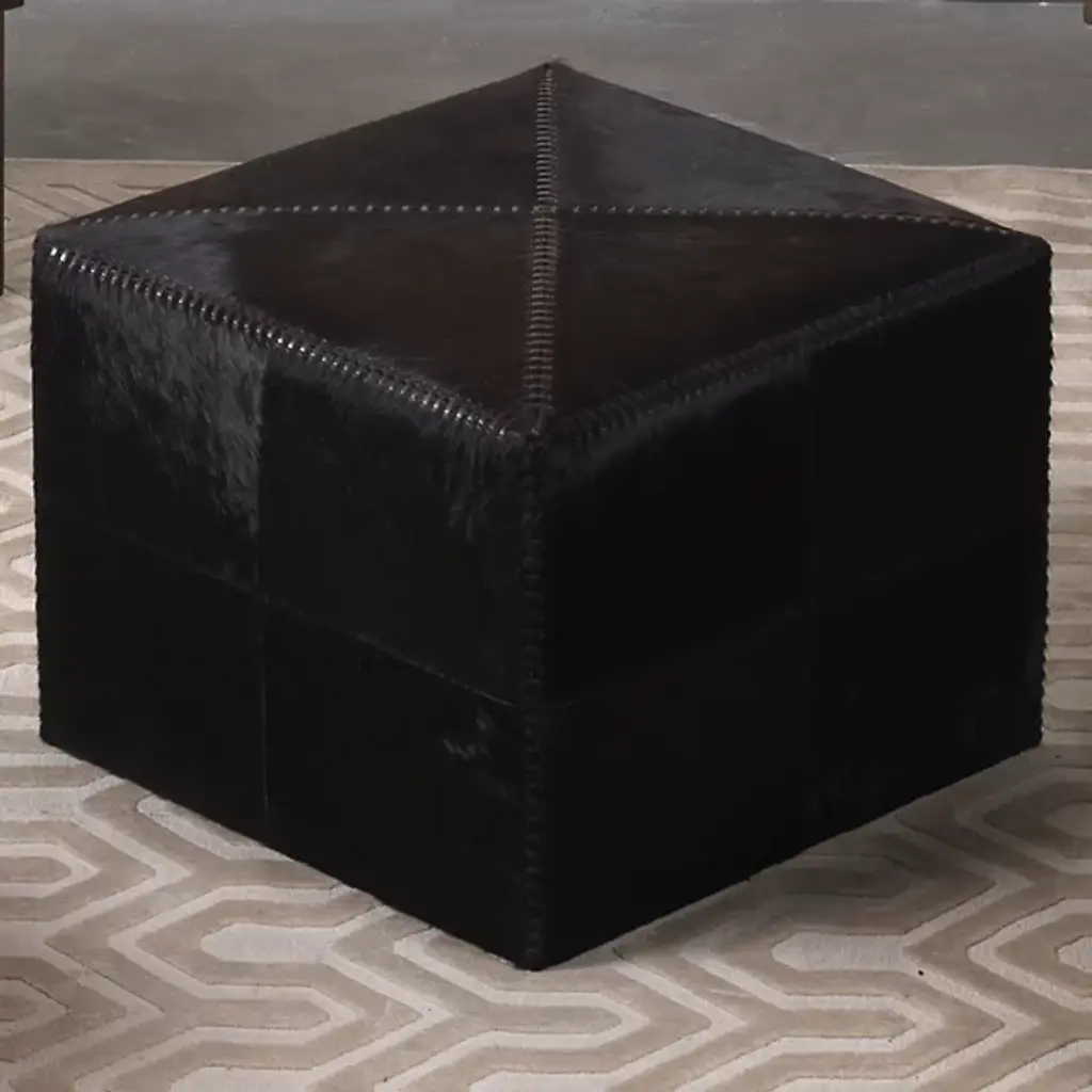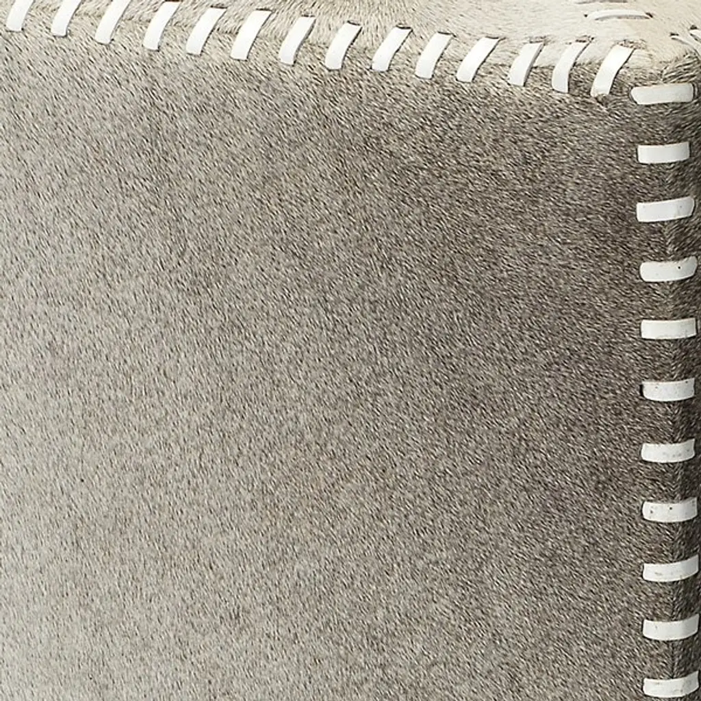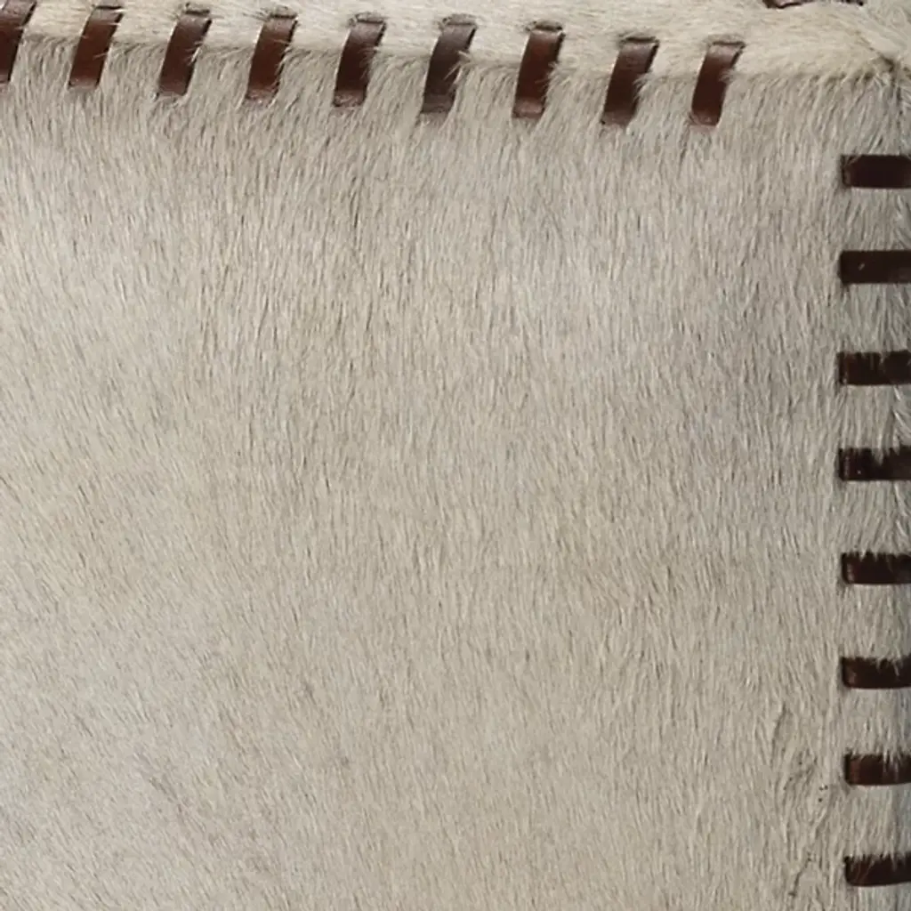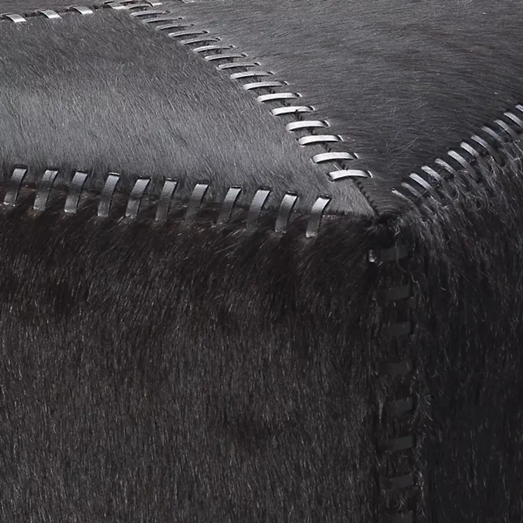 The Hair on Hide Ottoman by Jamie Young Co. is a multi-functional accent piece, combining style and versatility. Its cubic shape and padded foam ensure comfortable seating or footrest use. Crafted from ox hide and MDF, this ottoman exudes durability and elegance. With elegant stitching details, it adds a touch of sophistication to your room. The eye is drawn to the crisscross patterning at the surface. This versatile furnishment brings rustic modern charm to your living space