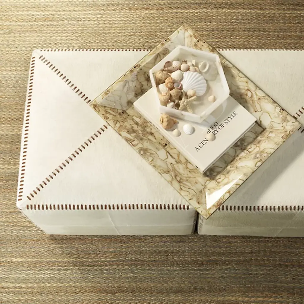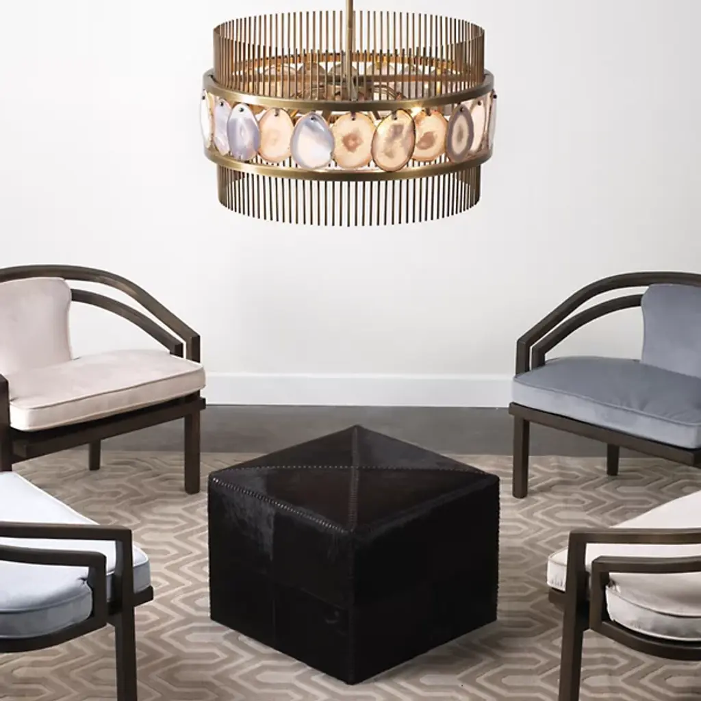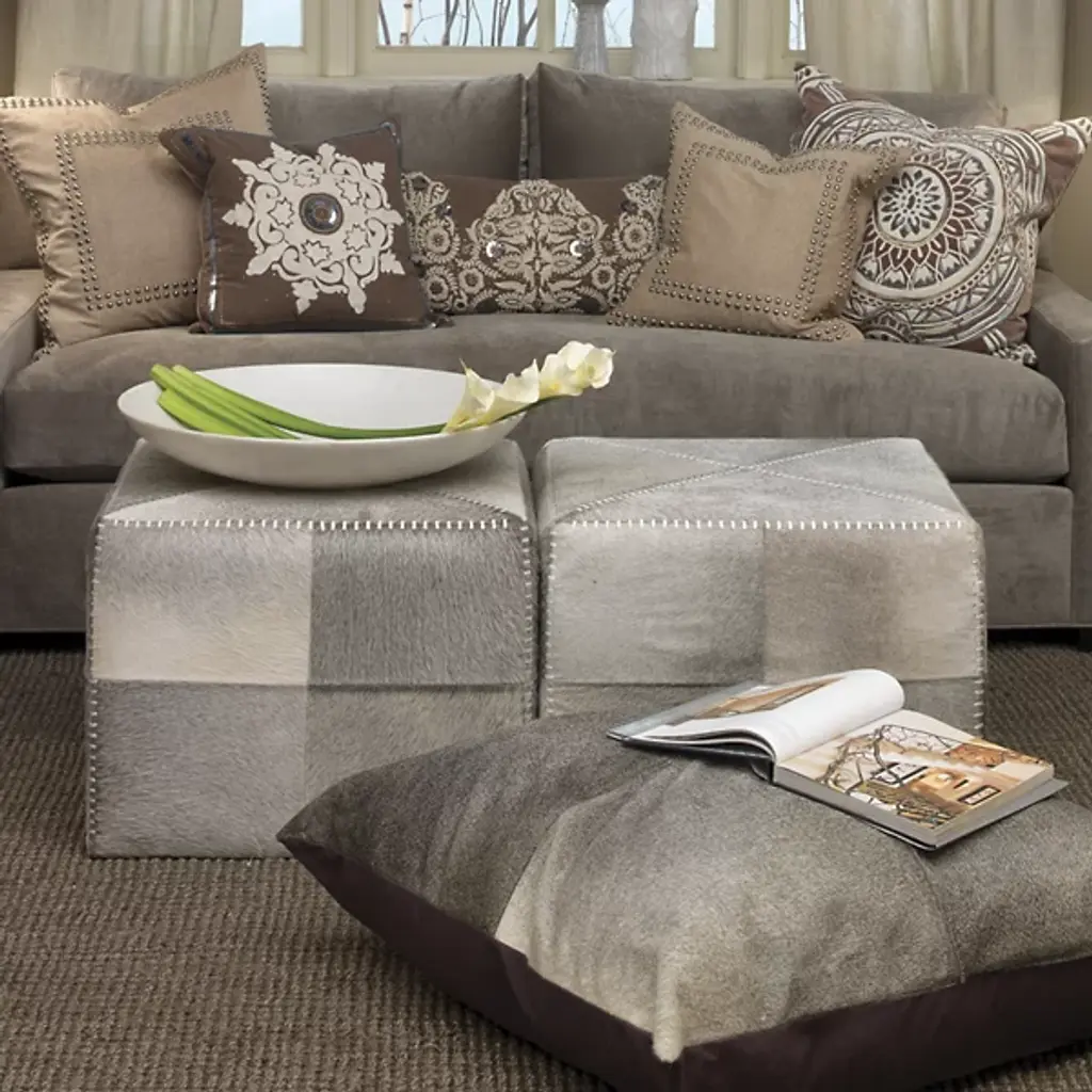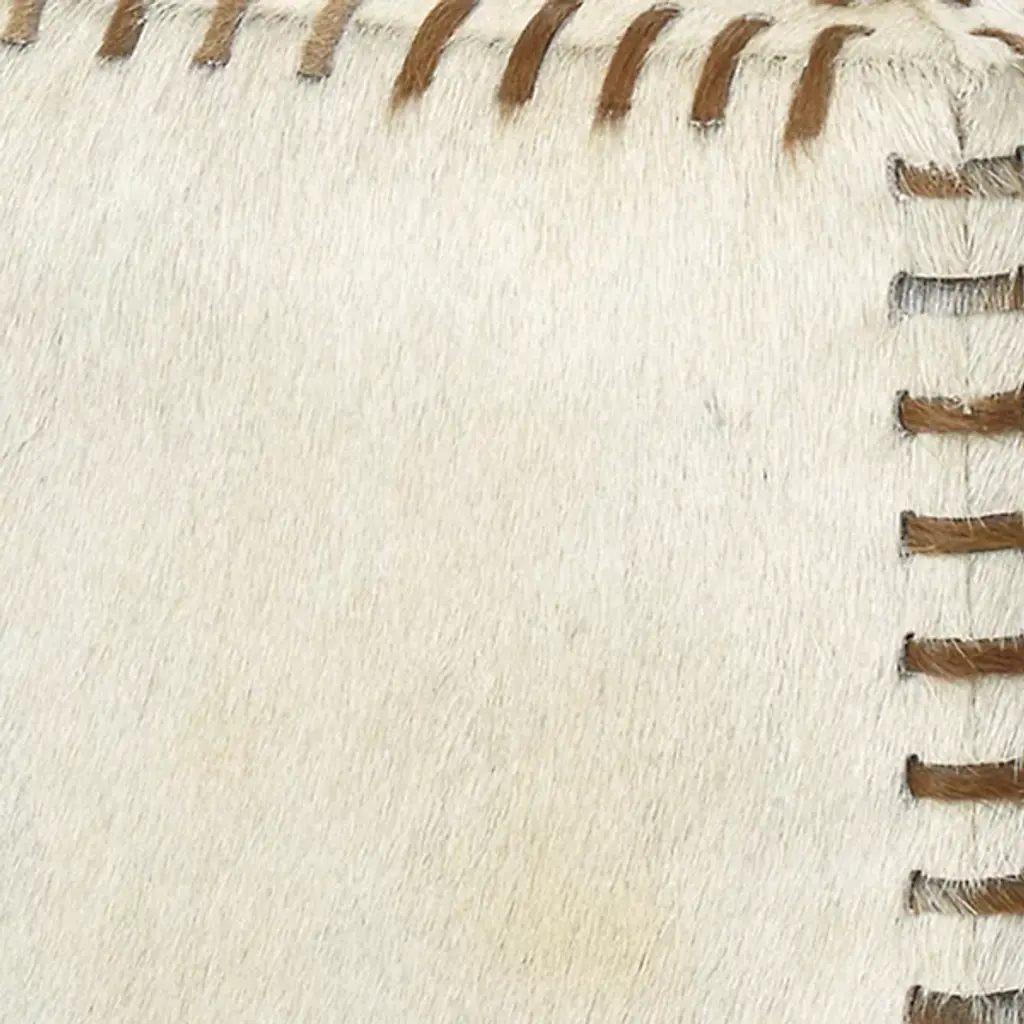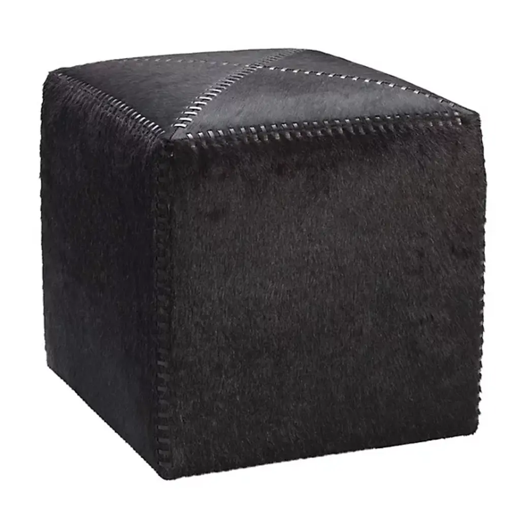 The Hair on Hide Ottoman by Jamie Young Co. is a multi-functional accent piece, combining style and versatility. Its cubic shape and padded foam ensure comfortable seating or footrest use. Crafted from ox hide and MDF, this ottoman exudes durability and elegance. With elegant stitching details, it adds a touch of sophistication to your room. The eye is drawn to the crisscross patterning at the surface. This versatile furnishment brings rustic modern charm to your living space