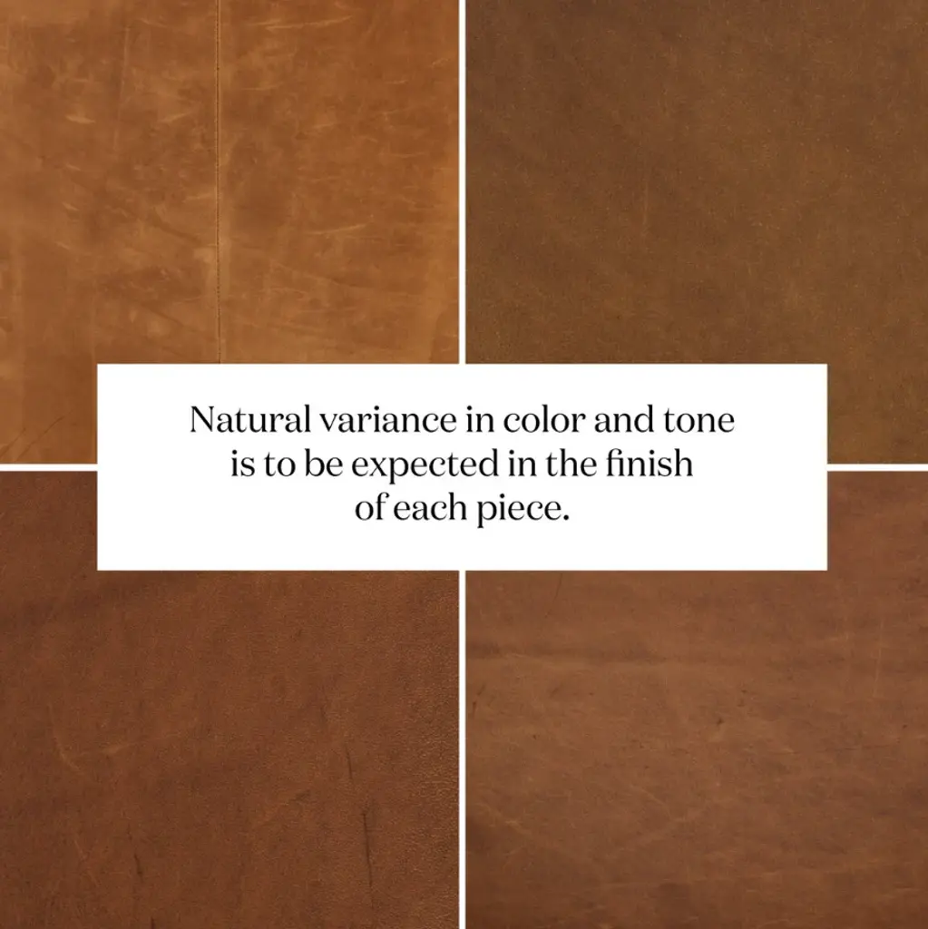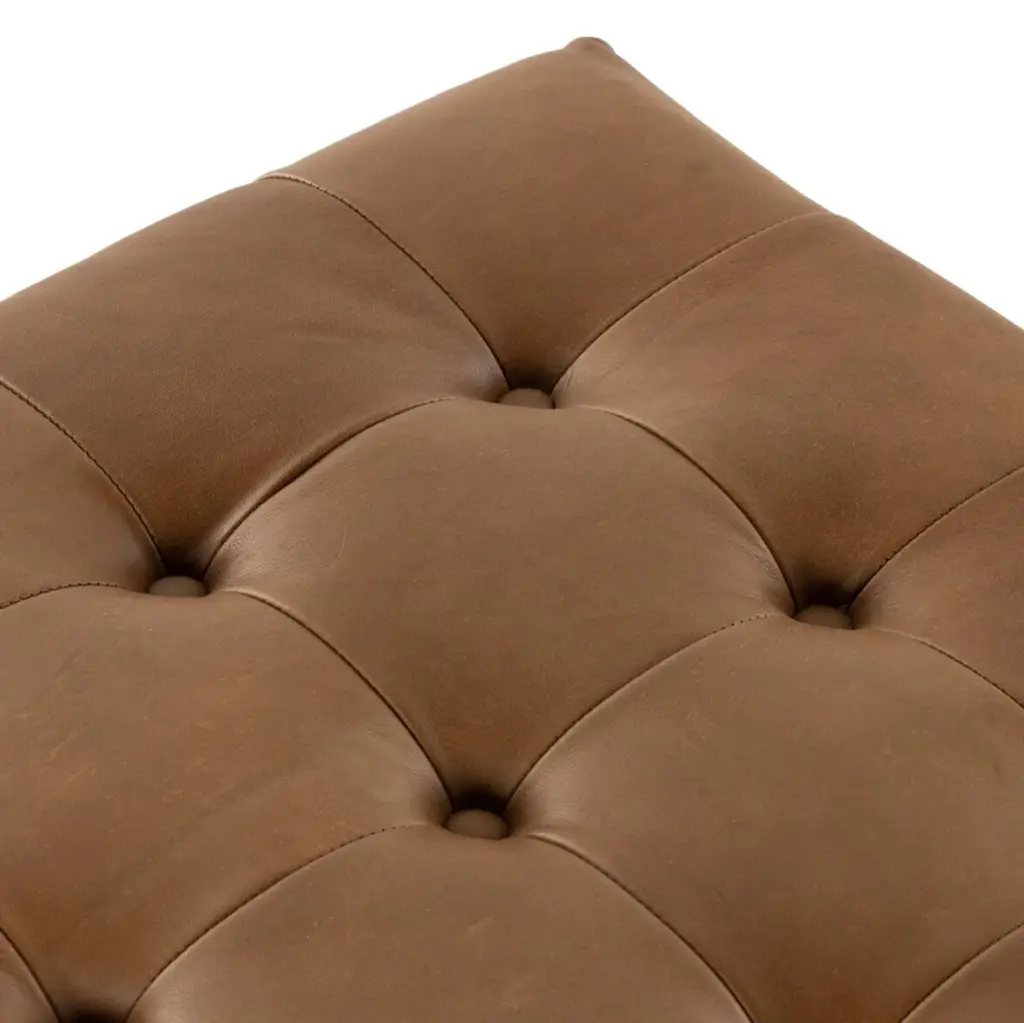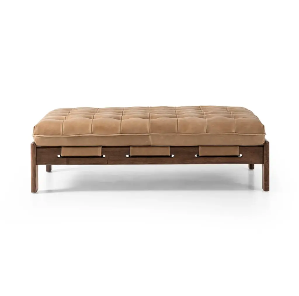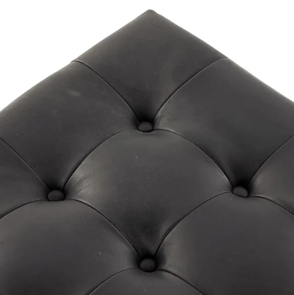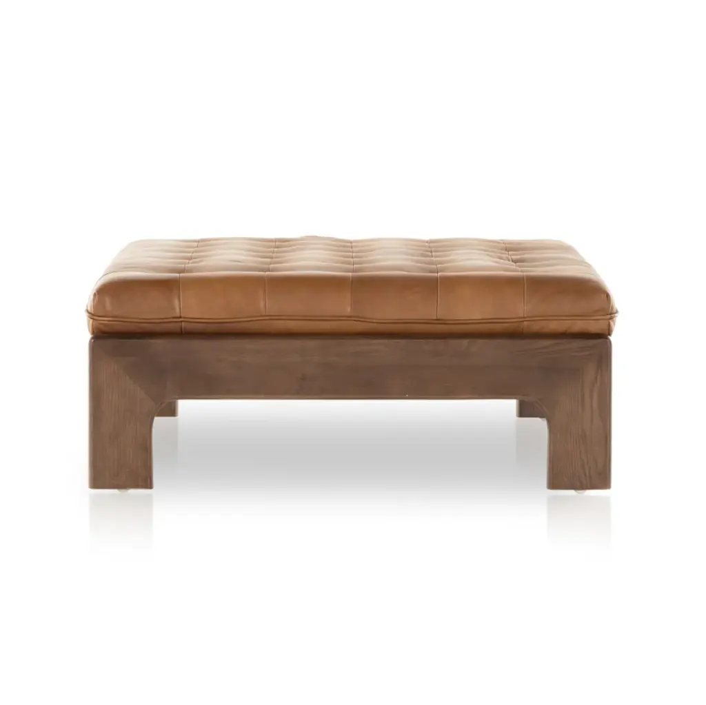 The Halston ottoman is constructed from an upcycled hide that exhibits natural markings, scars, and color variations. It features exquisite tufting, surrounded by an ash frame.