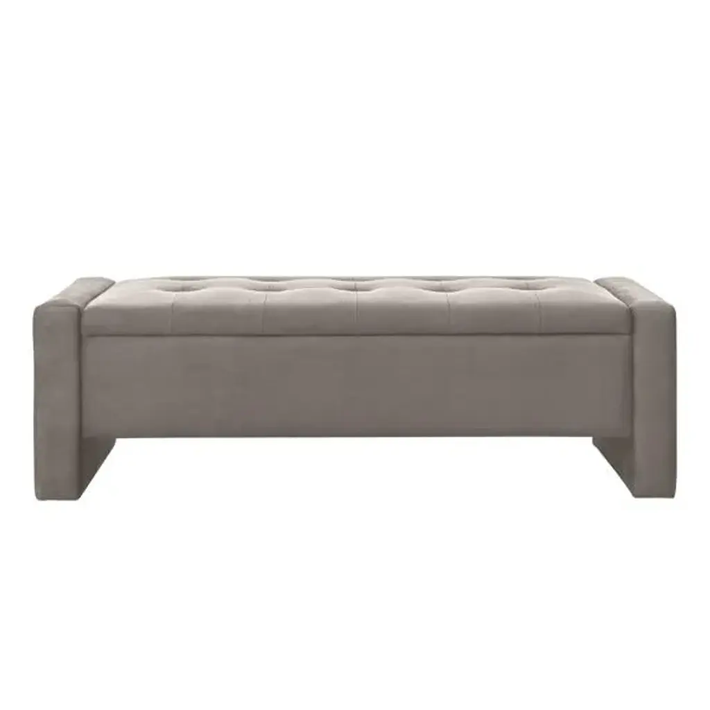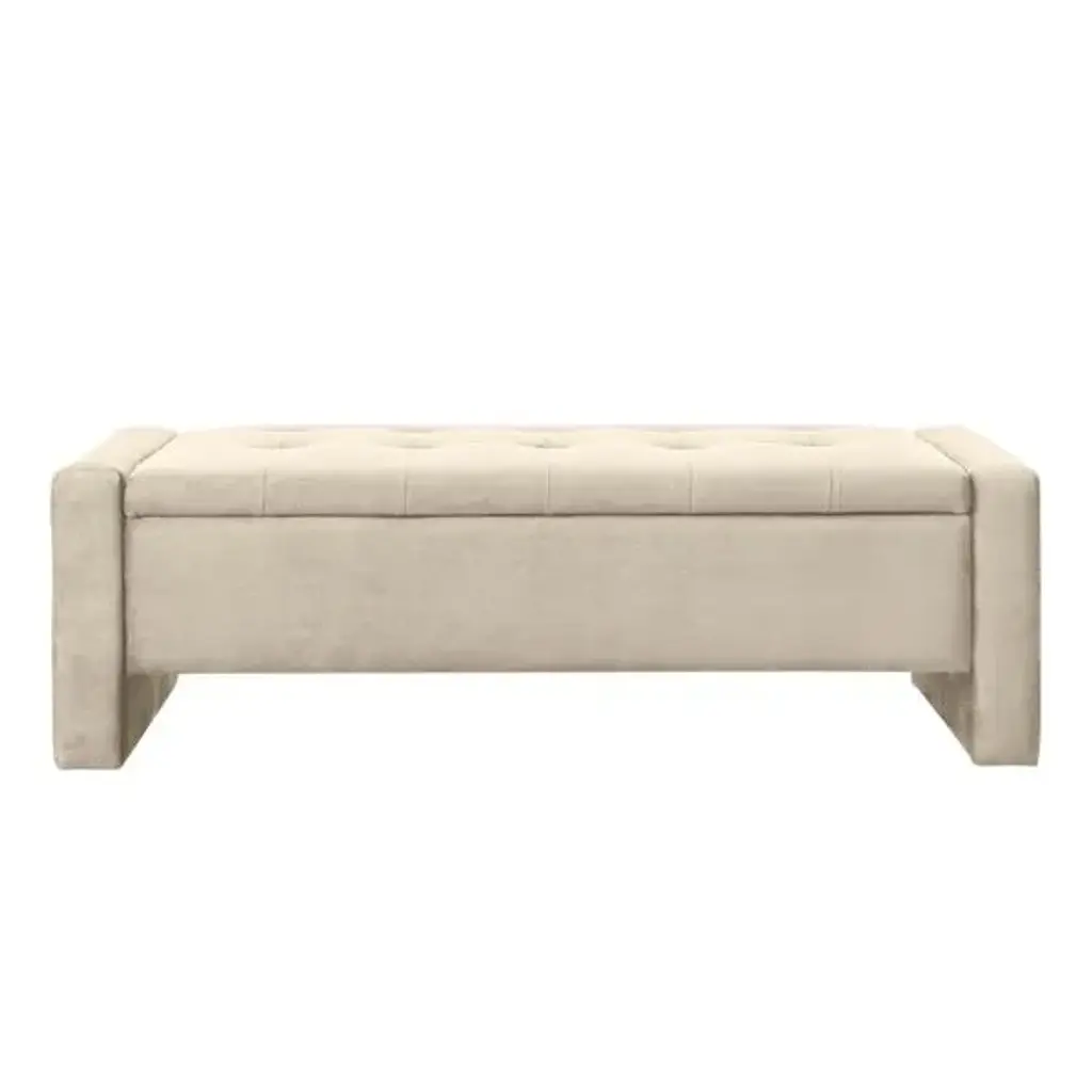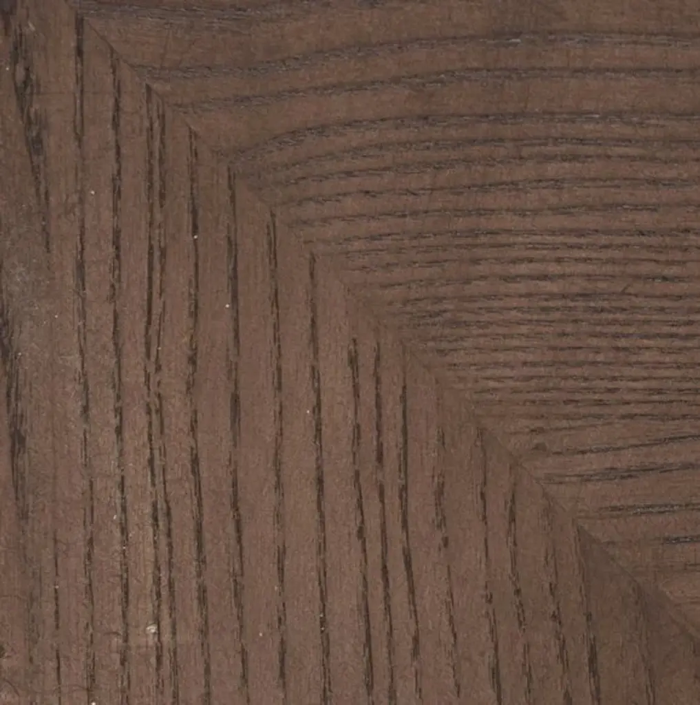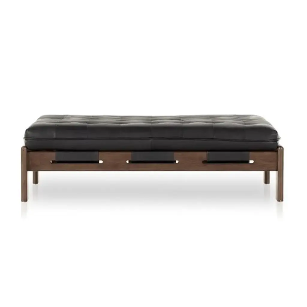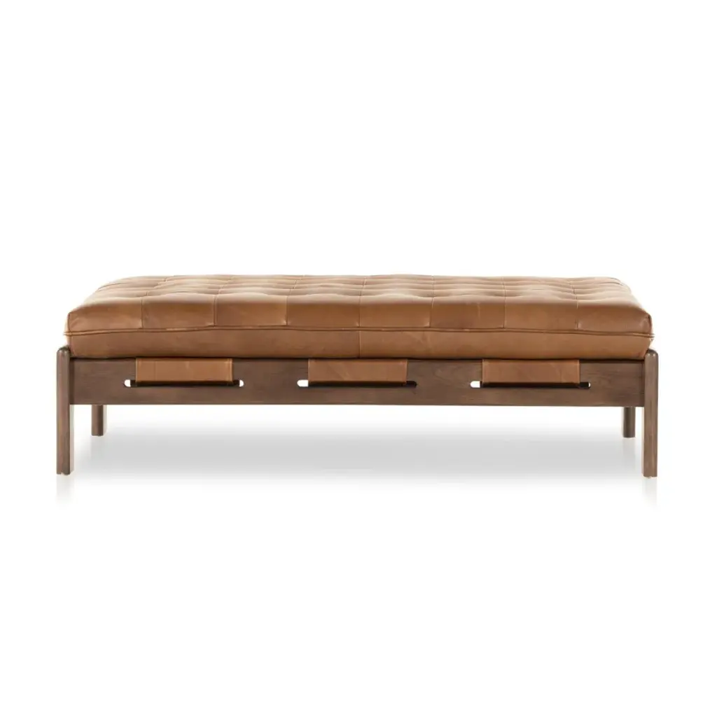 The Halston ottoman is constructed from an upcycled hide that exhibits natural markings, scars, and color variations. It features exquisite tufting, surrounded by an ash frame.
