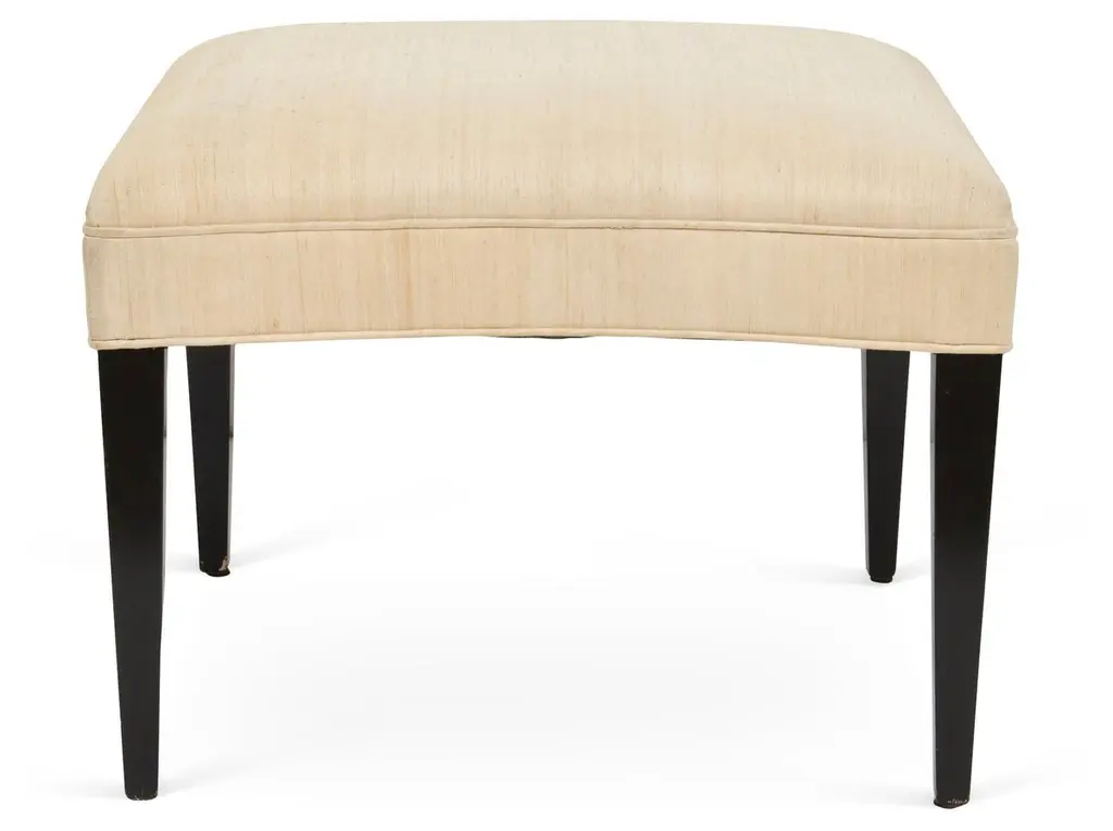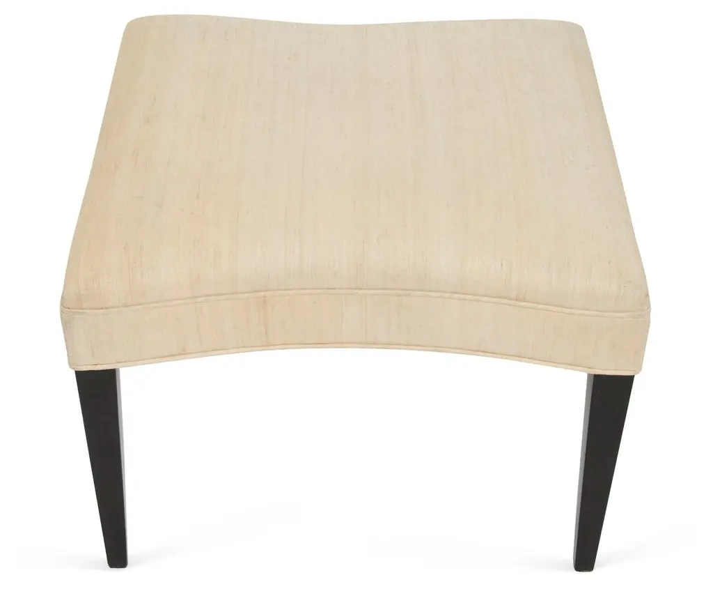 The handcrafted upholstered ottoman is built with tapered legs and convex sides to fit snugly within the matching cove chairs. Frame in alder or Walnut wood. Each piece is stamped.. Custom sizes and finishes available.