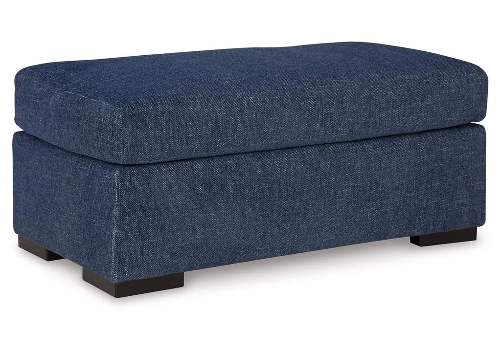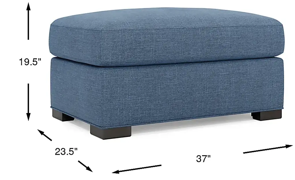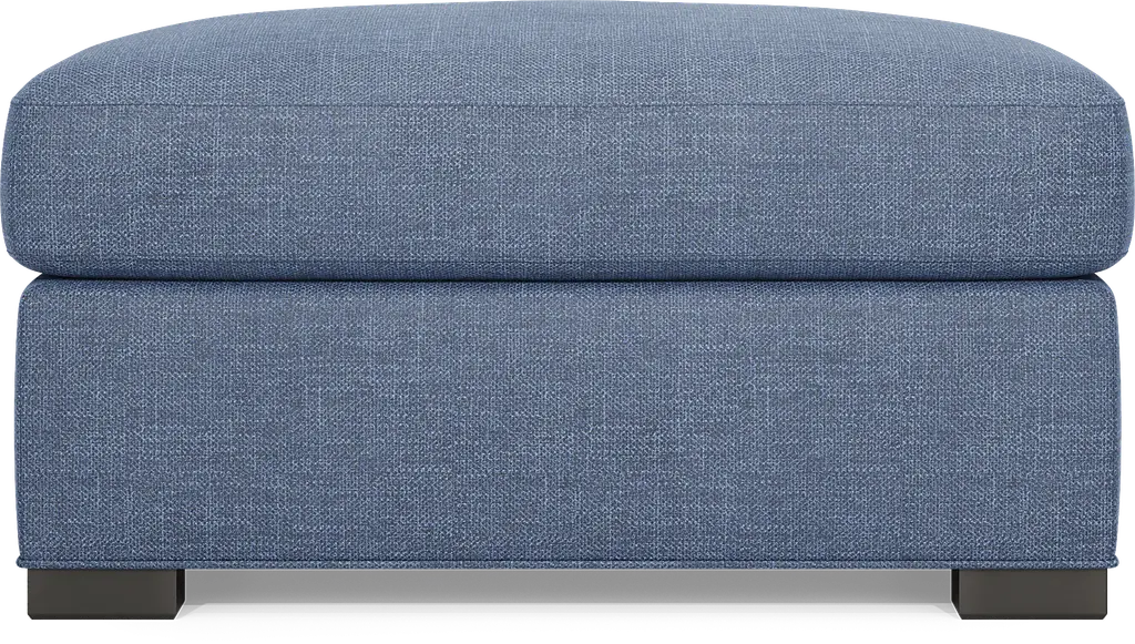 Slow mornings of easy relaxation. Everyday moments of warmth and connection. Lively gatherings flowing effortlessly into the evening. The Harmonie collection from Cindy Crawford Home is there for it all, rising to every occasion with luxurious comfort and elevated form. Wrapped in family-friendly sapphire blue chenille, this ottoman offers a perfect, contemporary style. Top-stitched seams showcase a timeless tailored look, while black block legs provide a subtle contrast to ground the piece. The gracefully curved cushion is filled with a custom blend of feathers, fiber and down surrounding a supportive foam core for comfort that's soft yet structured. Upholstery: 100% polyester