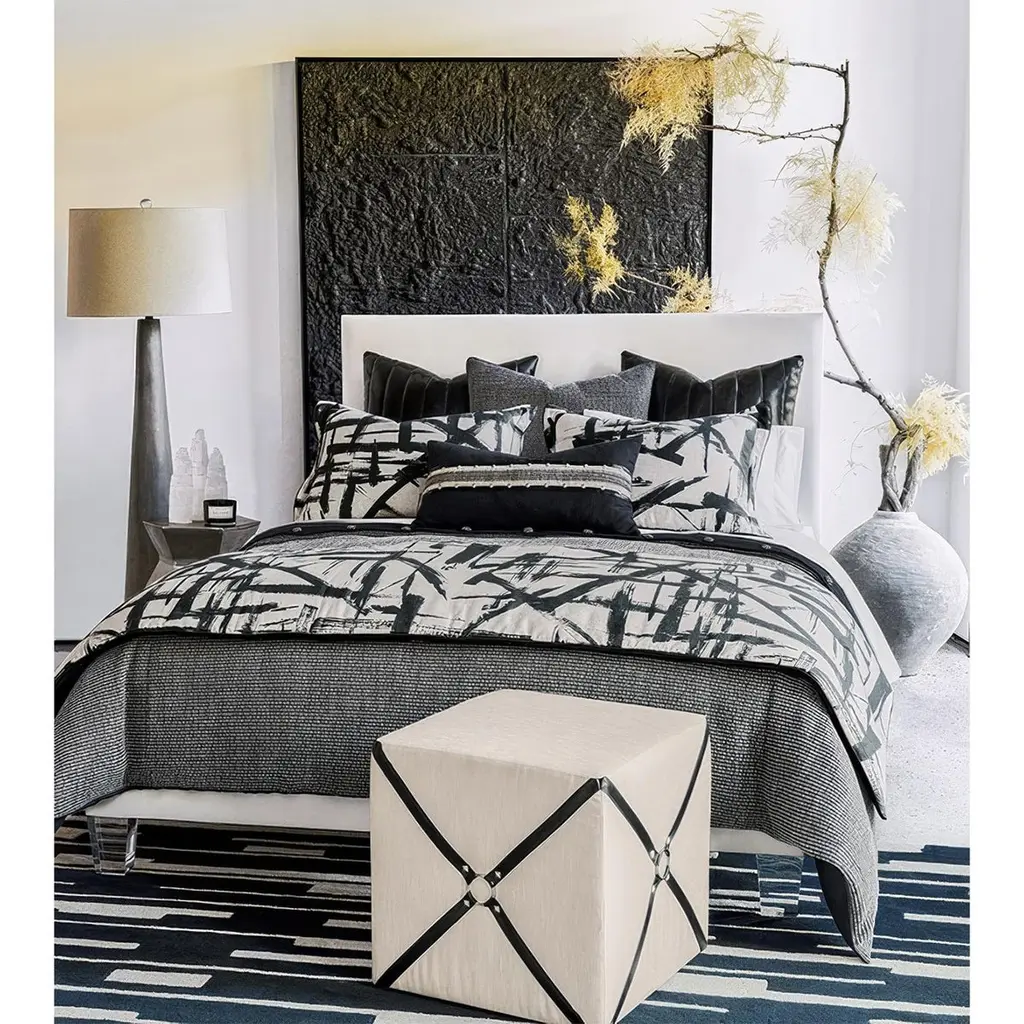 Upholstered in a luxurious ivory fabric, this cube ottoman exudes sophistication, while its vegan leather harness accents and pyramid nailhead details introduce an edgy yet refined aesthetic. The symmetrical, structured design is perfect for contemporary interiors, offering a touch of high-fashion influence with its equestrian-inspired detailing.Designed for both style and comfort, this ottoman is thickly padded and tightly upholstered, ensuring long-lasting durability. The high-density foam core provides exceptional support, making it an excellent choice for additional seating, a chic vanity stool, or a stylish footrest. Proudly Made in the USA, this piece embodies quality craftsmanship with a sleek, modern edge.Dimensions: 19" W x 19" D x 19" HMade in the USA.Lead time is 6 weeks.