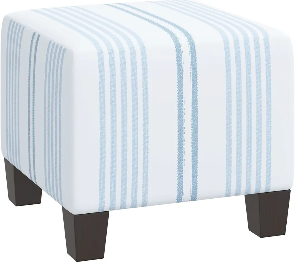 Exclusive to One Kings Lane: Tailored stripes, a square silhouette with rounded corners, and an exposed wood base make this ottoman a welcome addition to a living room, a den, or a bedroom. When you're not using it as a perch or a footrest, you can top it with a tray and use it as an occasional table.
