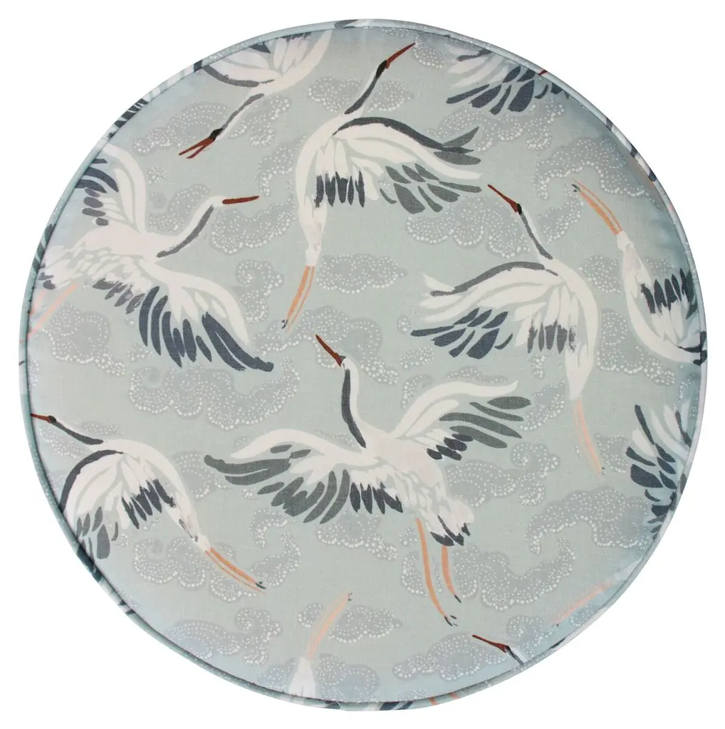Exclusive to One Kings Lane: This versatile ottoman is crafted with a round pine frame and boldly patterned cotton upholstery filled with fibers and foam. Made in the USA.
