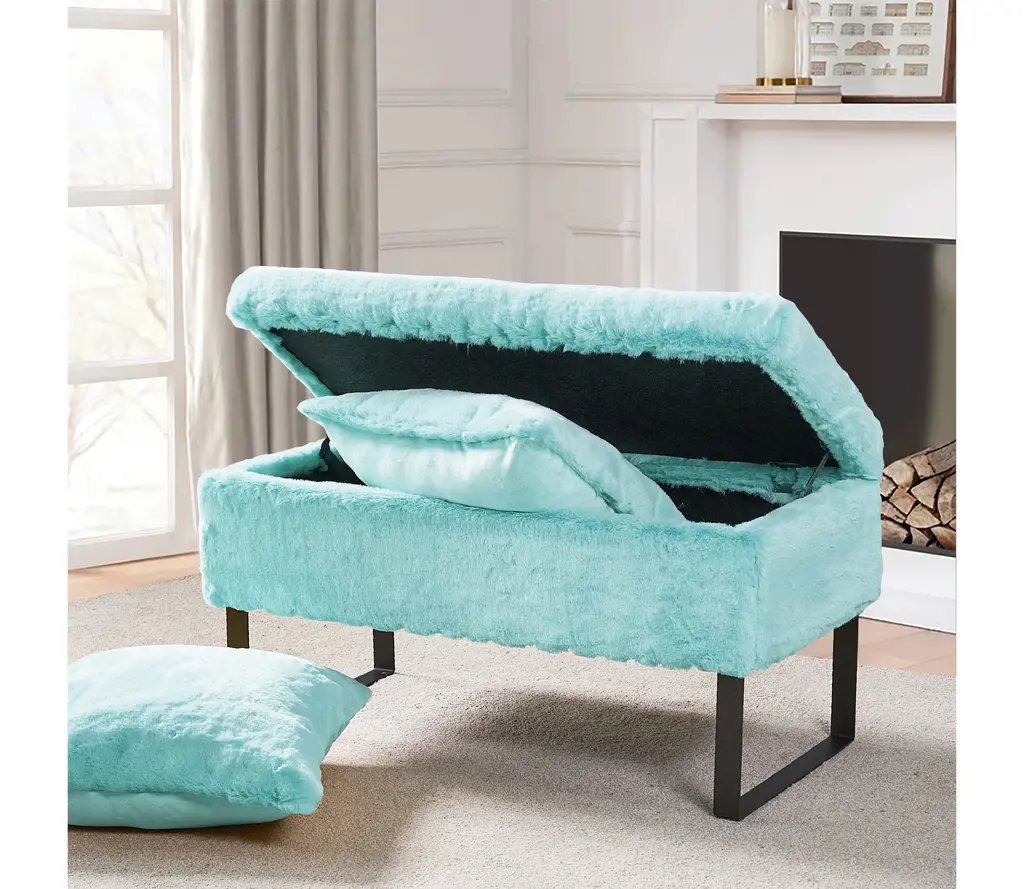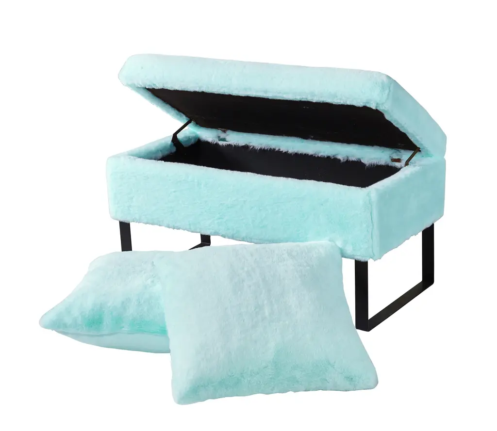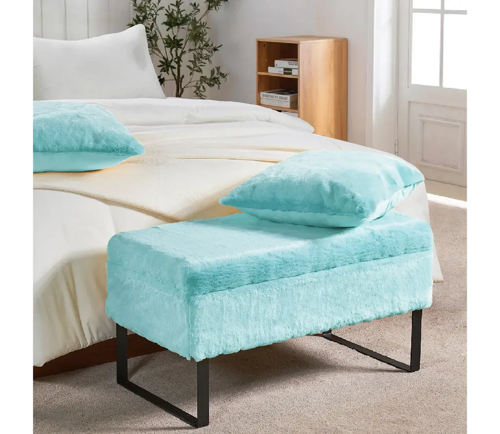 UPHOLSTERED ACCENT! Package includes: (1) Heavy Faux Fur Ottoman - 36" x 18" x 19"in Height ; (2) Matching Color Pillow - 20" x 20"AN ARRAY OF COLORS! Each ottoman measurements are 36 L x 18 W x 19 H inches when assembled and offers a 200-pound capacity. 2 Pieces of Matching Color 20" x 20" Pillows comes inside the ottoman. Metal hairpin legs are sturdy and durable to withstand full weight capacity. Plush, multi-density cushioning provides a soft but supportive seat. With an array of colors to choose from it��s easy to match one with your existing decor.Every time your loved one slips under their pristine faux mink throw blanket and kick their feet up, they will think of you and your thoughtfulness. Ottomans are wrapped in a plastic bag then boxed for ultimate protection.MINOR ASSEMBLY! Simply screw metal hairpin legs into each corner of the bench with the provided screws and your bench is ready to enjoy. Be prepared with a Phillips screwdriver. Hairpin legs and screws arrive in the hidden zipper compartment under the seat. Designed and manufactured by Home Soft Things, the trusted source for stylish textile goods and furniture.PROTECT AND CARE! Spot clean seat cushion cover only on visible stains and spots using mild soap and a clean, soft towel. Metal hairpin legs may be wiped with a clean, damp towel.