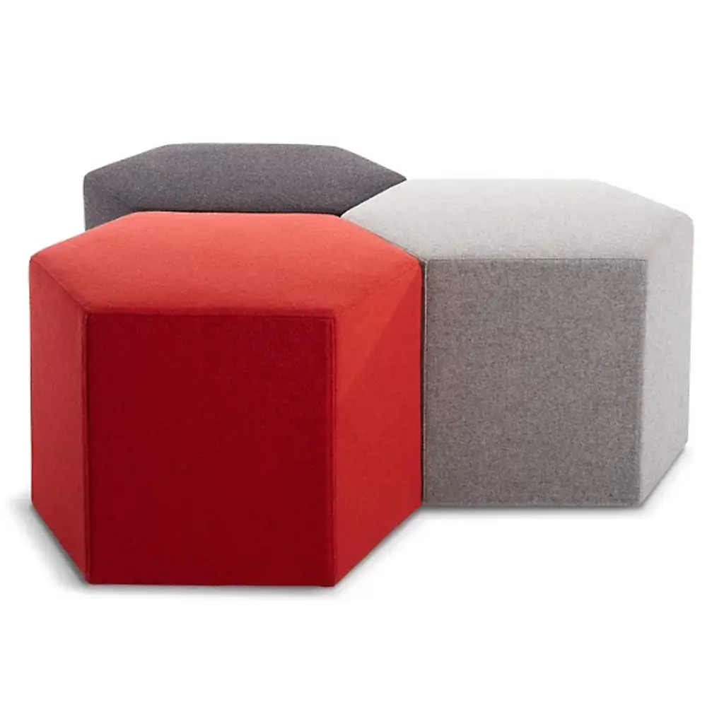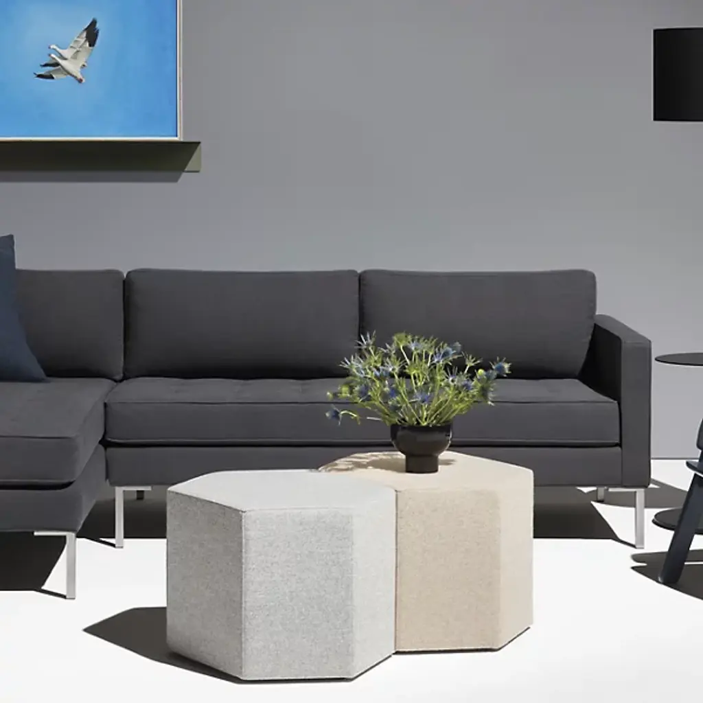 How many sides does it take to create a cool modern ottoman? Six, of course. The Blu Dot Hecks Ottoman is an elongated hexagon covered in one of a variety of soft Thurmond fabric colors. The sharp geometric shape is eye-catching all on its own, and it also allows for seamless customized groupings of Hecks as desired.