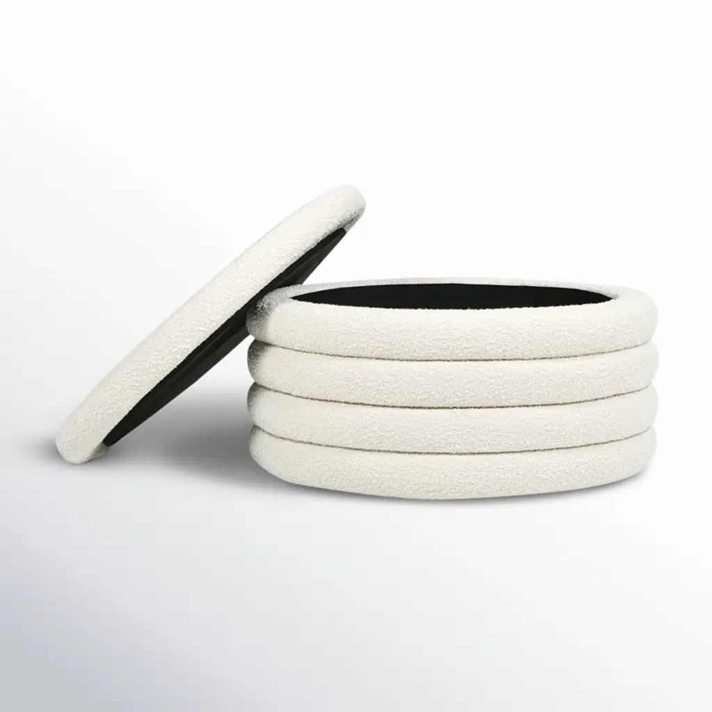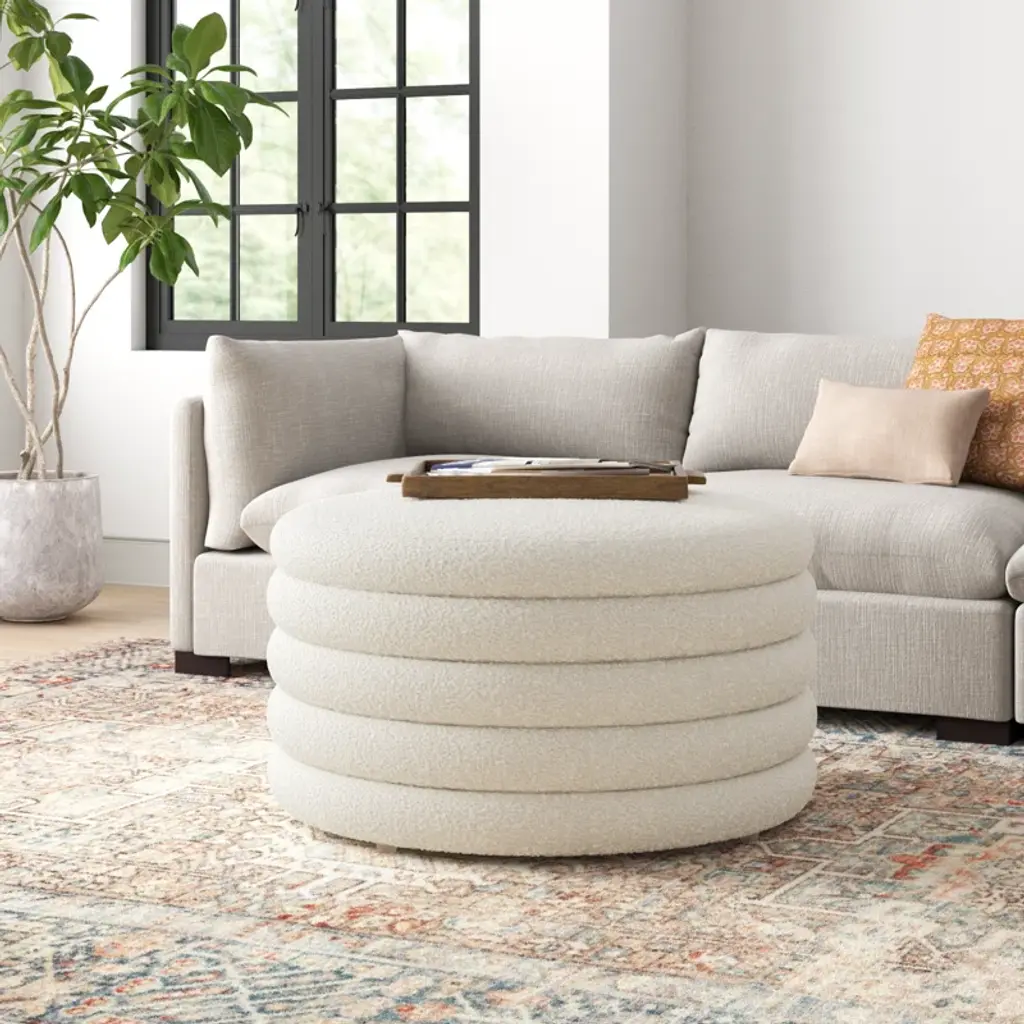 Our round and resourceful cocktail ottoman combines bold style and beneficial storage for a variety of rooms. Its sturdy wooden frame is wrapped in textured bouclé-like fabric and forms a stacked, sculptural silhouette. The foam-filled cushion top provides a comfortable seat, while the removable lid reveals hidden storage for blankets, pillows, and board games.