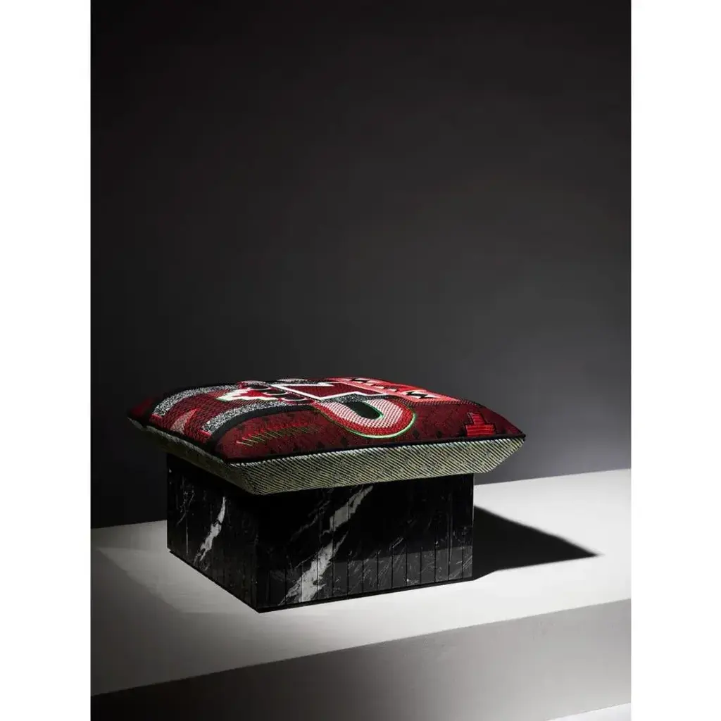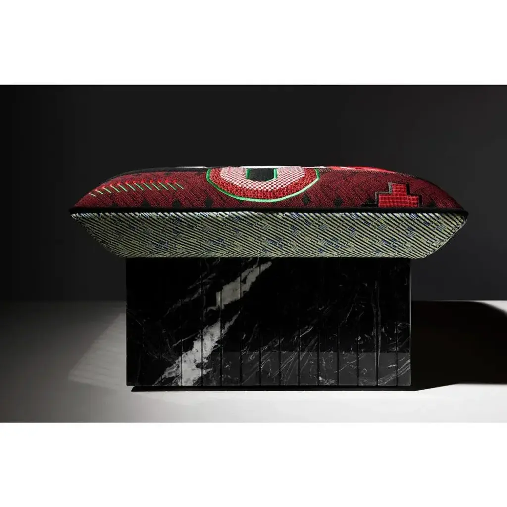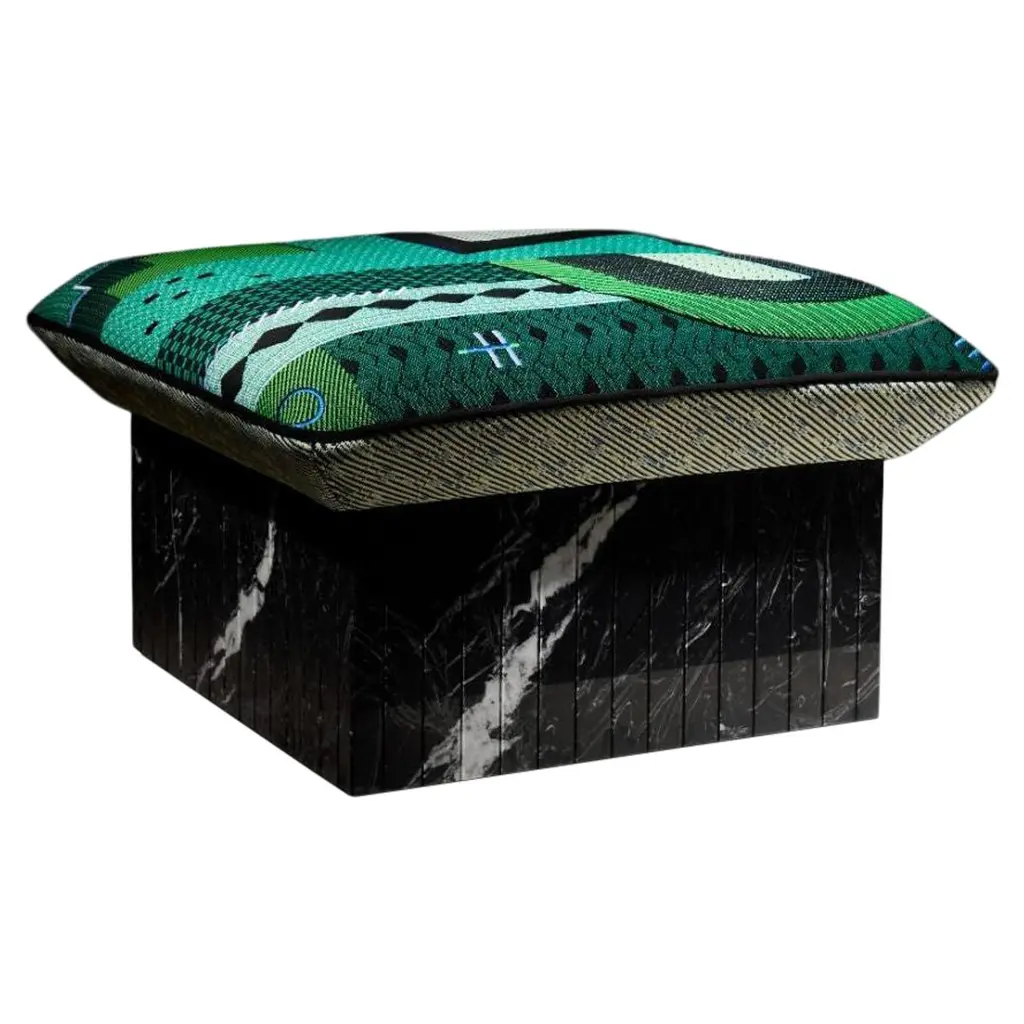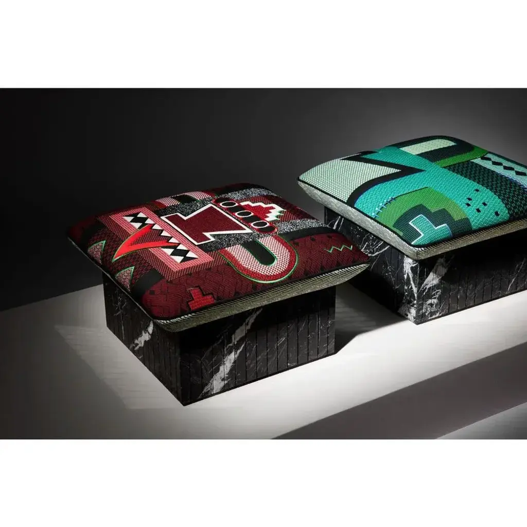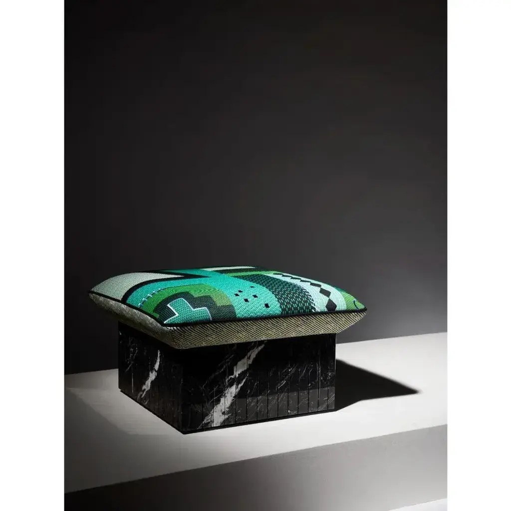 Hopi ottoman green pattern by Marta Bakowski. Dimensions:D 65 x W 65 x 44 cm. Materials: marble and fabric. May be available separately in different finishes. HOPI, this new collection of ottomans inspired by Native American Indian culture, is made of a very special textile. It is a technical knit usually used for producing sneakers and is adorned with contrasting embroideries.