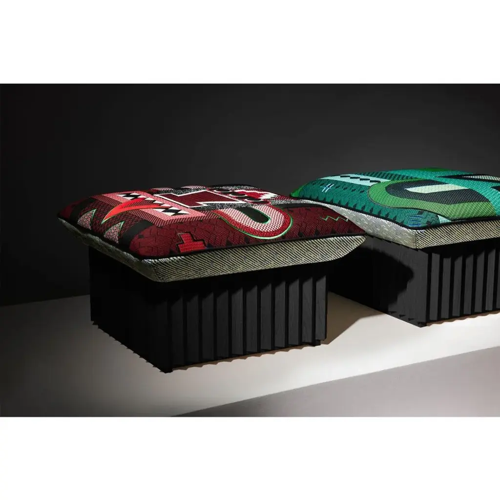 Hopi Ottoman red pattern by Marta Bakowski Dimensions:D65 x W65 x 44 cm Materials: Marble and fabric. May be available separately in different finishes. HOPI, this new collection of ottomans inspired by Native American Indian culture, is made of a very special textile. It is a technical knit usually used for producing sneakers and is adorned with contrasting embroideries.