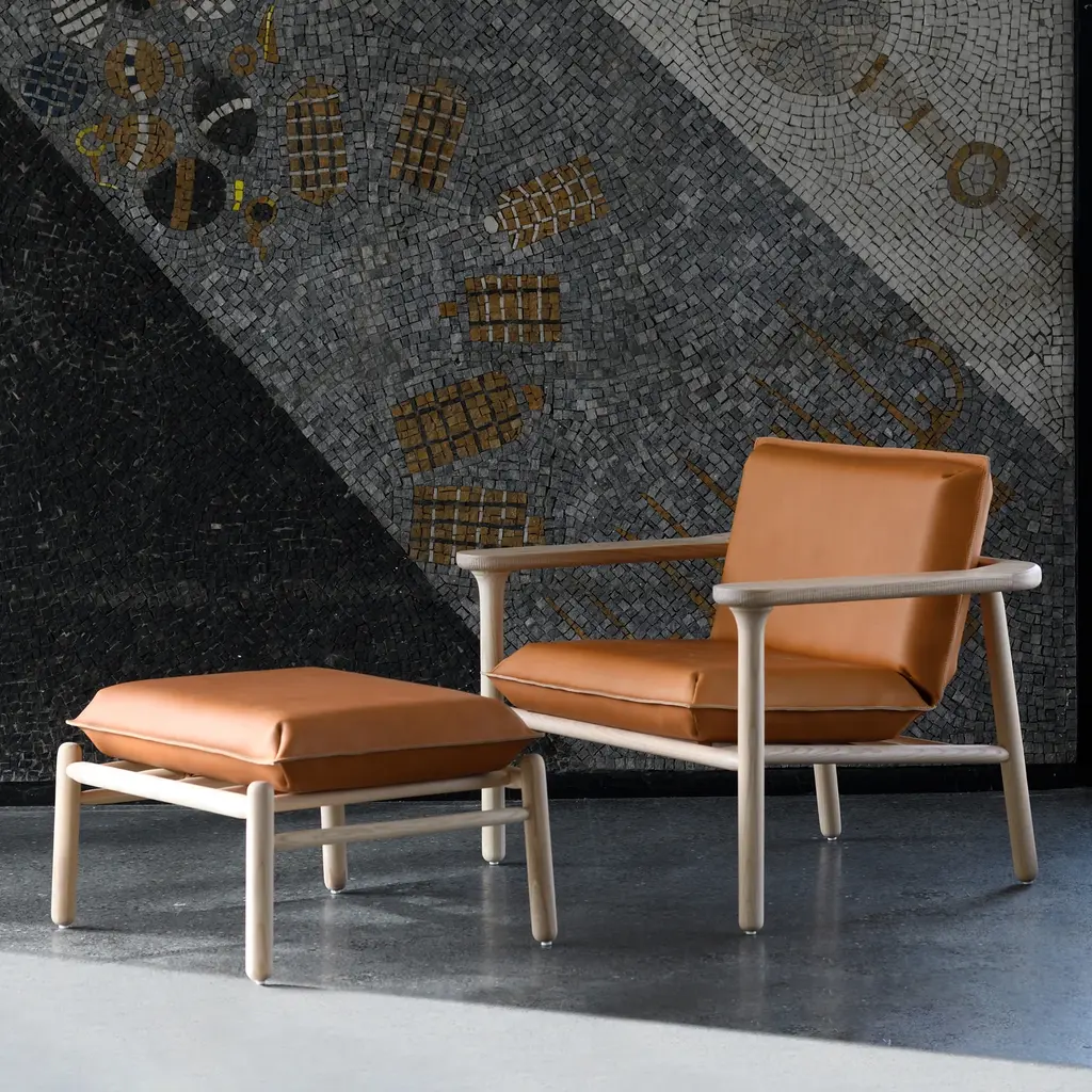 Igman Ottoman follows the rounded proportions of the collection's lounge chair (also at A+R) and, indeed, they make a fine pairing for complete relaxation. But the solid-wood piece can also serve as extra seating and 2 or more of the ottomans can even be combined into a bench. Finnish designer Harri Koskinen teams up with Bosnian brand Zanat with its legacy of fine woodcraft, striking a harmony that extends to the substantial cushion with either vegetable-tanned saddle leather or fabric upholstery.