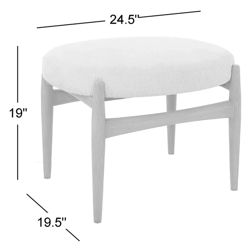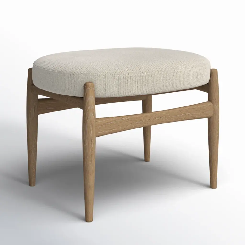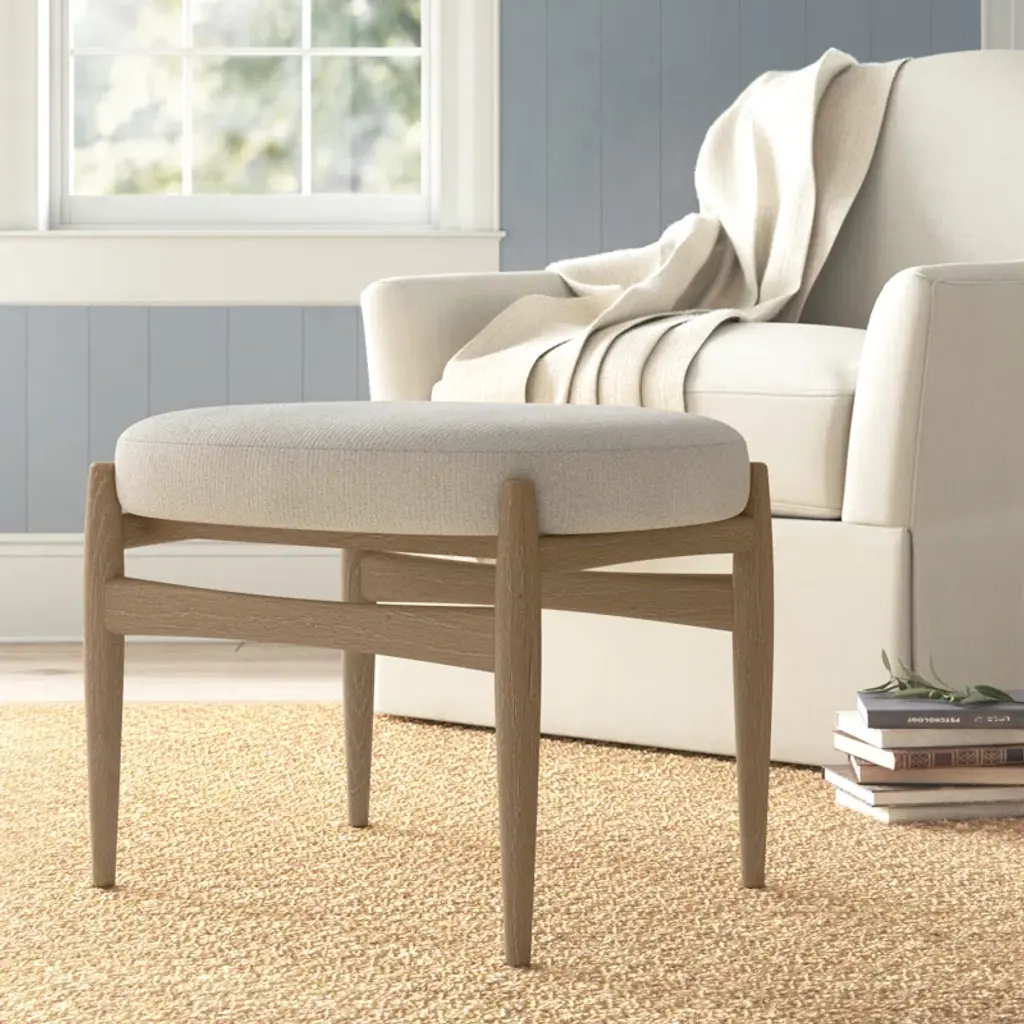 This cozy ottoman brings a Scandi-inspired look to your living room, bedroom, or reading nook. Its sleek solid oak base showcases a natural finish with off-white glazing, creating a whitewashed look that's ideal for transitional spaces. The plush seat is wrapped in a channel-textured off-white polyester fabric and padded with foam, so it's great for resting your feet or providing extra seating. Gather around with loved ones and enjoy the simple pleasures of home with this versatile ottoman. Bonus: It doubles as a coffee table when you top it with a tray.