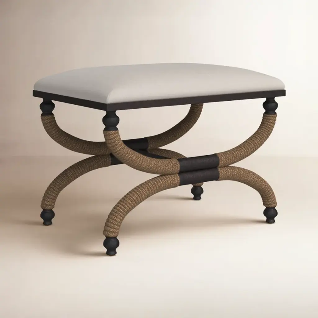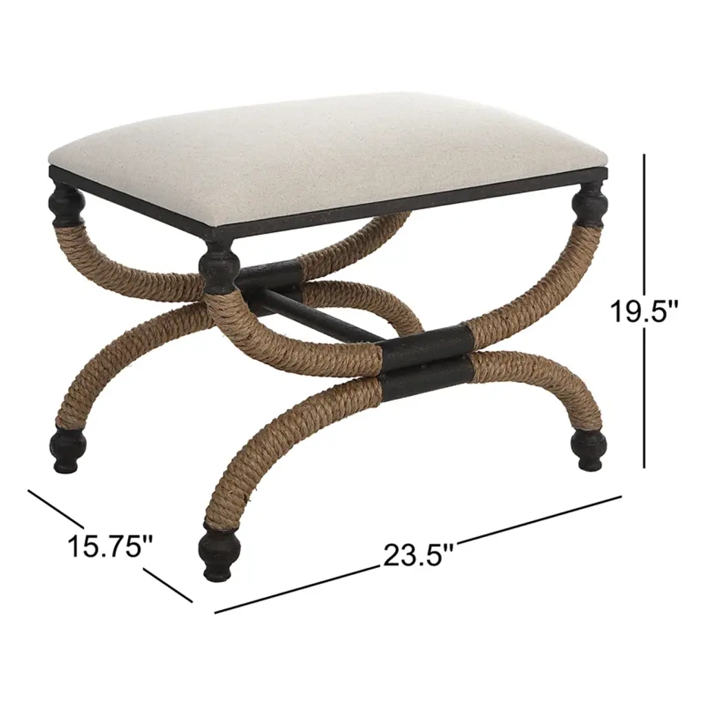 Warm and inviting, this ottoman offers a soft place to kick back in style. The metal frame features mirrored arching legs, wrapped in natural fiber rope accents for a rustic touch. Cotton blend upholstery in a neutral oatmeal hue wraps around the cozy cushion top. Use it as extra seating or even top with a tray to create a makeshift end table.