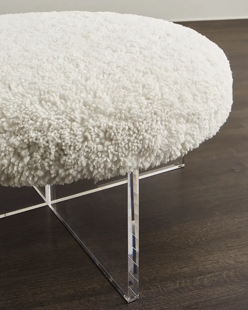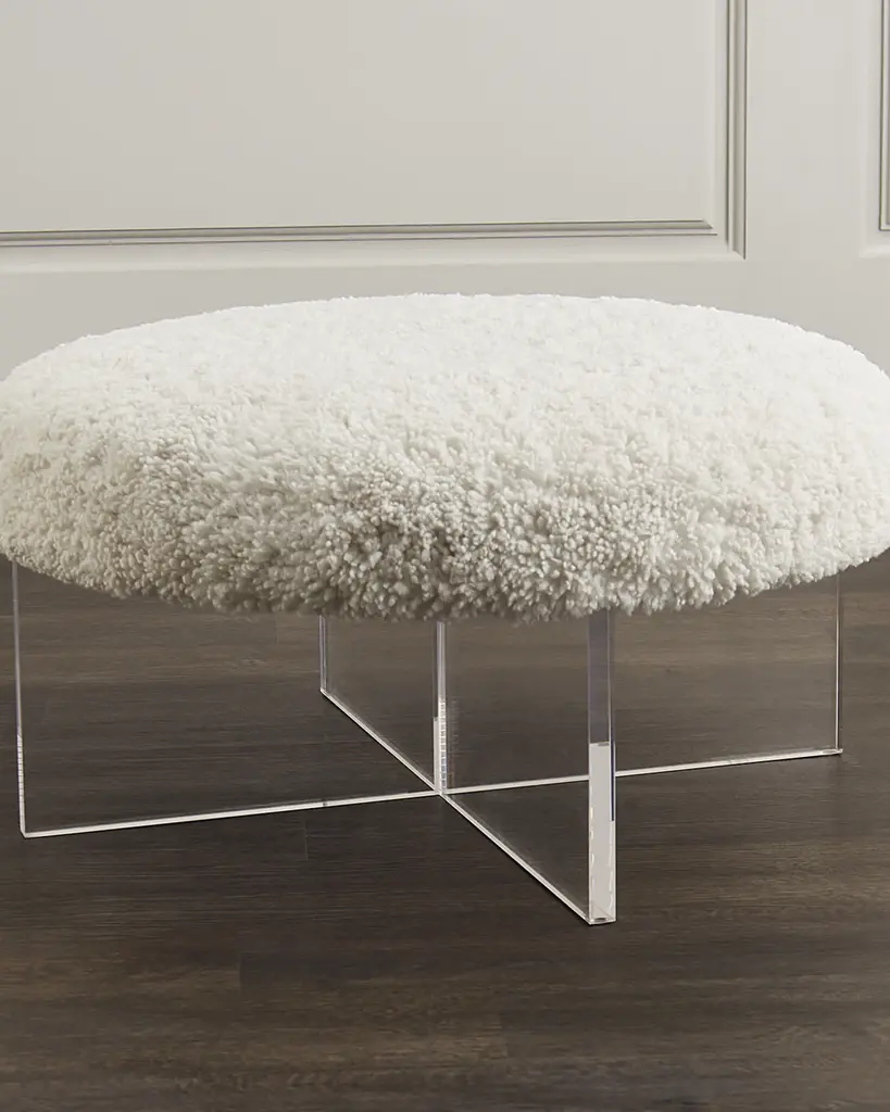 Juxtaposition at its chicest, the Jules Ottoman marries an angular, clear acrylic cross base with the luxe plushness of a winter sherpa (polyester) seat. Handcrafted of acrylic and polyester Overall, approx. 36"Dia. x 17"T Finished back Weight limit, 400 lbs Item Weight, 81.0 lbs Imported Boxed weight, approximately 90.0 lbs Shipping Direct from Vendor, usually ships within 45 business days. About Interlude Home: Interlude Home creates a harmonious blend of modern aesthetics and timeless elegance. Its meticulously crafted furniture and decor pieces reflect sophistication and versatility, allowing spaces to seamlessly transition between classic and contemporary styles. Interlude Home Co-Owners, Carl Philips and Wendy King Philips are partners in life and business. Together they travel to exotic locales including India, Vietnam, Indonesia, China, Thailand, Europe, and South America gleaning ideas and inspiration from other cultures and seeking the finest craftsmen with whom to collaborate. Carl’s global relationships and Wendy’s fashion background at W Magazine, coalesce to provide a distinctive aesthetic and resource to the world of interior design.