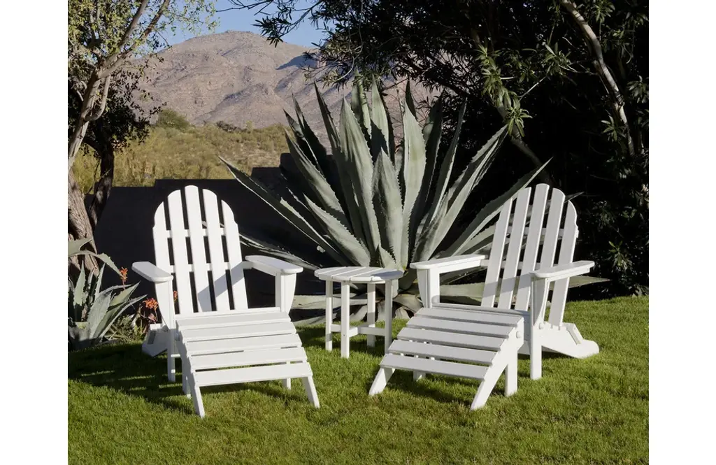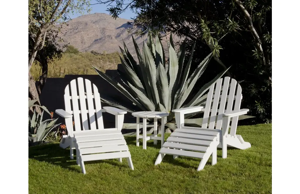 The Ivy Terrace Classics 5-Piece Folding Adirondack and Ottoman Set includes two IVAD5030 Classics Folding Adirondacks, two IVOT53 Classics Folding Ottomans and an IVRT18 18" Round Side Table. The Adirondacks and ottomans fold for easy transportation and storage, while the side table is the perfect place to rest your drinks. This set doesn't just look good, it's eco-friendly. Ivy Terrace furniture is made of All-Weather HDPE lumber which contains mostly recycled content. All-Weather HDPE lumber has the great look of painted wood but requires no painting, staining, waterproofing, or similar maintenance. Made with solid dimensional lumber and Marine-grade quality hardware, this set can withstand most anything nature throws at it. All-Weather HDPE lumber will not splinter, crack, chip, or peel. Further, coloring runs throughout the UV-stabilized plastic lumber so there is no exterior finish to wear or scratch off. You'll be able to rest easy knowing this set is stain resistant and cleans easily with soap and water. Ivy Terrace furniture boasts a 20-year warranty and is proudly made in the USA. Assembly of the Folding Adirondacks is simple and easy, only requiring the fastening of two bolts per chair. The Folding Ottomans are fully assembled, and the 18" Side Table requires minimal assembly.Includes two IVAD5030 Classics Folding Adirondacks, two IVOT53 Classics Folding Ottomans, and an IVRT18 Classics 18" Round Side TableConstructed of genuine POLYWOOD lumber, a proprietary blend of plastics which includes recycled milk jugs and detergent bottlesSolid, heavy-duty construction withstands most anything nature can throw at itUV protectant and color continuously throughout the HDPE material; requires no painting or waterproofingWill not splinter, crack, chip, peel, rot, or suffer from insect infestation.Marine-grade quality hardware20-year residential warranty; 3-year commercial warrantyResists stains and is easy to clean with soap and waterSimple and easy assemblyMade in the USA
