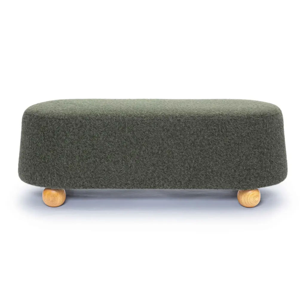 Add a playful charm to your space with the Jaine Stool, boasting a slightly conical shape that catches the eye. Its spherical solid wood legs provide a sturdy base, while the nubby boucle (available in chocolate brown, cream, or forest green) or loose faux mohair (available in forest green and stone grey) upholsteries add a modern, textured touch. Not only is it on-trend with its color palette, but this ottoman also seamlessly blends contemporary style with a tactile experience, making it a must-have for any room. Also available in two size variations!