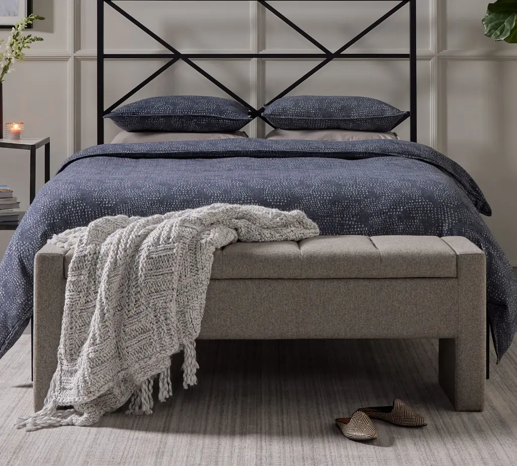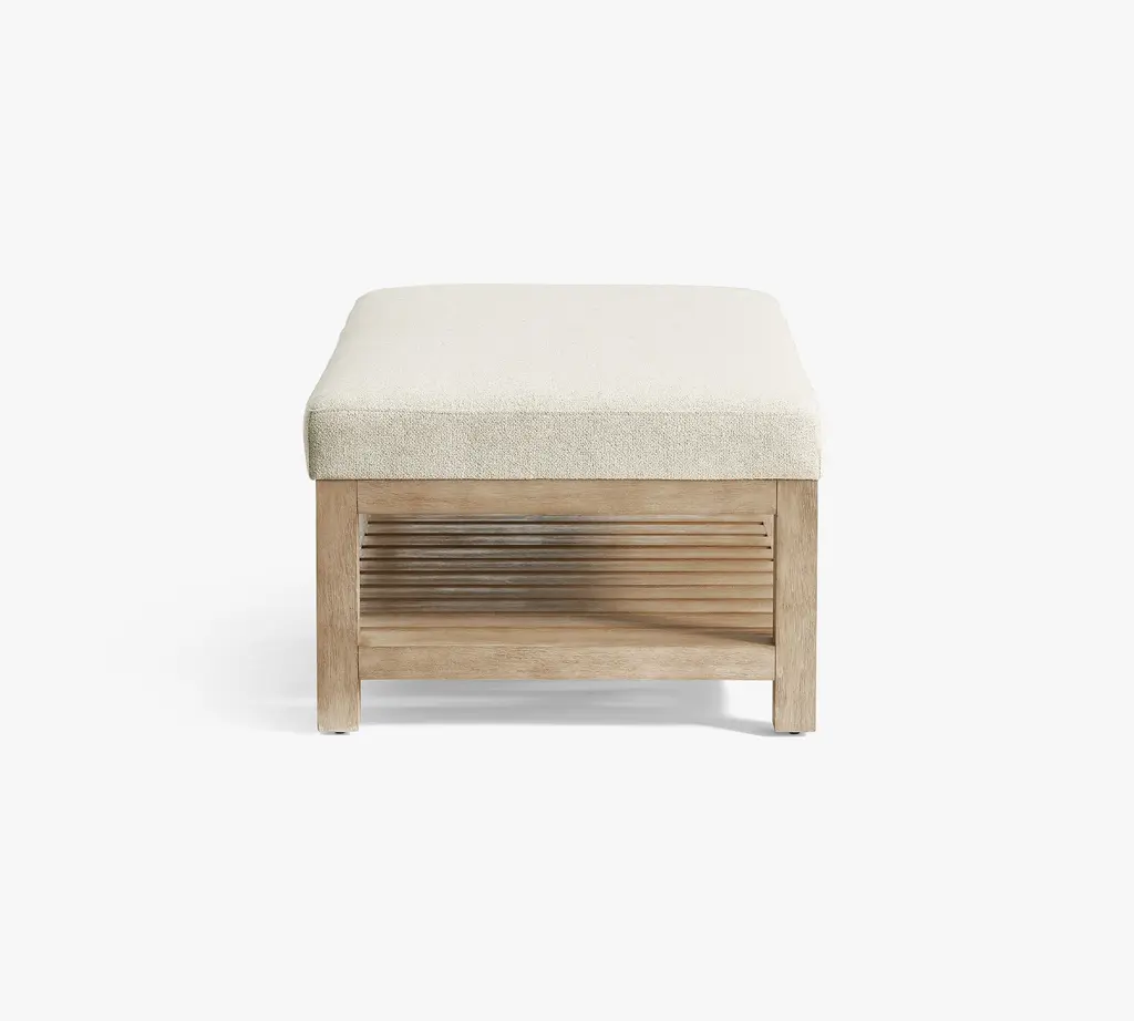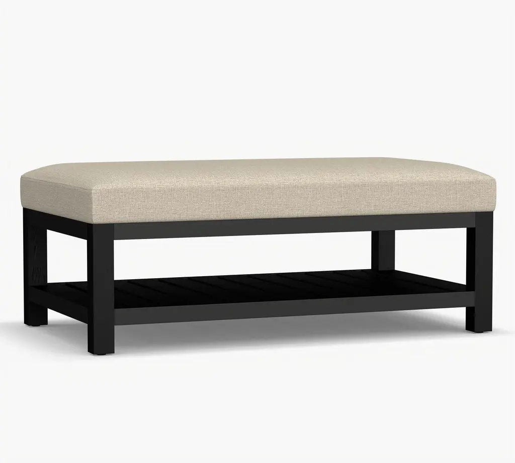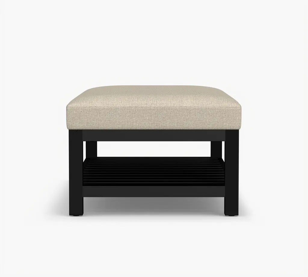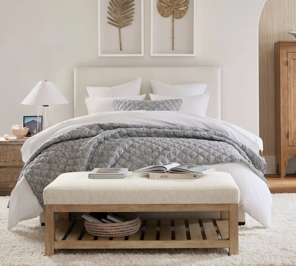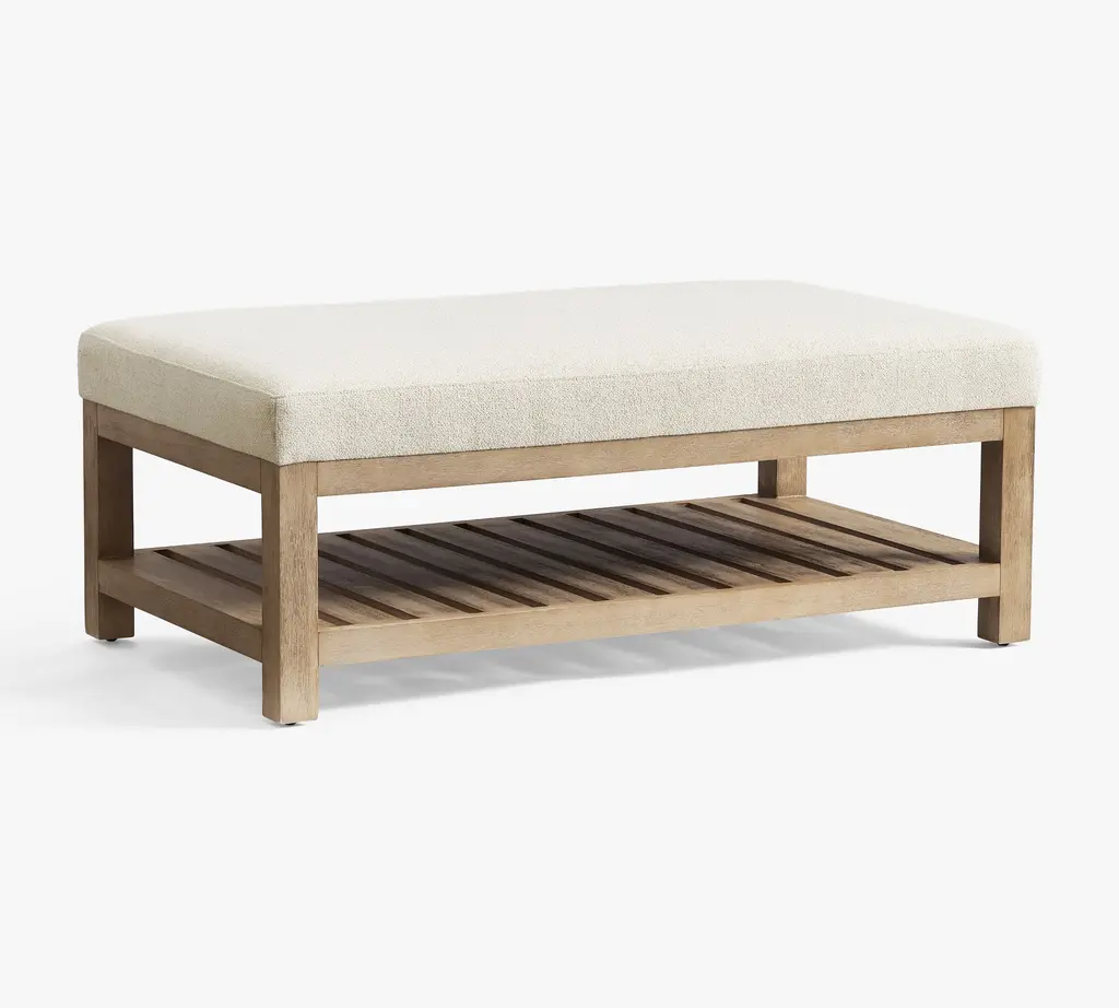 Superb comfort meets a simplified silhouette for a look that's as refined as it is laid back. Covered in your choice of fabric, this ottoman is perfect for placing at the end of a bed – it doubles as seating and a coffee table you can use to kick up your feet. The slatted shelf is perfectly sized for books, board games, throws, and more.