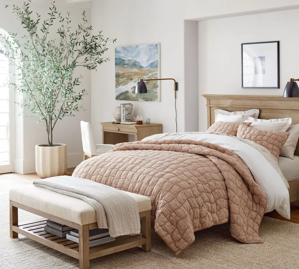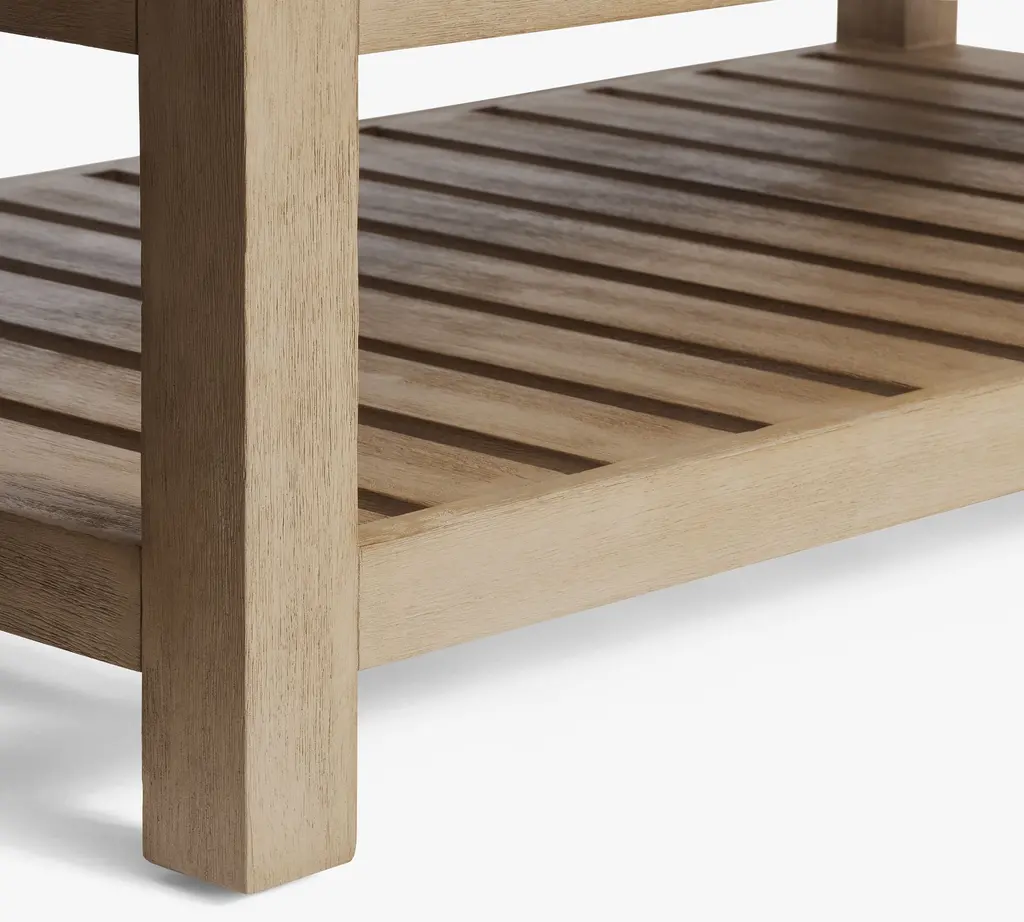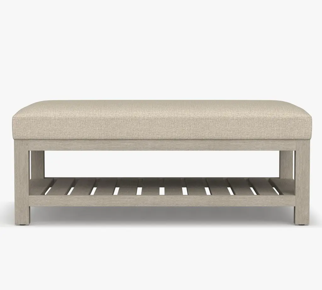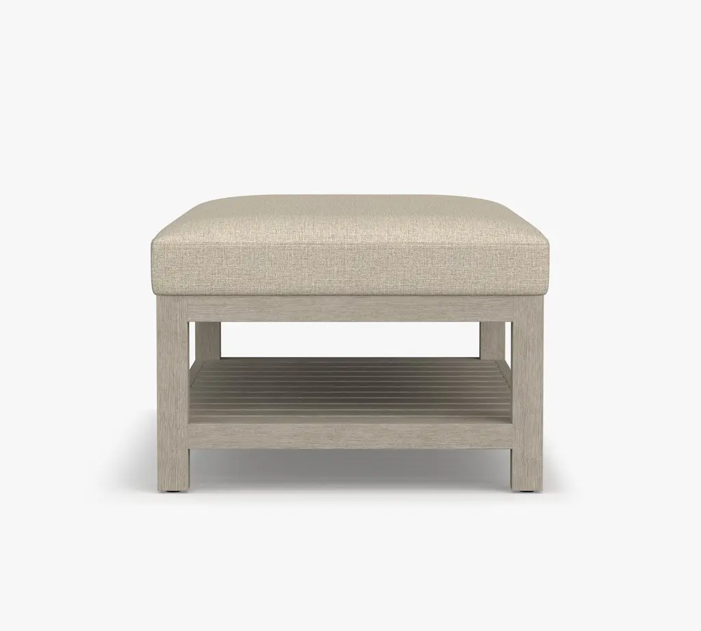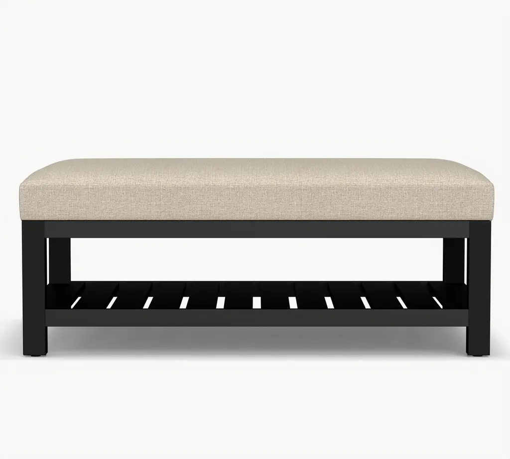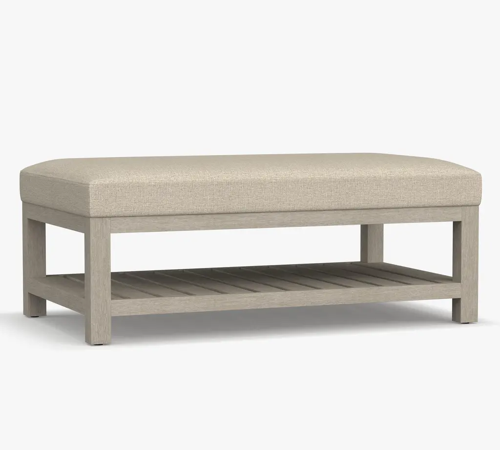 Superb comfort meets a simplified silhouette for a look that's as refined as it is laid back. Covered in your choice of fabric, this ottoman is perfect for placing at the end of a bed – it doubles as seating and a coffee table you can use to kick up your feet. The slatted shelf is perfectly sized for books, board games, throws, and more.