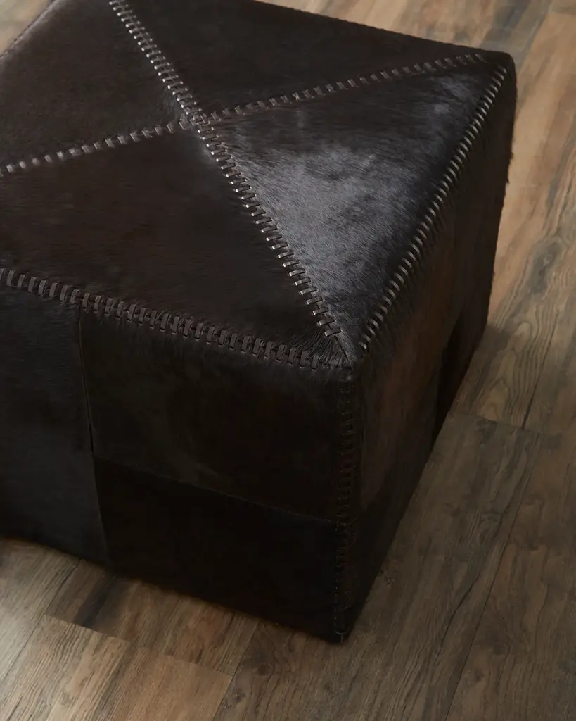 Kick up your heels on the Large Ottoman with leather stitching. Upholstered in smooth high-quality leather hide, this ottoman has a dark and moody design that is amplified with incredibly luxurious materials. The panels of this piece are stitched together with contrast leather thread to give this piece a more angular shape. Dyed ox hair hide (India). Natural color variation will occur in hide. Handcrafted construction. Weight capacity: 330 lbs. Stapled. Overall: 24"Sq. x 18"T. Imported. Boxed weight, approximately 31 lbs. About Jamie Young: In 1997, Jamie Young Jeter and David Jeter took a day trip to Mexico, where they filled their car trunk with gardening pots they discovered in a roadside shop. When they returned to Los Angeles, they promptly sold the entire haul to a local florist. Recognizing an under-served market, the two artists began to design and produce their own line of interesting flower pots, only to discover that the rustic, handcrafted quality of the pieces would make unusual bases for lamps—thus the Jamie Young Company was born.