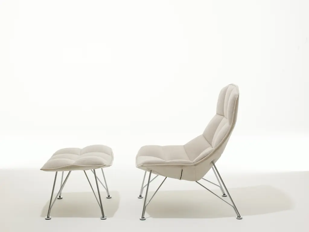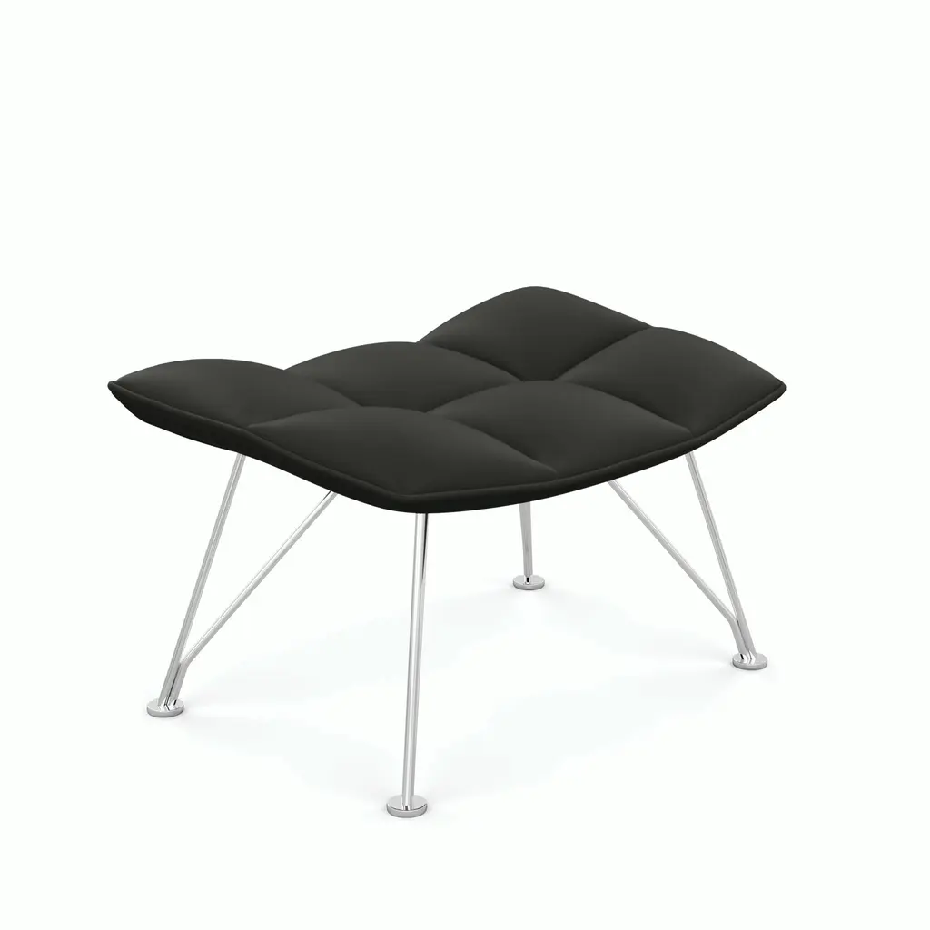 The Jehs + Laub Ottoman complements the sweeping form of the Lounge Chair and features the same wire base and quilting-inspired geometric upholstery.
