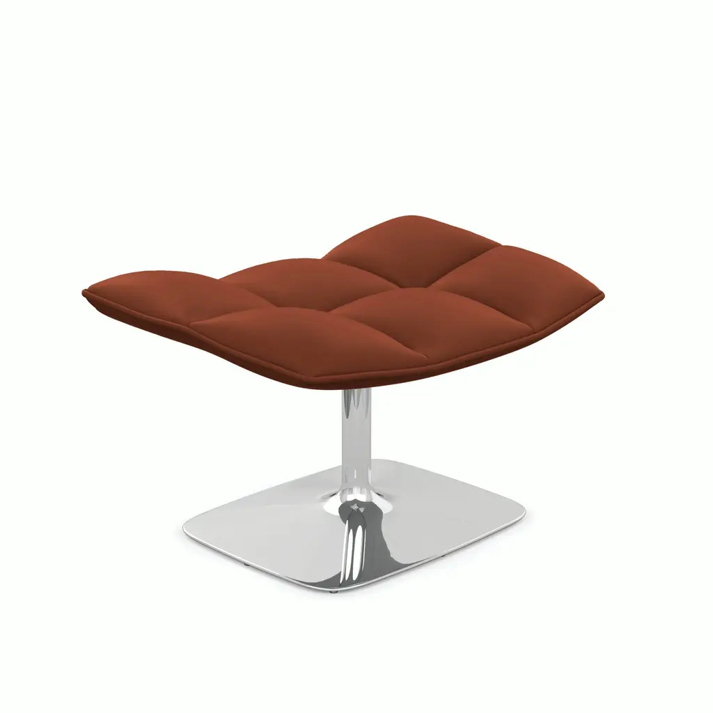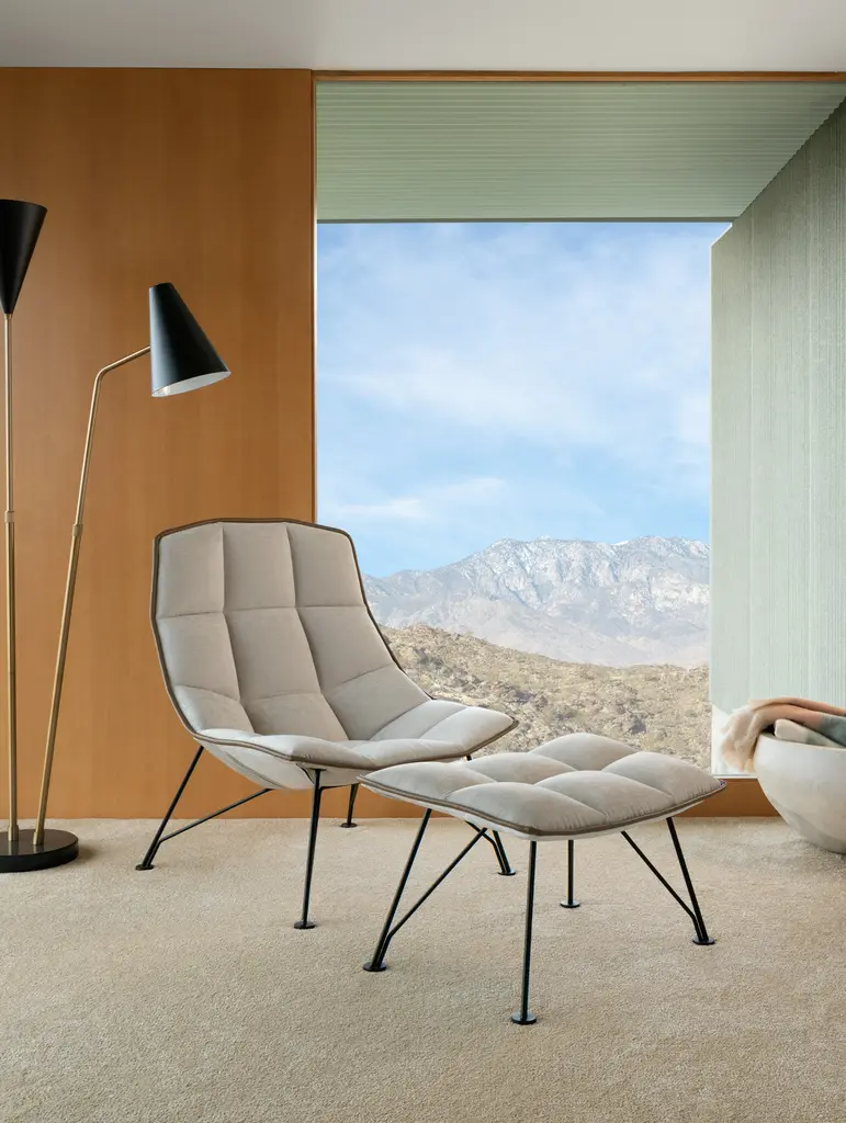 The Jehs + Laub Ottoman complements the sweeping form of the Lounge Chair and features the same wire base and quilting-inspired geometric upholstery.