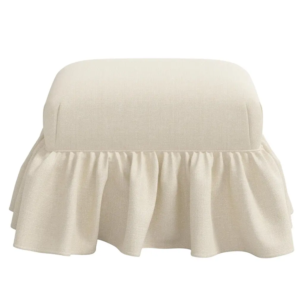 Introducing the June Ottoman, a truly unique piece with its distinctive ruffled bottom. Combining vintage charm with a modern twist, this ottoman exudes a cozy and nostalgic feel. Whether paired with your favorite chair, used as a small side table, or placed at the foot of your bed, it adds a special touch to any space. Fully upholstered in one fabric for a cohesive appearance, this understated yet eye-catching piece will effortlessly complement any decor. Exclusively available from the Stoffer Home crafted by Cloth & Company collection.