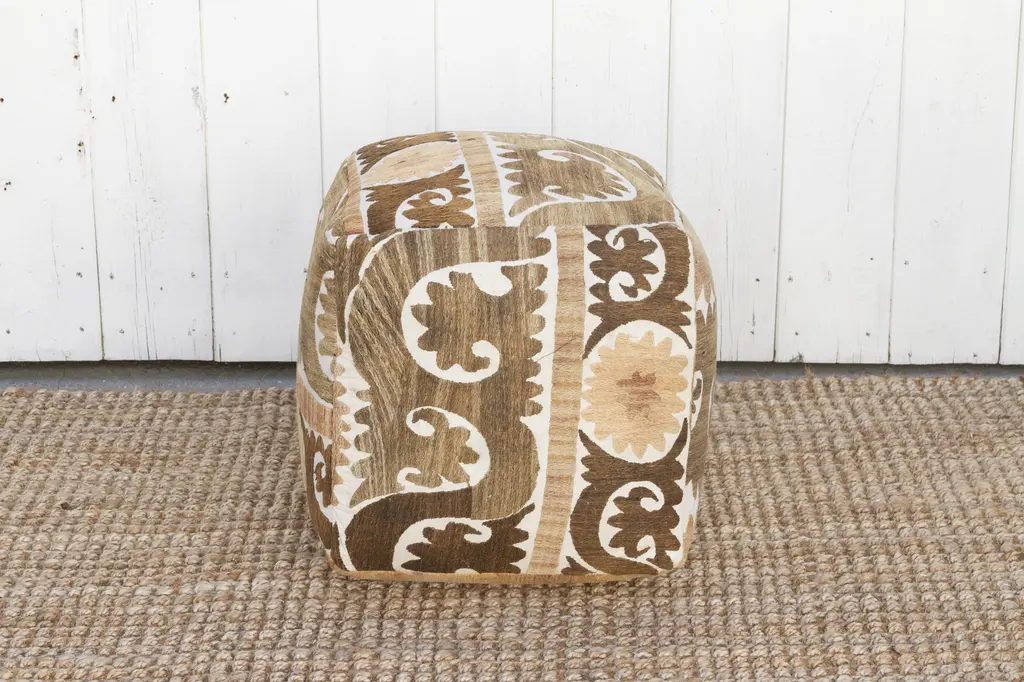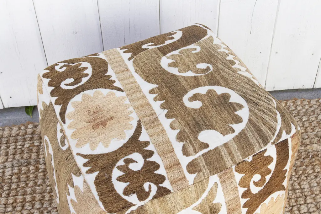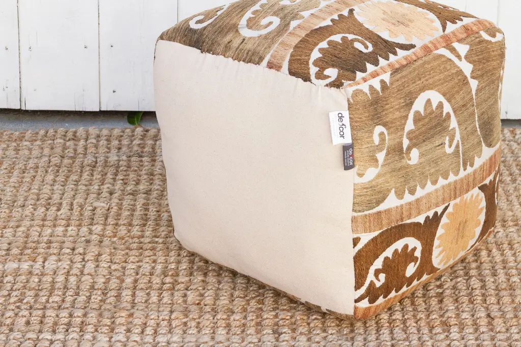 Our collection of Suzani ottomans offers a unique way to incorporate timeless beauty into your home. Suzani embroidery, traditionally crafted by women to adorn their homes and celebrate special occasions, is a breathtaking art form. We breathe new life into antique Suzani tapestries by transforming them into stunning square ottomans showing designs on all sides, with a durable base. Each piece boasts captivating, hand-stitched artistry featuring vibrant floral, leaf, and vine motifs.