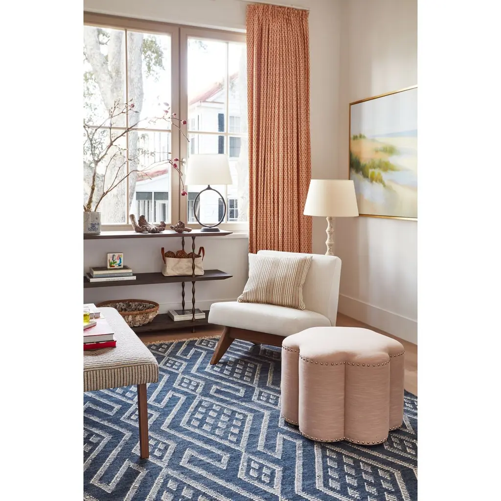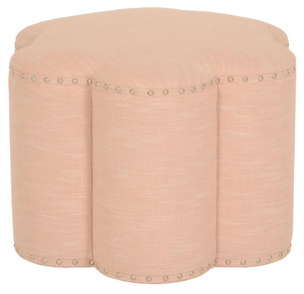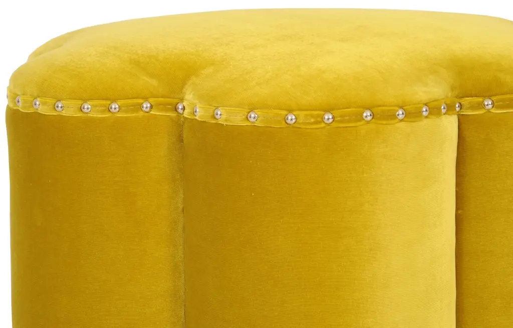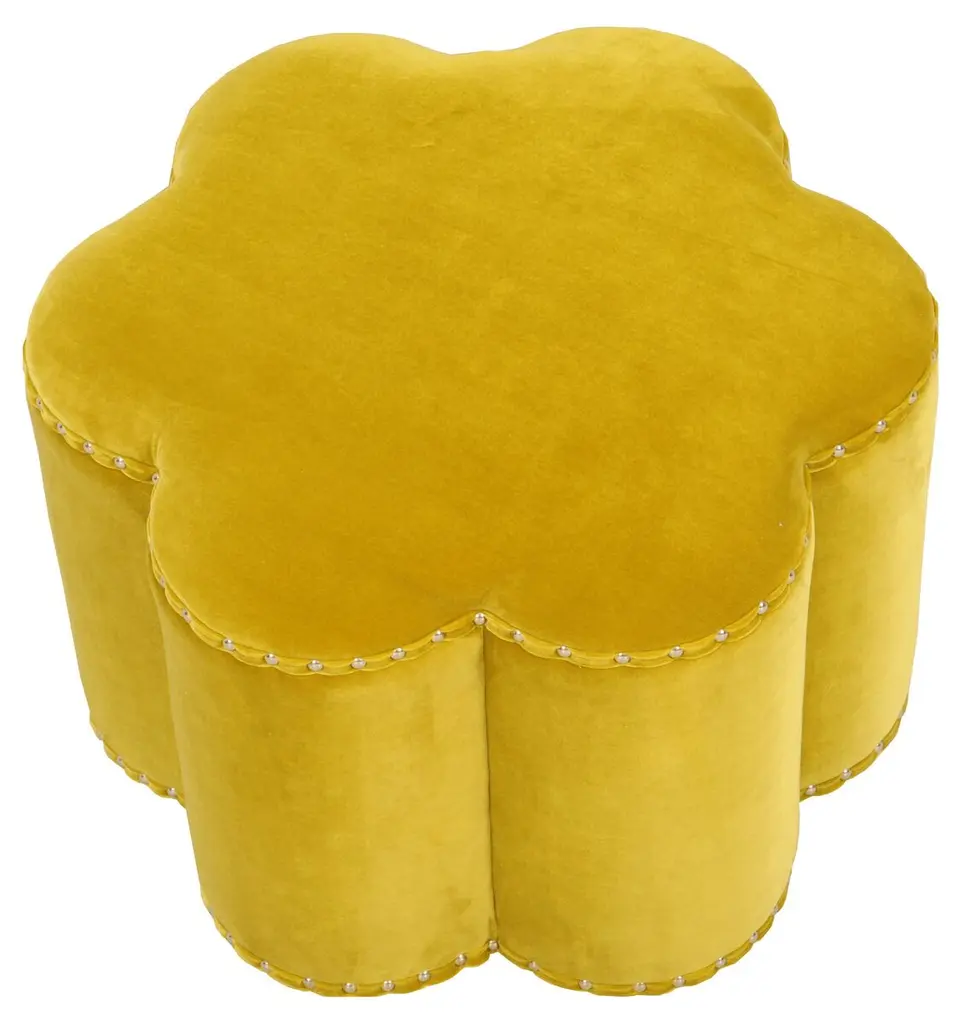 Destined to make a statement, this whimsical ottoman boasts velvet upholstery and decorative nailheads bolstered to scalloped hardwood framework. Generous foam-and-fiber padding ensures long-lasting comfort and support.
