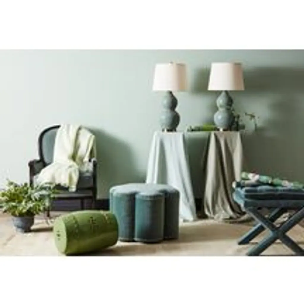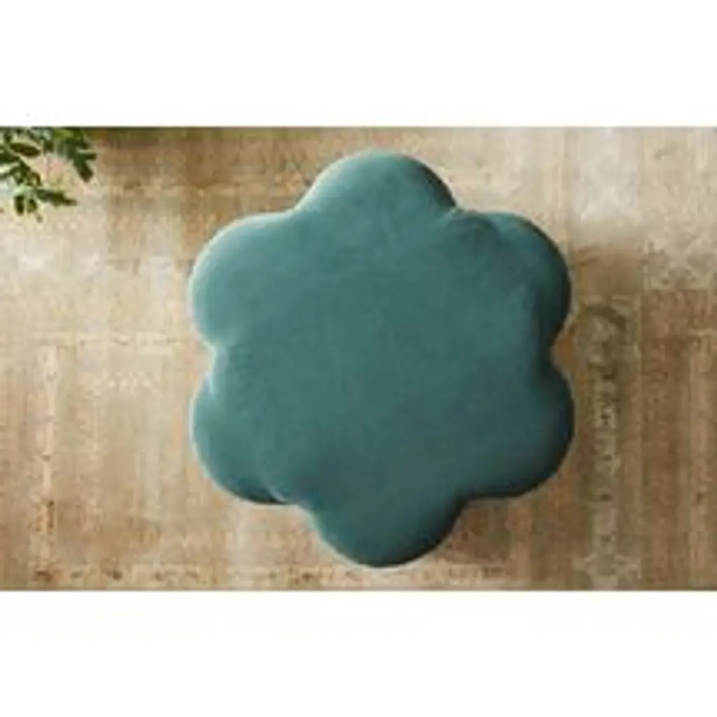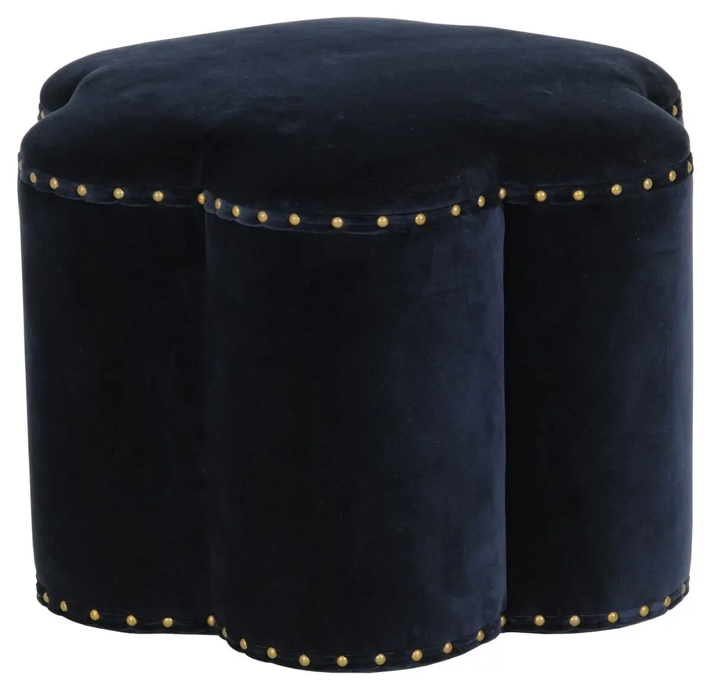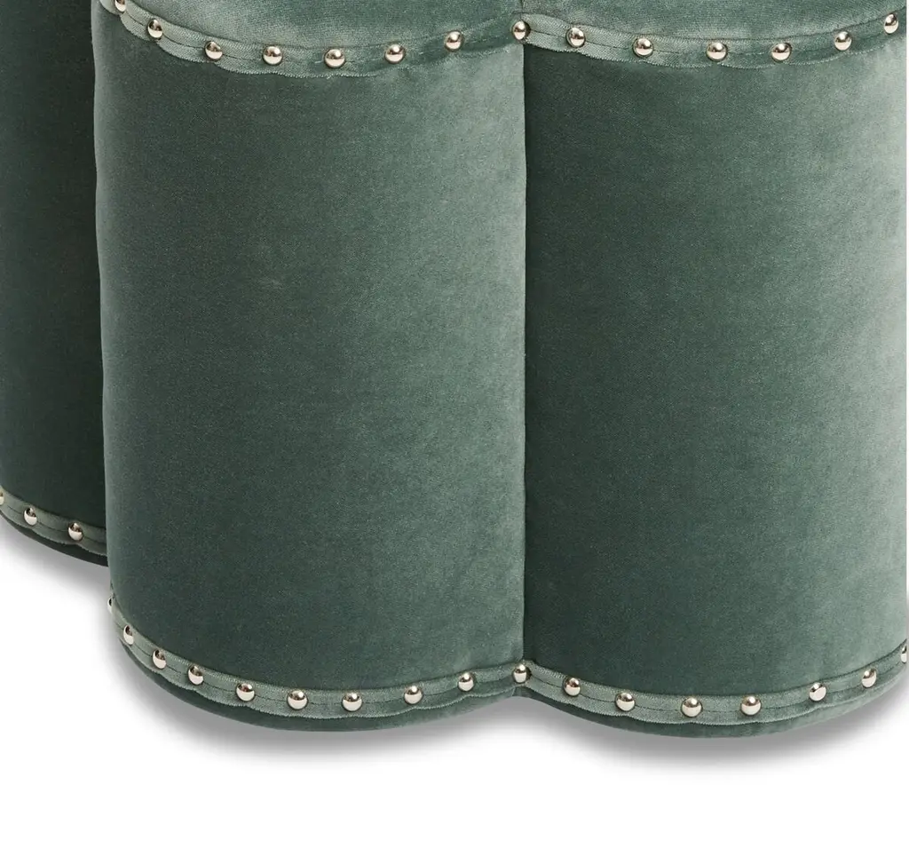 Destined to make a statement, this whimsical ottoman boasts velvet upholstery and decorative nailheads bolstered to scalloped hardwood framework. Generous foam-and-fiber padding ensures long-lasting comfort and support.