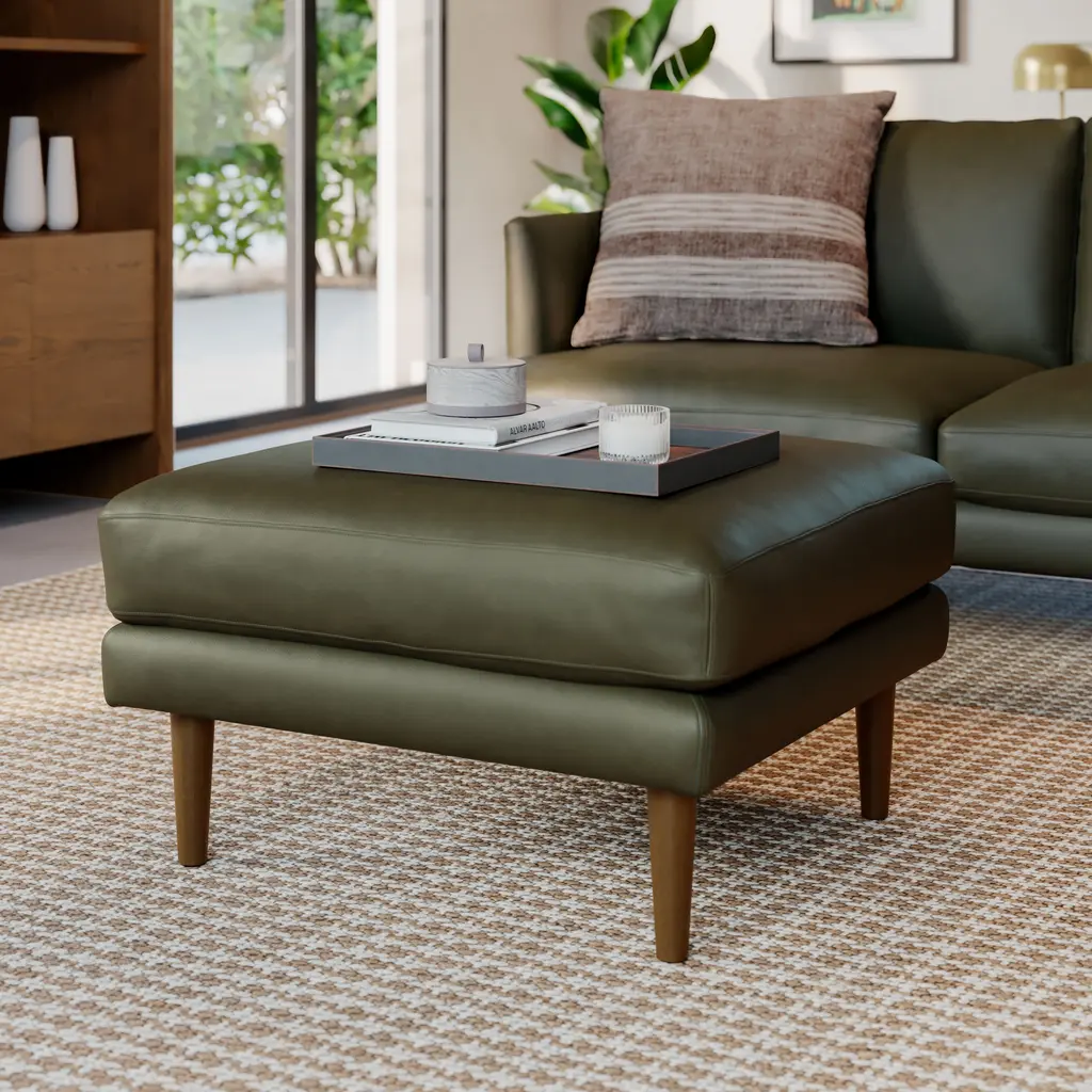 Bringing functionality with a high dose of style to your living room, our Katrina cocktail ottoman provides you with a convenient surface to prop up your feet or a place to corral your remotes and coasters in a decorative tray. Upholstered in supple, 100% top-grain leather, this cocktail ottoman features tapered feet and topstitching that adds an elegant look.