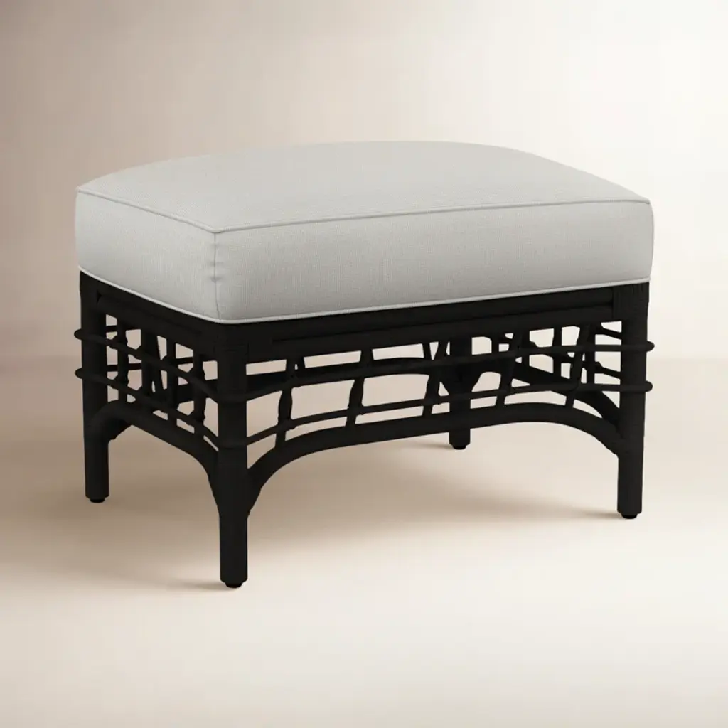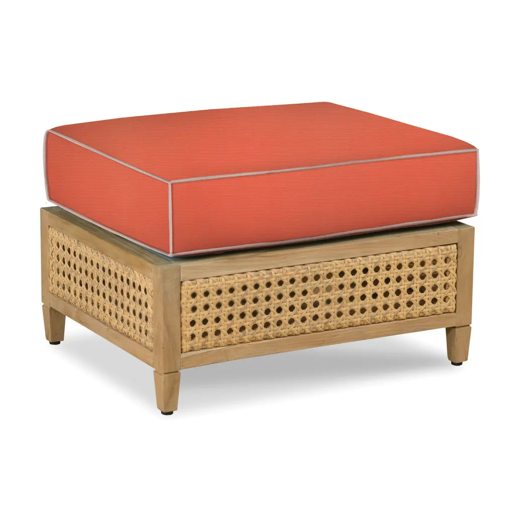 Please note this is a made to order item with a 8-10 week lead time. This classic design features a teak frame with woven powder coated aluminum cane. Upholstered in Sunbrella Canvas Melon with Blush welt.