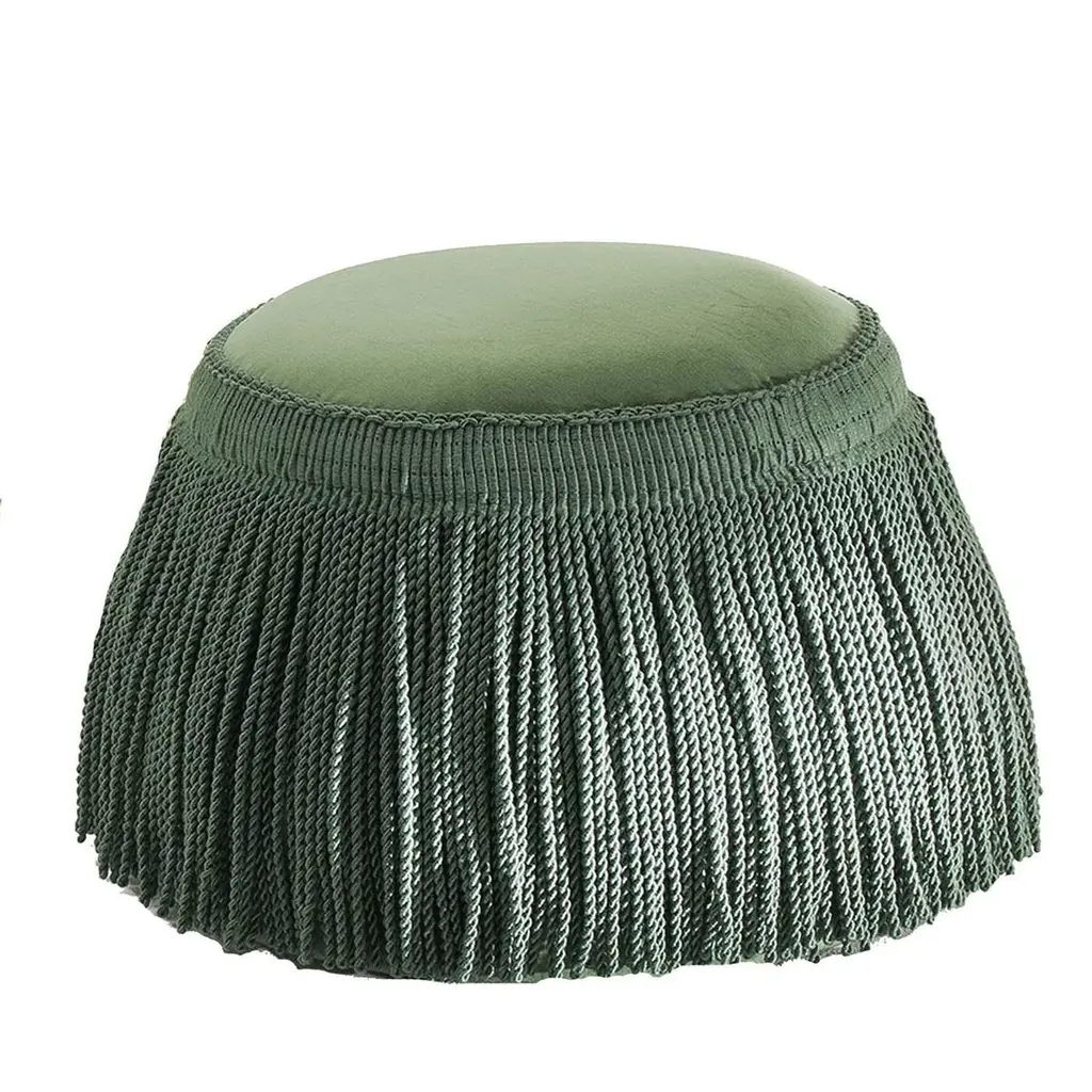 A superb piece of functional decor, this ottoman can be a footrest or an extra seat in a living room or private study. Its exquisite craftsmanship and timeless design make it a stunning addition to both a Classic and a contemporary interior. The conical shape is entirely covered in an elegant green velvet cover, including the generous round top and the sides, adorned with a myriad of long fringes that add a striking texture and dynamic effect to the piece.