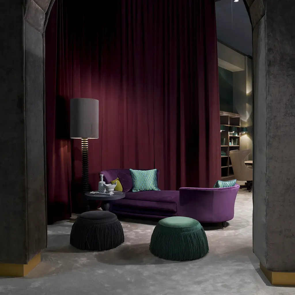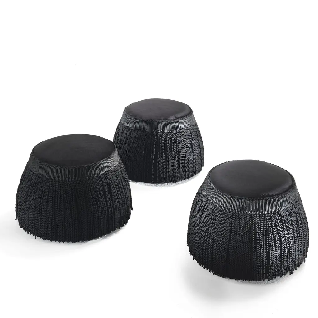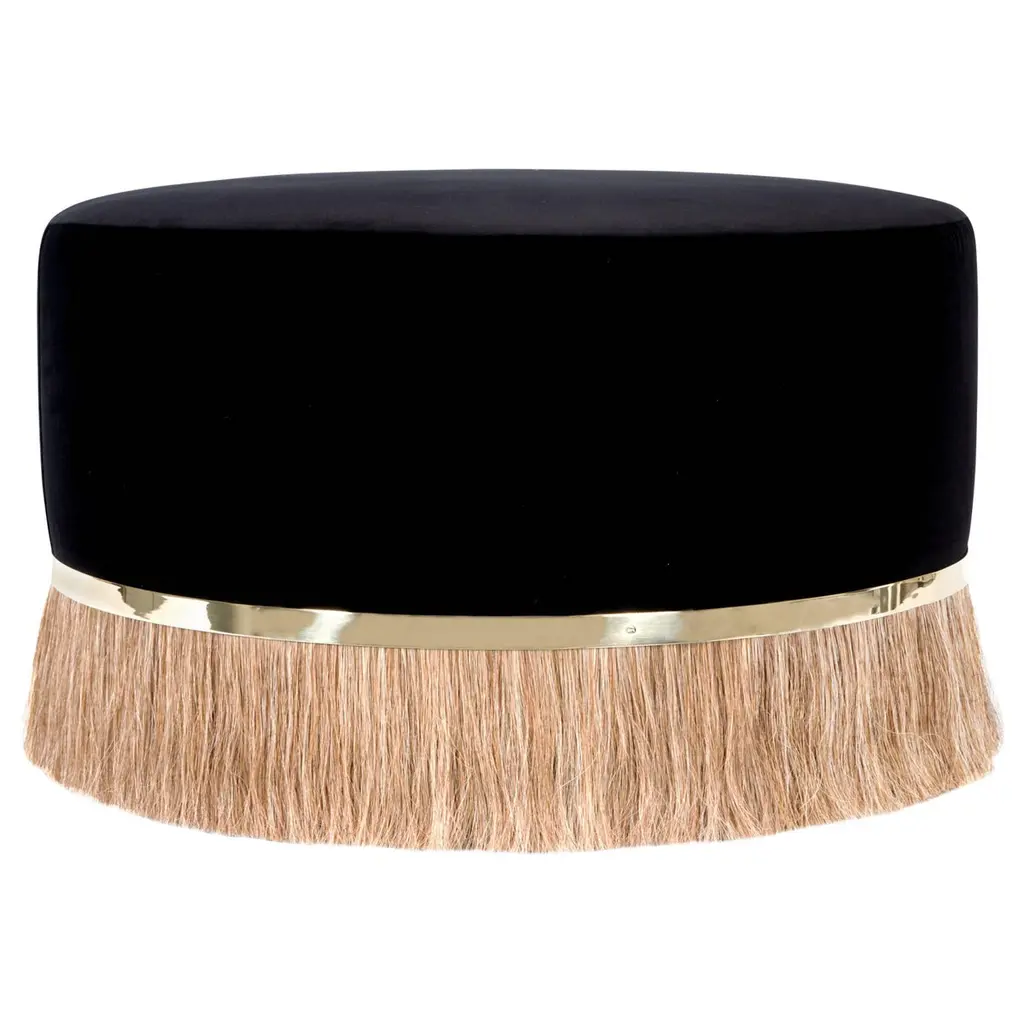 Elevate your space with the Kir Royal Footstool, a delightful creation by designer Christophe de la Fontaine. This footstool showcases an intriguing blend of irony and opulence, characterized by its lavish trimming and fringe. With a wooden structure, plush padding, and luxurious black velvet upholstery, it embodies a fusion of contemporary style, reminiscent of elegant curtain tassels. Add a touch of timeless charm to your living space with the Kir Royal Footstool's exquisite detailing.