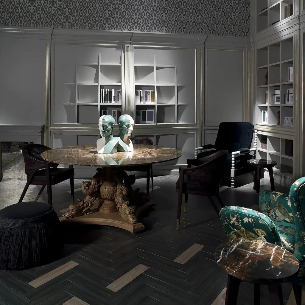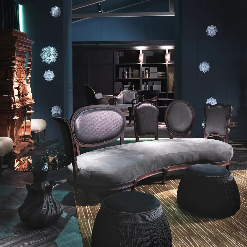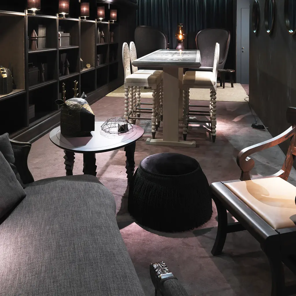 Elevate your space with the Kir Royal Footstool, a delightful creation by designer Christophe de la Fontaine. This footstool showcases an intriguing blend of irony and opulence, characterized by its lavish trimming and fringe. With a wooden structure, plush padding, and luxurious black velvet upholstery, it embodies a fusion of contemporary style, reminiscent of elegant curtain tassels. Add a touch of timeless charm to your living space with the Kir Royal Footstool's exquisite detailing.