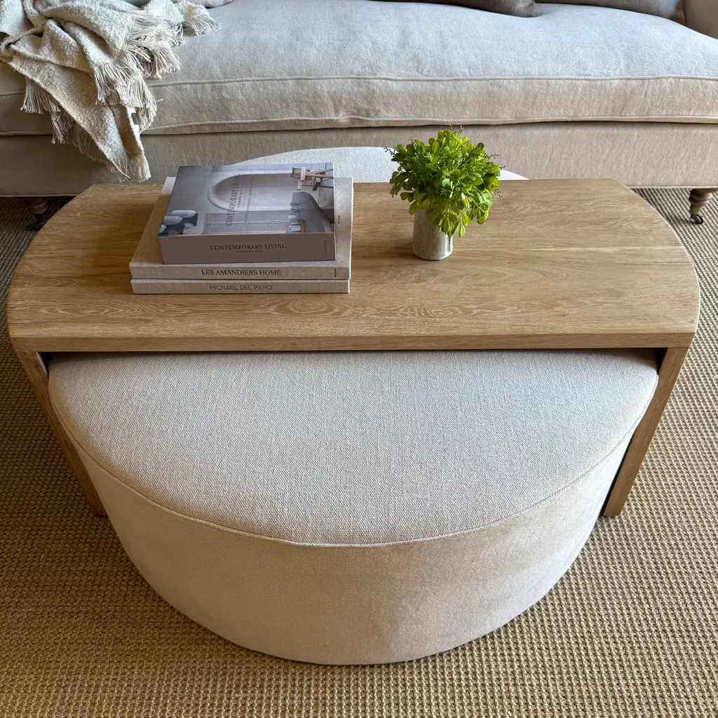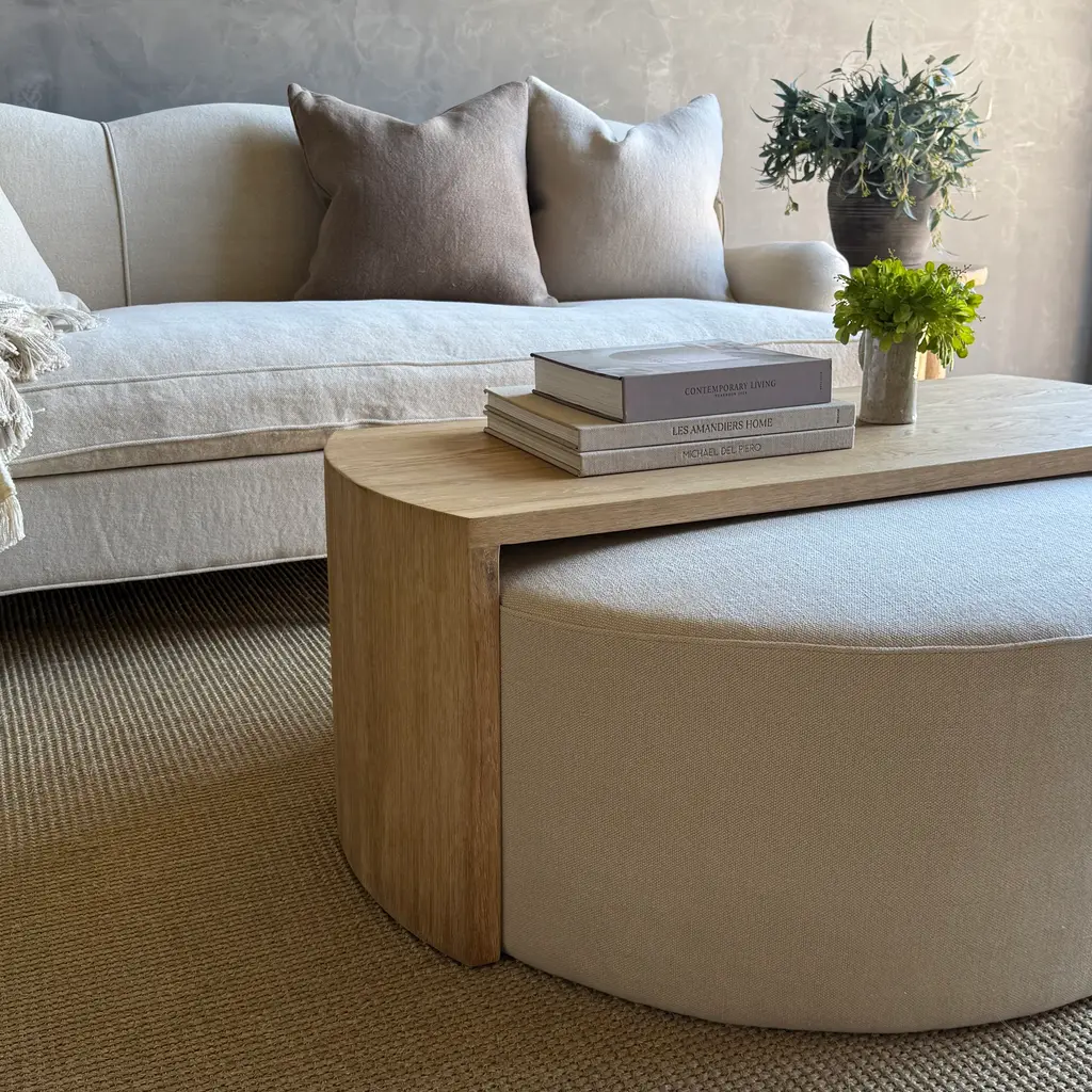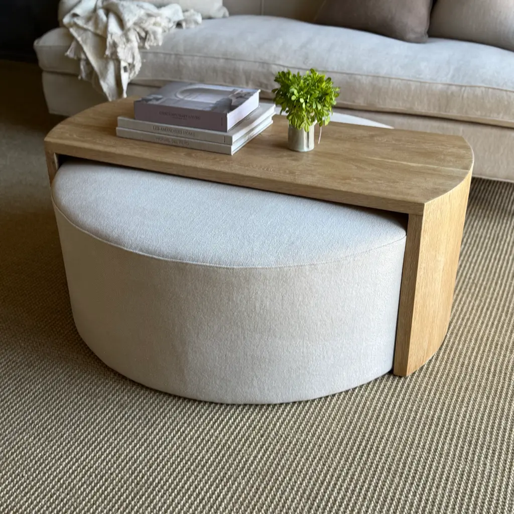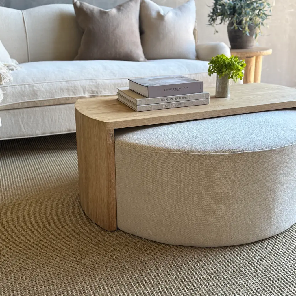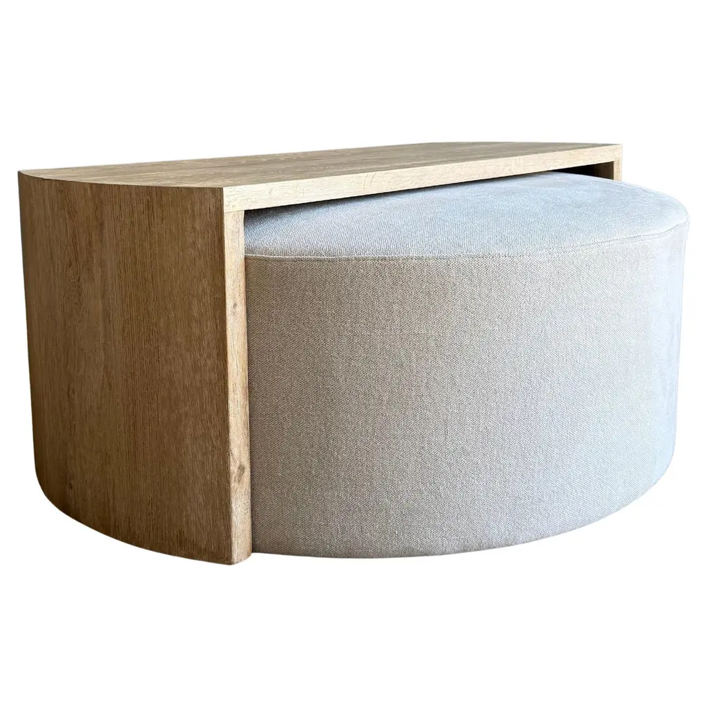 Laguna Round Ottoman With White Oak Waterfall Style Table