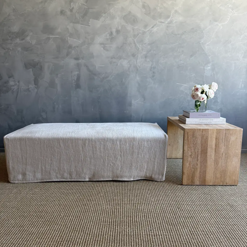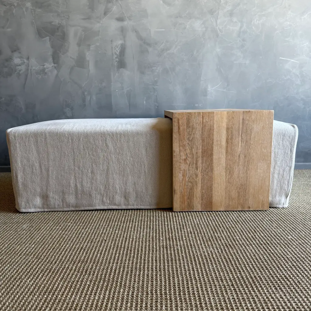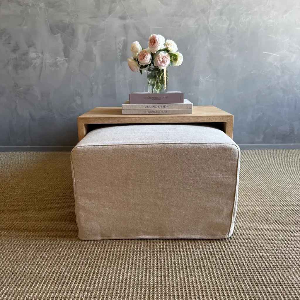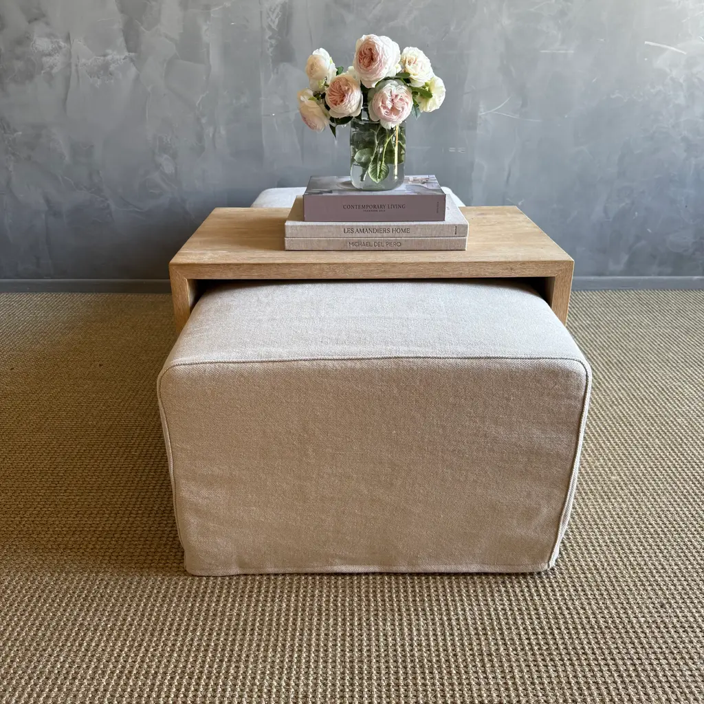 Laguna Slip Covered Ottoman With White Oak Waterfall Style Table